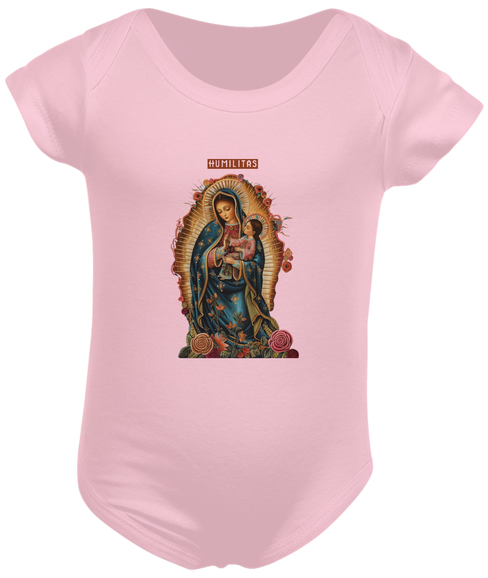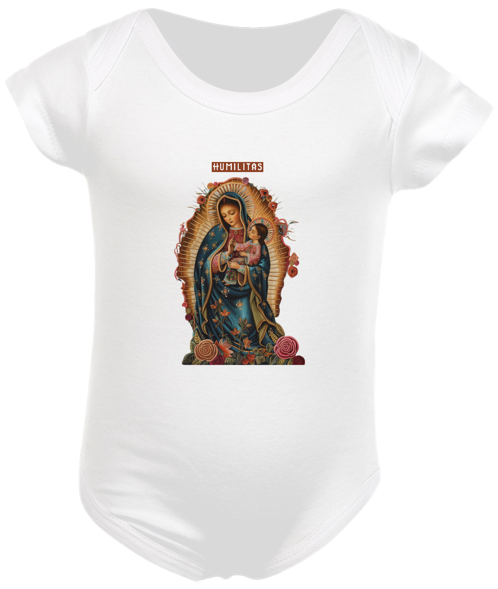 Envolva-se com a graça e a proteção de Nossa Senhora de Guadalupe com body infantil exclusivo da Marca Humilitas Cloth. Cada detalhe da estampa celebra a beleza e a devoção à padroeira das Américas, criando uma peça de vestuário que une fé e elegância.