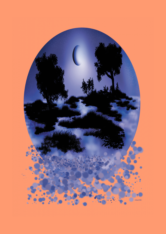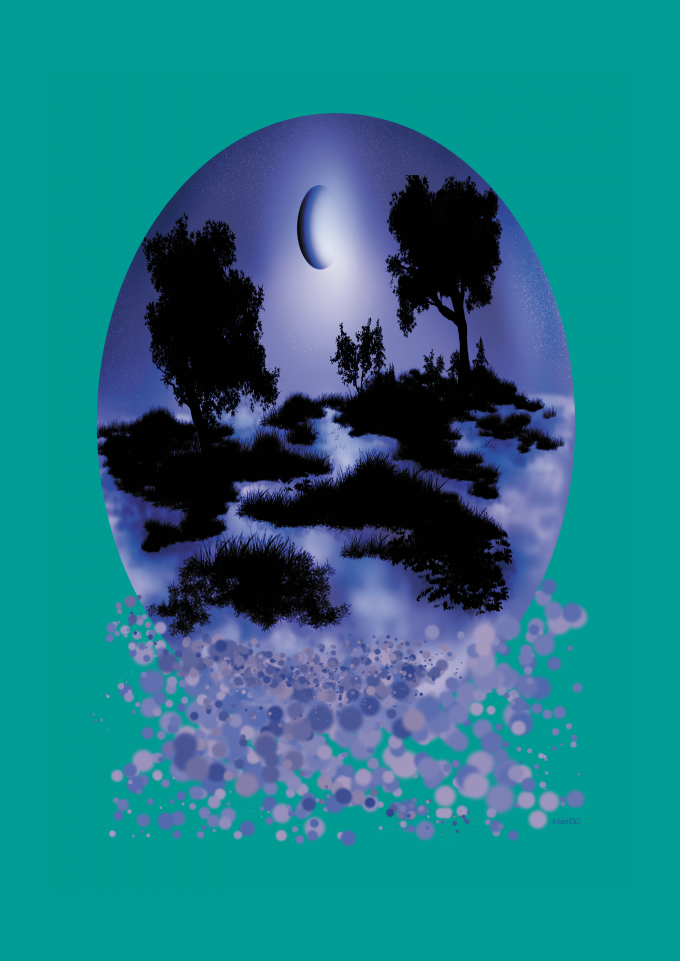 In Avanti RMC . Estampa feita por Mateus Camisote : Bolha . Elementos : bolhas , lua , vegetação , natureza . Cores da estampa : preto , azul , roxo , lilás e branco . Disponível em todas as cores .