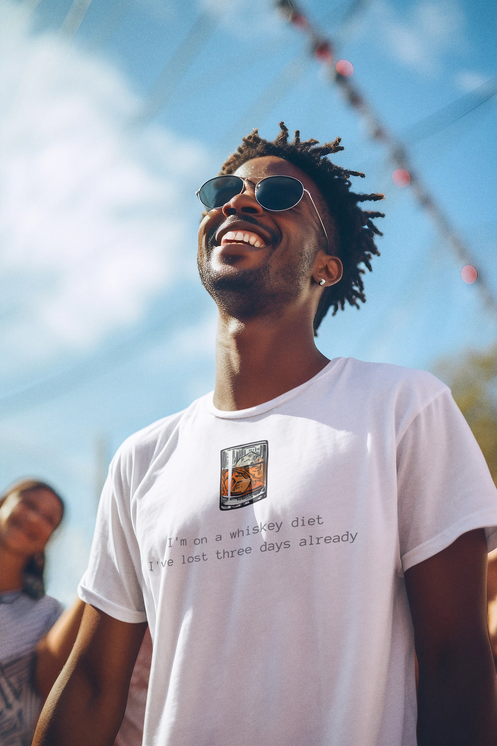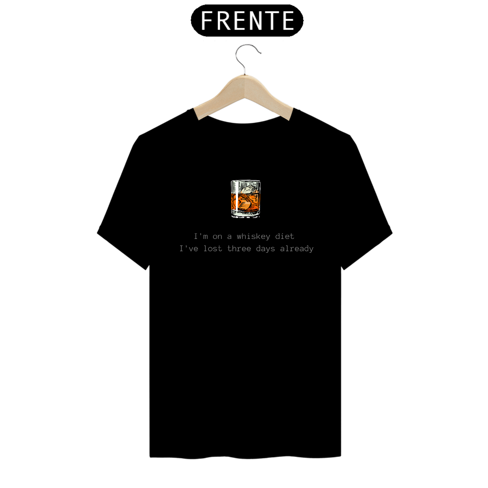 Quebre as regras da dieta com estilo! Nossa camiseta, estampada com um copo de whisky, diz tudo. Leve a descontração para o guarda-roupa e faça uma declaração de ousadia com esta peça única.