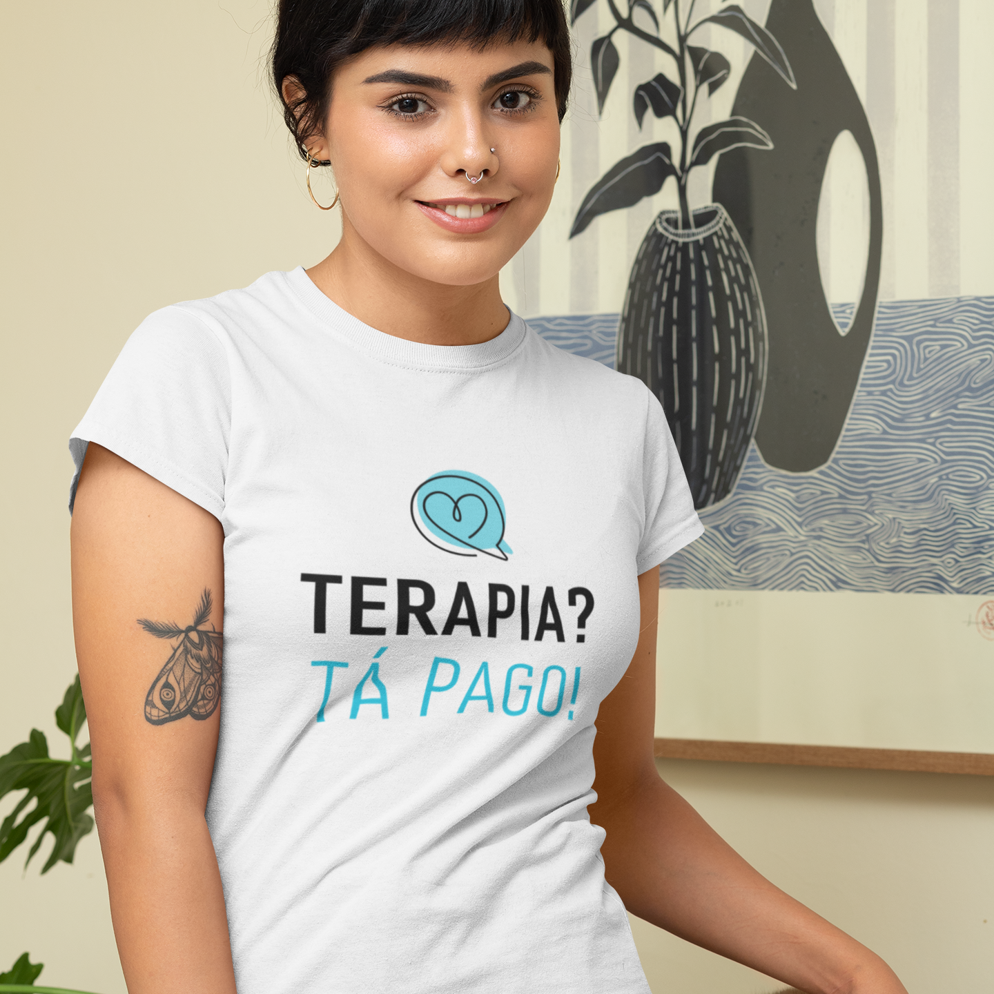 A camiseta terapia terapia? tá pago modelo baby long chegou com um toque de humor para lembrar que cuidar da saúde mental é coisa séria. Vista e espalhe essa mensagem com leveza.