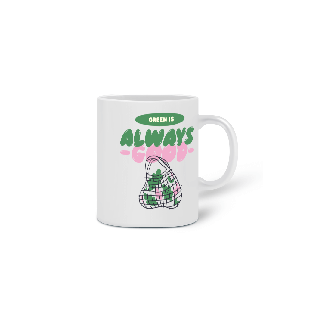 Desfrute do seu café da manhã, tarde ou noite com a xícara "GREEN IS ALWAYS GOOD" e celebre um estilo de vida vegano com cada gole.