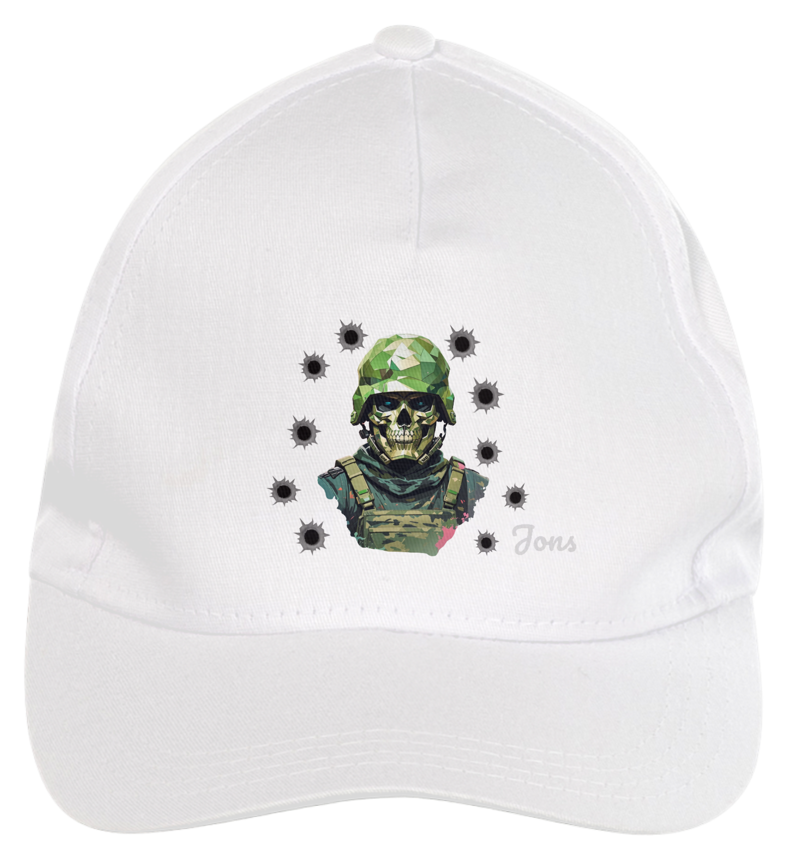 Boné americano com transfer frontal em alta qualidade, aba curva e fecho em tira totalmente regulável com pinos. O modelo veste tamanho "único".