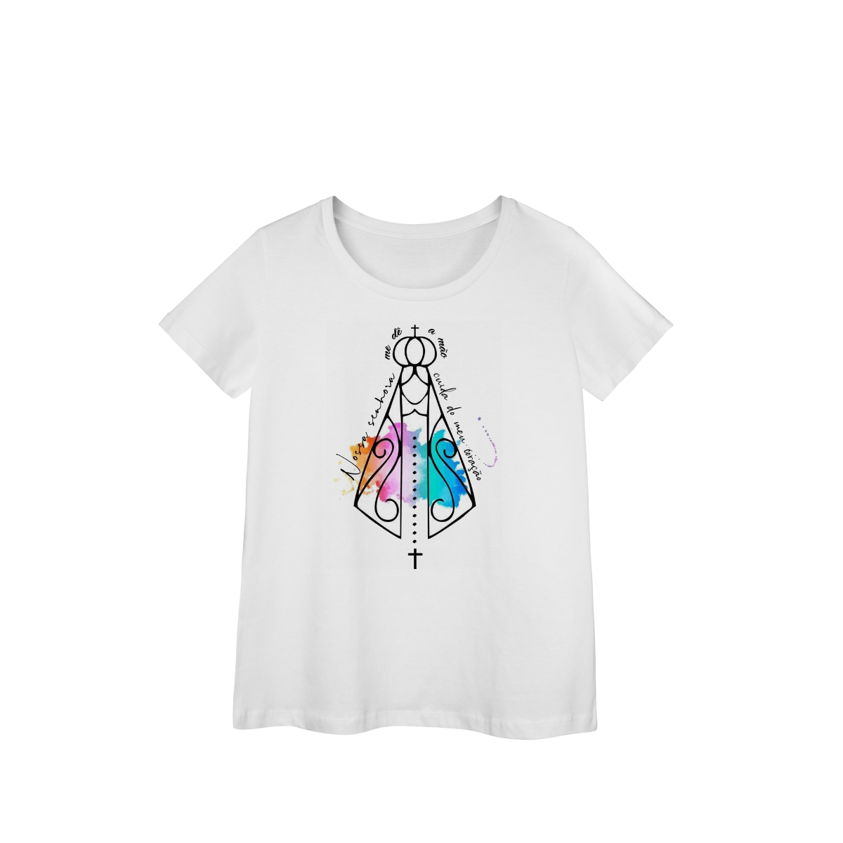 Moderna, feminina e cheia de significado. A arte de Nossa Senhora com elementos de aquarela simboliza fé e proteção, combinando com a leveza e o caimento da modelagem alongada. Ideal para quem quer vestir espiritualidade com estilo.