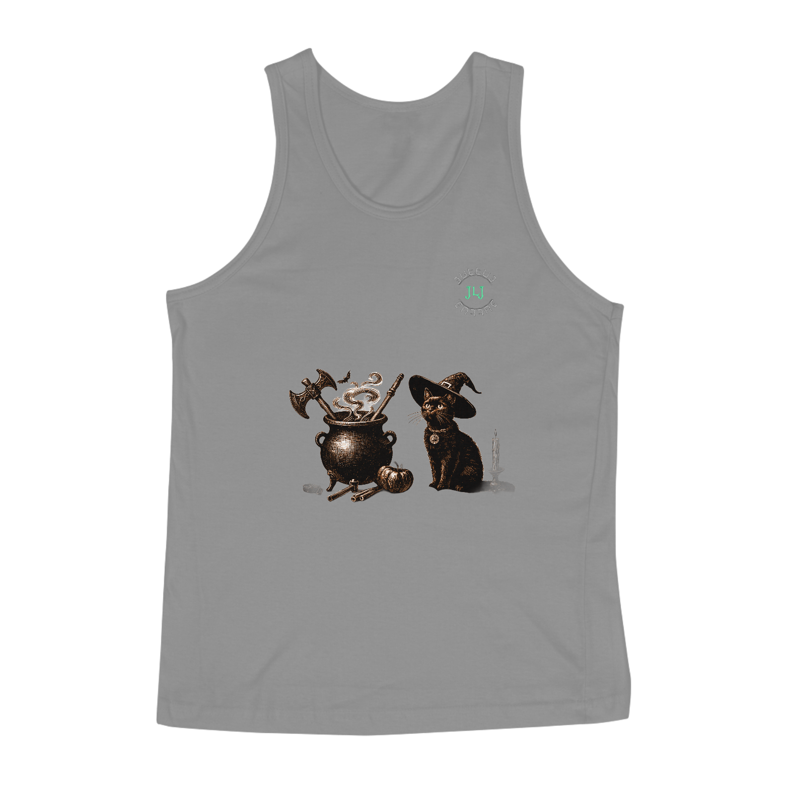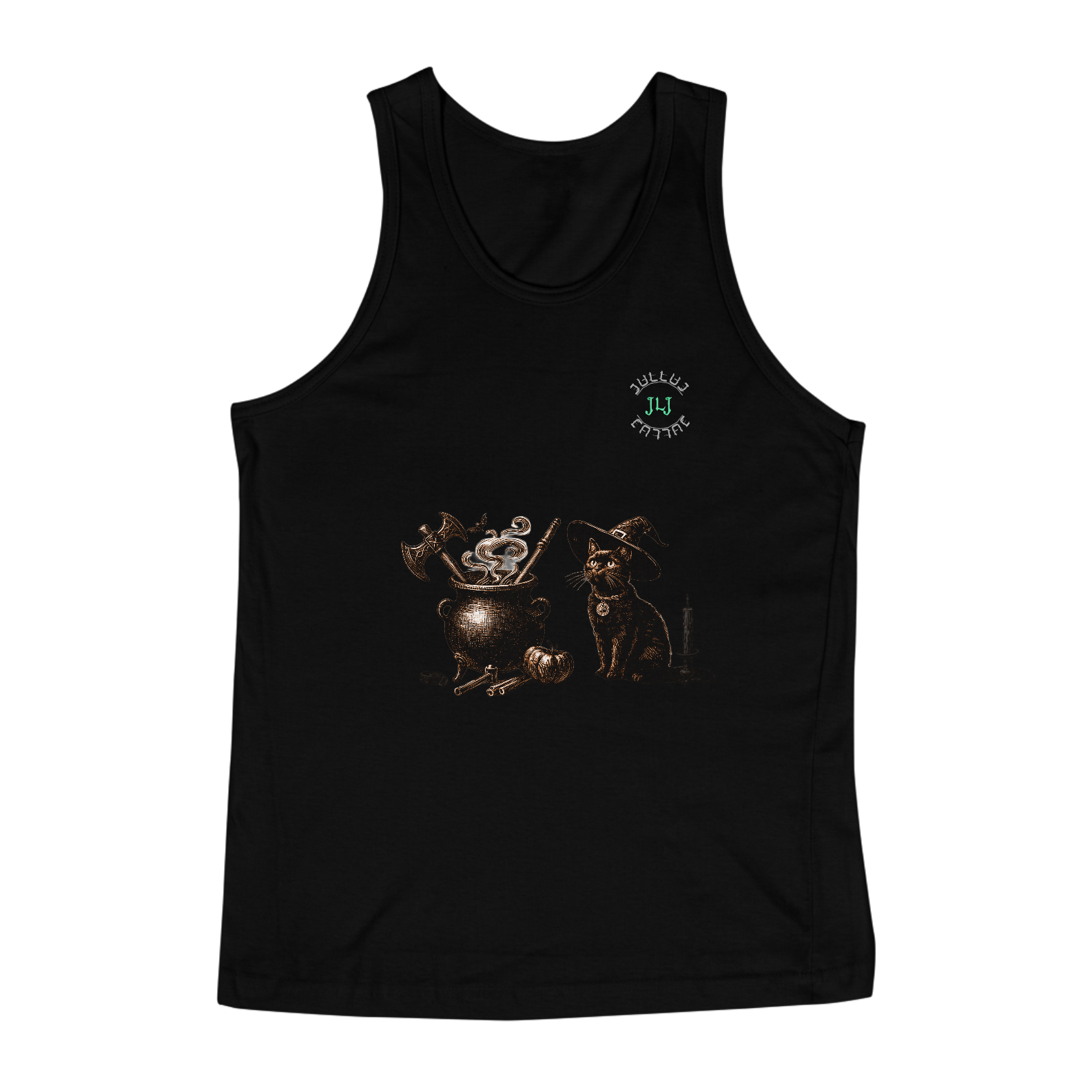 Adicione um toque de magia ao seu guarda-roupa com nossa regata exclusiva, inspirada no estilo witchy. Feita de algodão macio e respirável, esta peça apresenta uma charmosa estampa de um caldeirão borbulhante ao lado de um adorável gatinho, ambos envoltos em um ar de mistério e encanto.