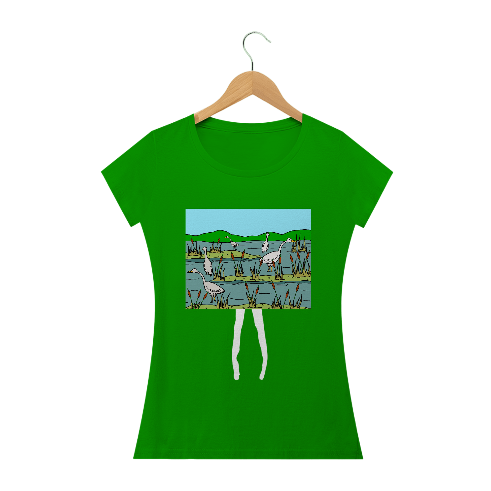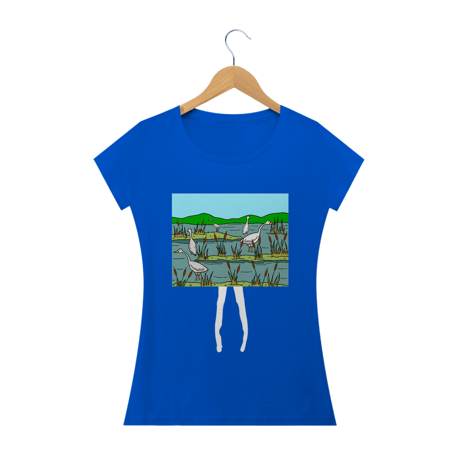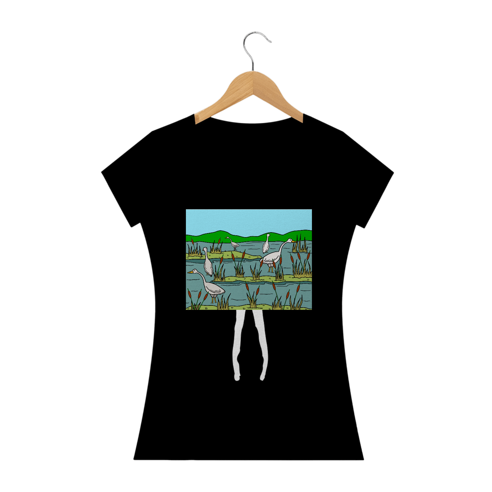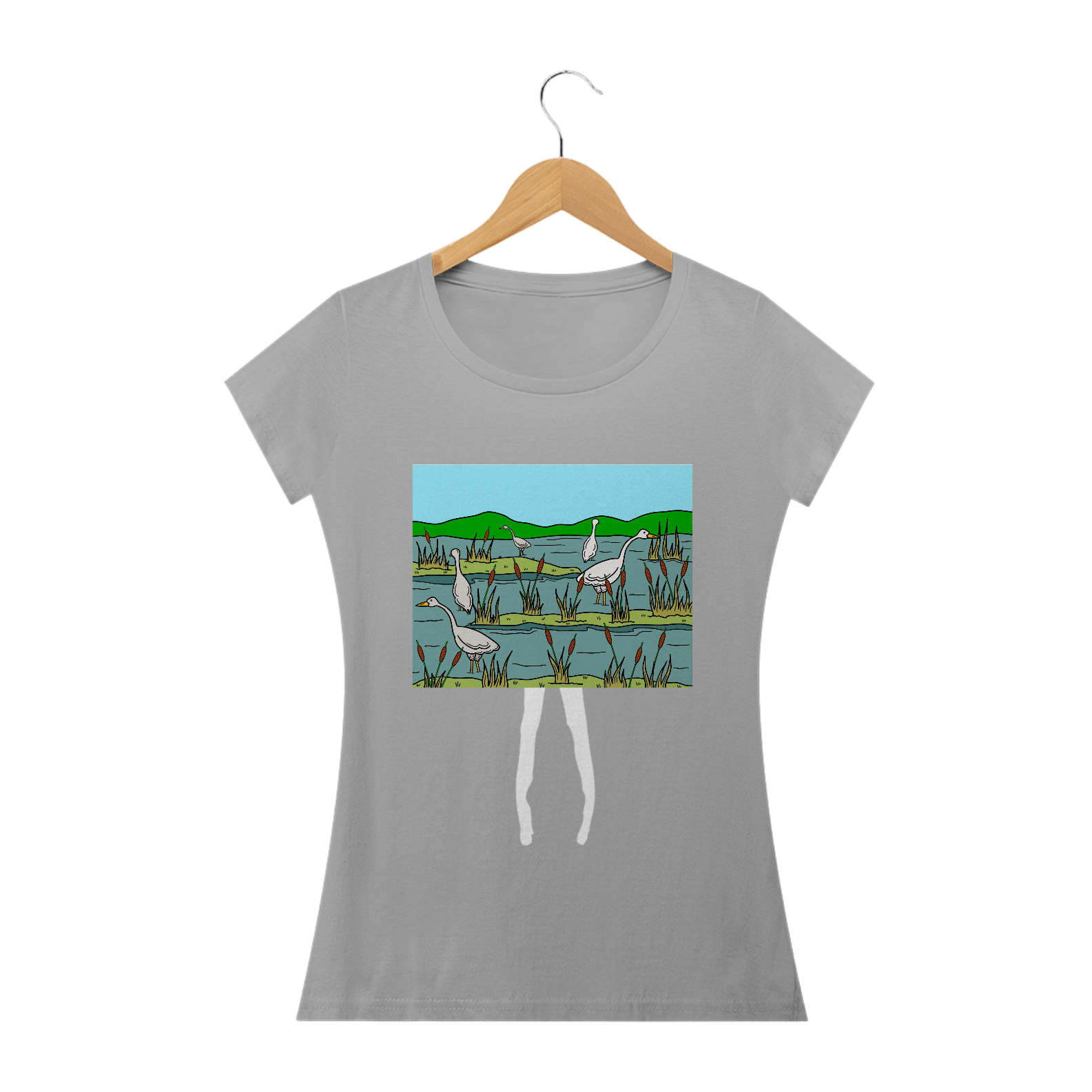 Natureza em Ação: Explore Nossa Camiseta Gansos Pescadores. Uma cena serena de gansos pescando em um pantano, capturando a beleza tranquila da vida selvagem em cada detalhe