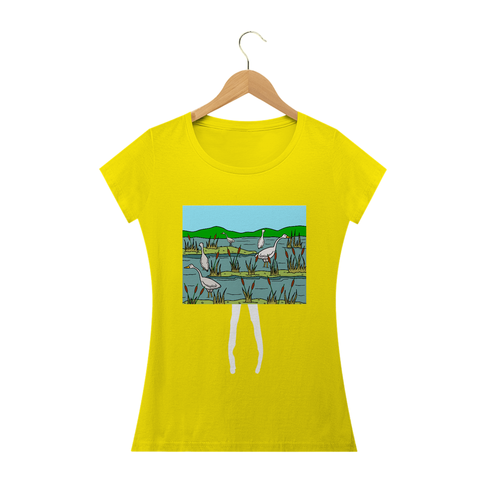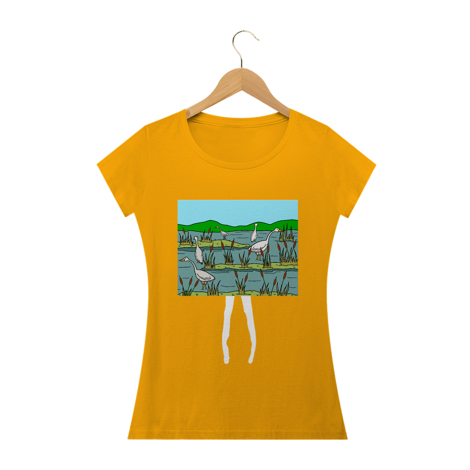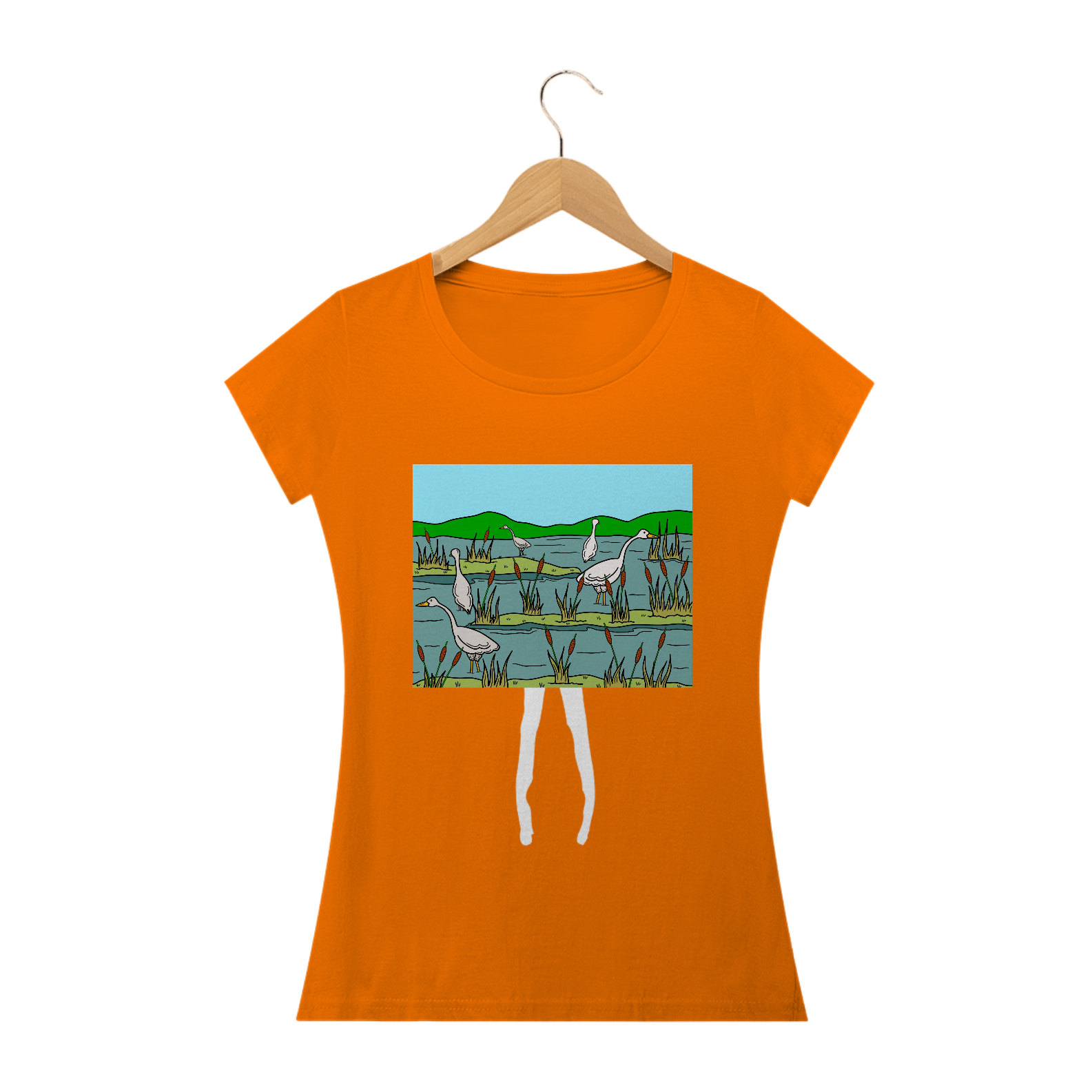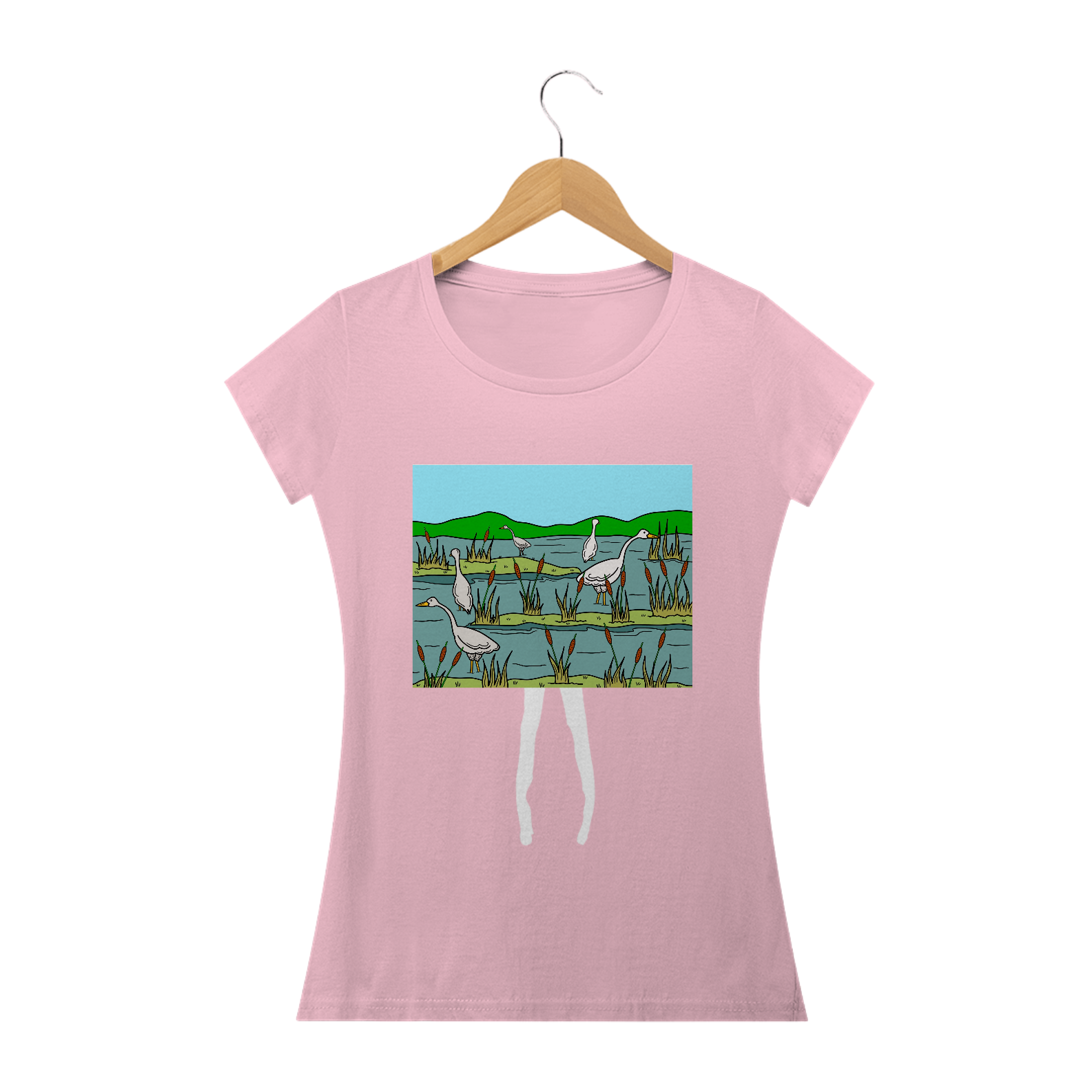 Natureza em Ação: Explore Nossa Camiseta Gansos Pescadores. Uma cena serena de gansos pescando em um pantano, capturando a beleza tranquila da vida selvagem em cada detalhe