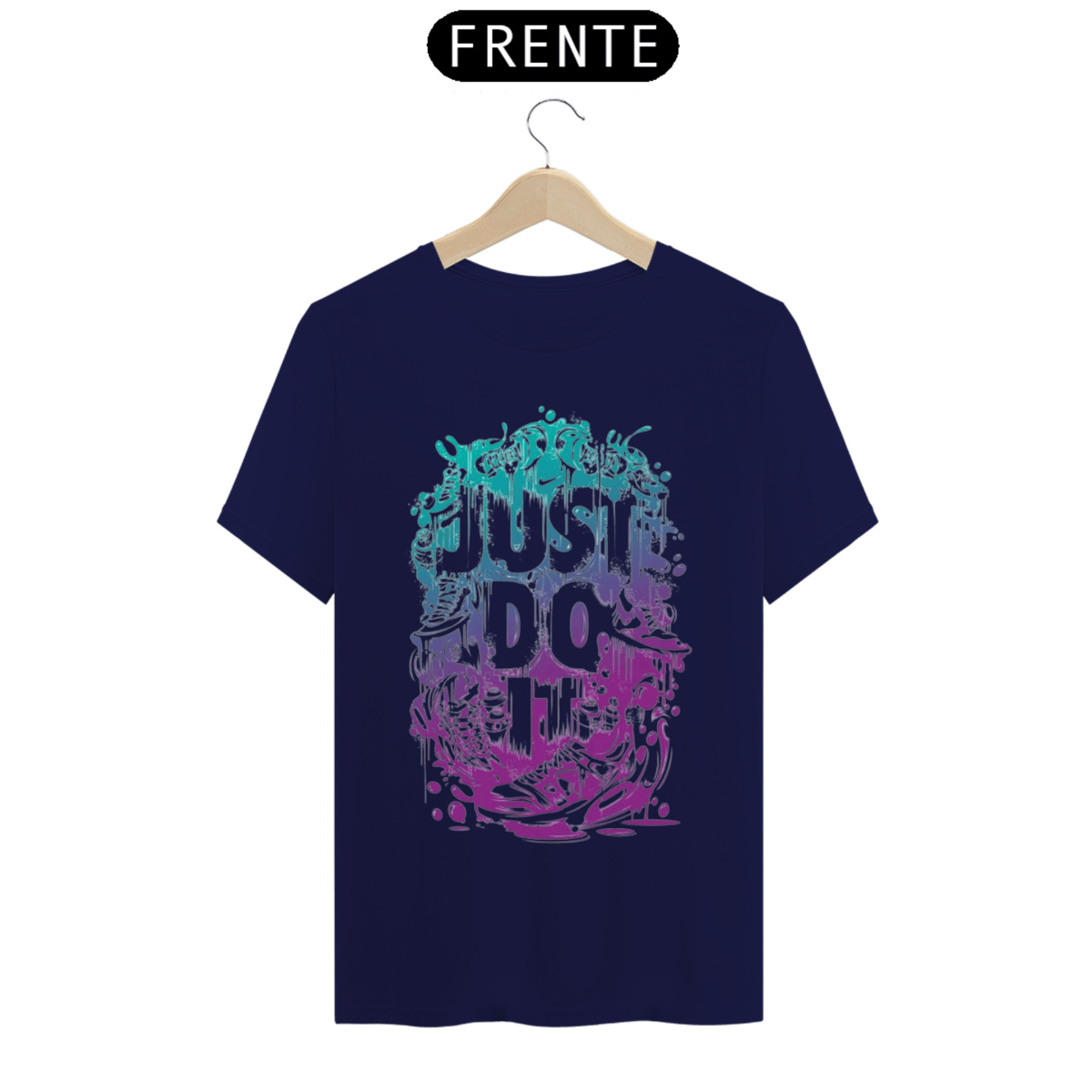 A frase icônica "Just Do It" ganha vida de maneira ousada e dinâmica neste design. As palavras são carregadas de energia, apresentadas em um gradiente envolvente que se desloca do ciano vibrante para o roxo profundo. Esse gradiente simboliza a jornada de transformar sonhos em realidade, destacando a progressão contínua em direção ao sucesso.