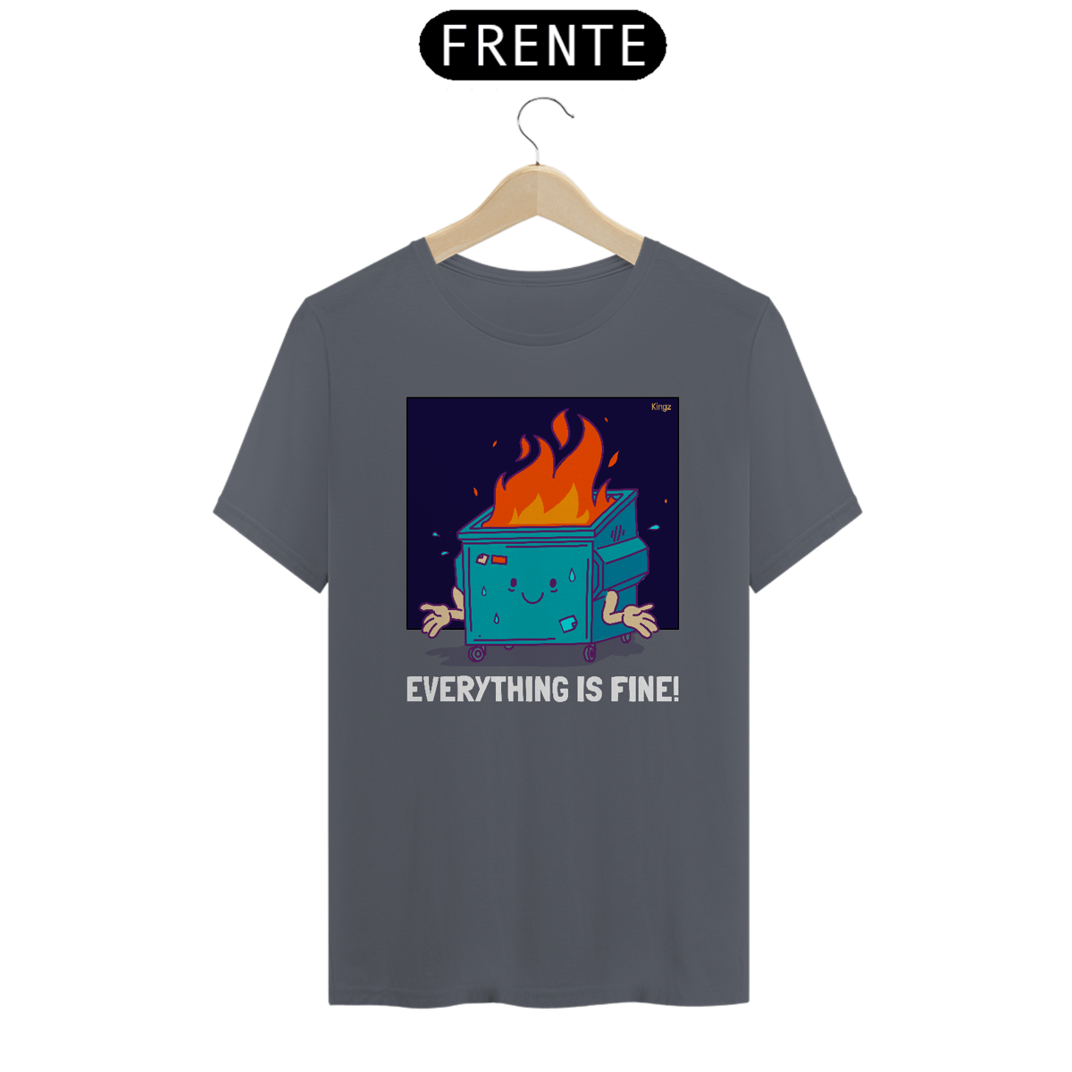 Transforme o caos em otimismo com nossa camiseta: uma lixeira sorridente em chamas, simbolizando resiliência e positividade em meio ao caos.