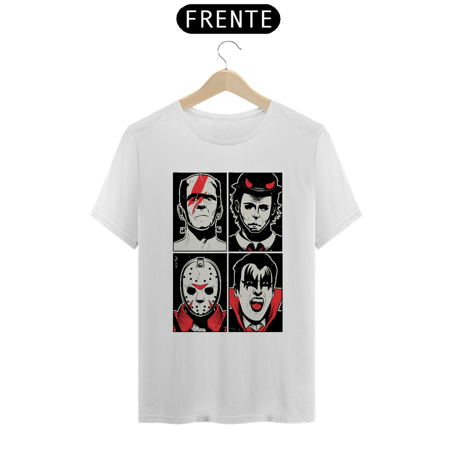 Um print com Frankenstein de David Bowie, Michael Myers de ACD/DC, Jason de Michael Jackson e Conde Drácula de Kiss é para deixar o Halloween ainda mais irresistível e com muita música. Ideal para usar no trabalho, na faculdade, no happy hour, na saída no fim de semana.
