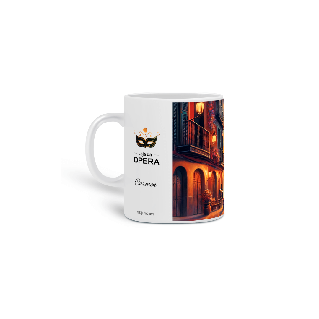 Esta peça é um tributo à intensidade e ao poder da famosa cigana. Com imagens vibrantes e coloridas, retratando Carmen em seus momentos mais memoráveis, esta caneca captura o espírito livre e indomável da personagem.