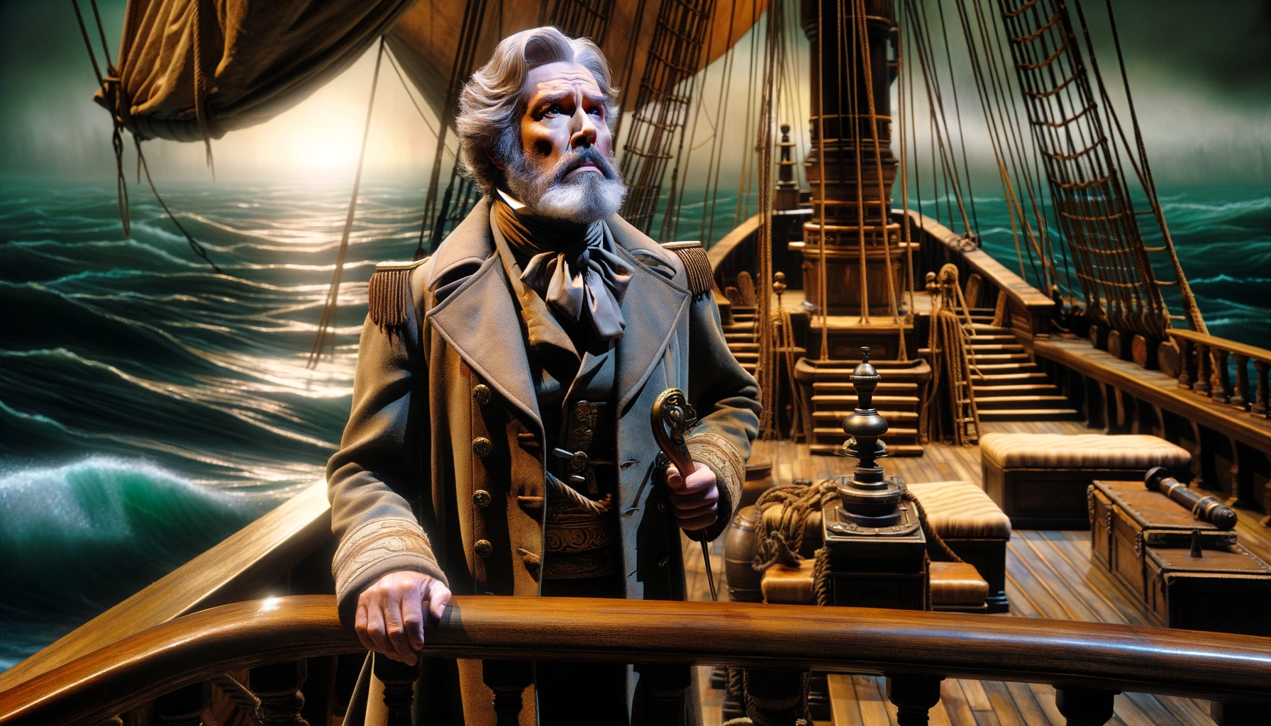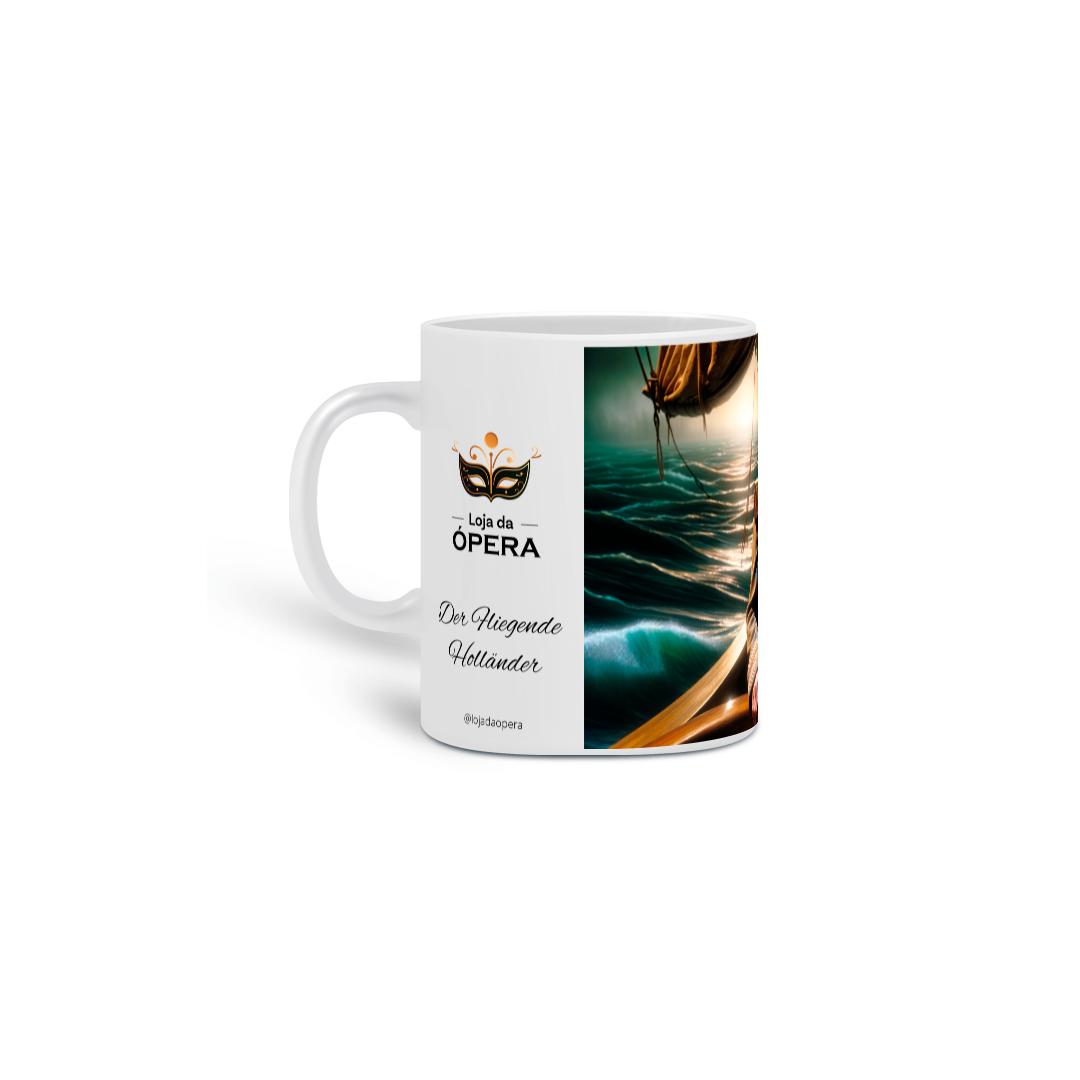 Esta caneca apresenta Daland, o experiente capitão marítimo, em seu navio, capturando seu momento de reflexão e a expectativa da promessa de riquezas oferecidas pelo Holandês Voador.