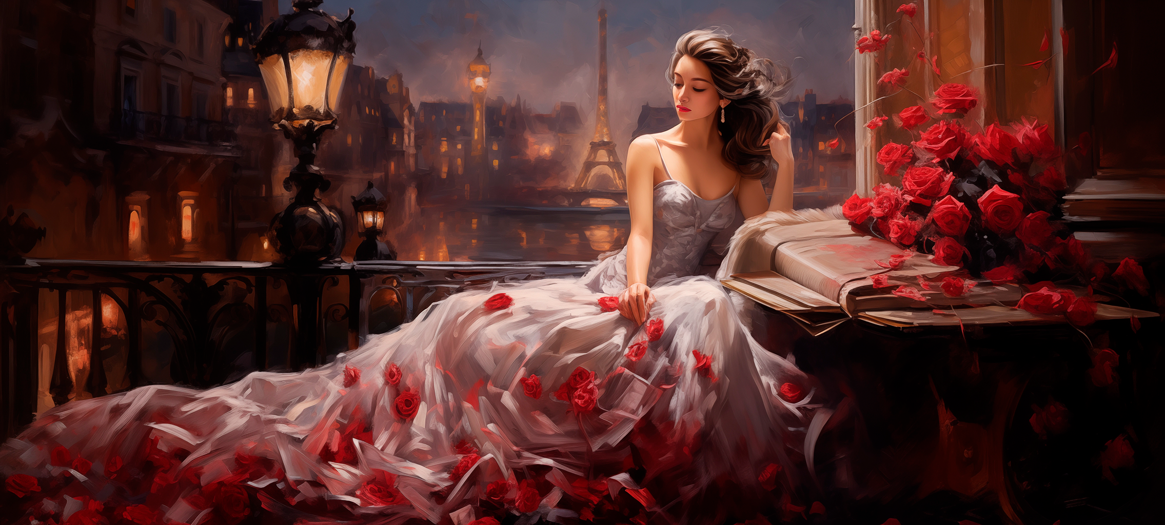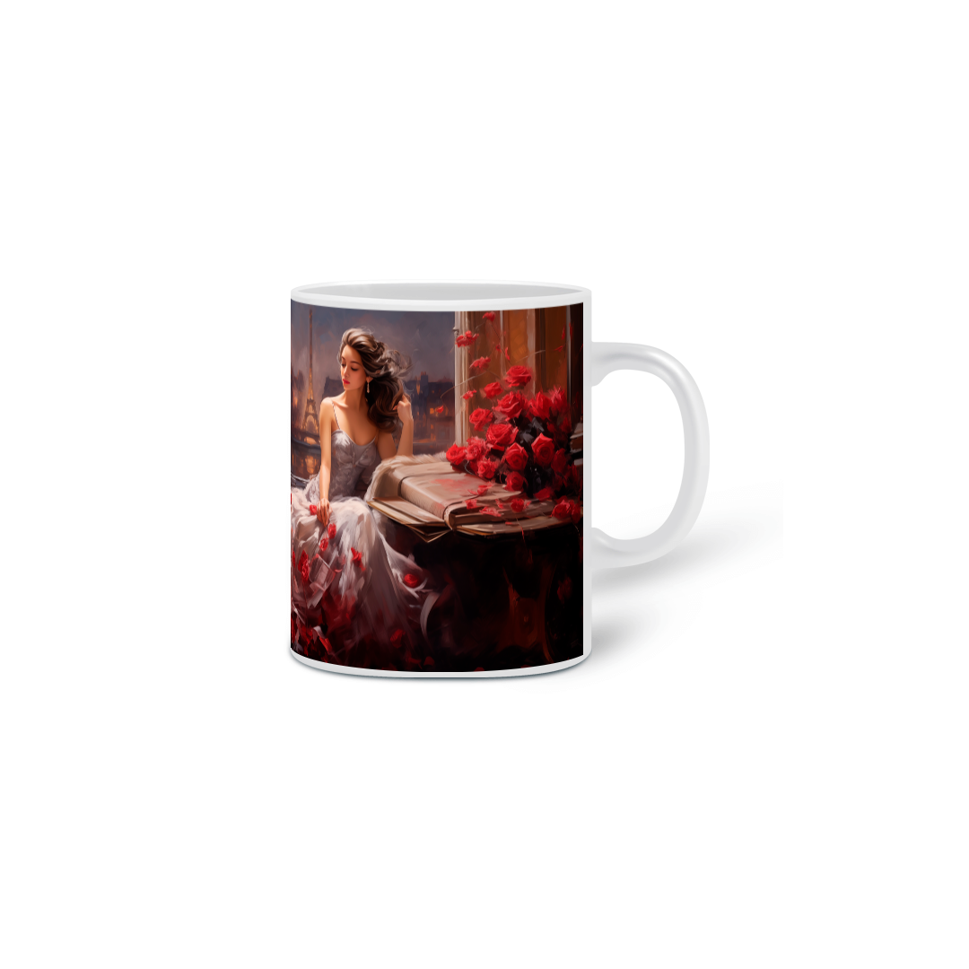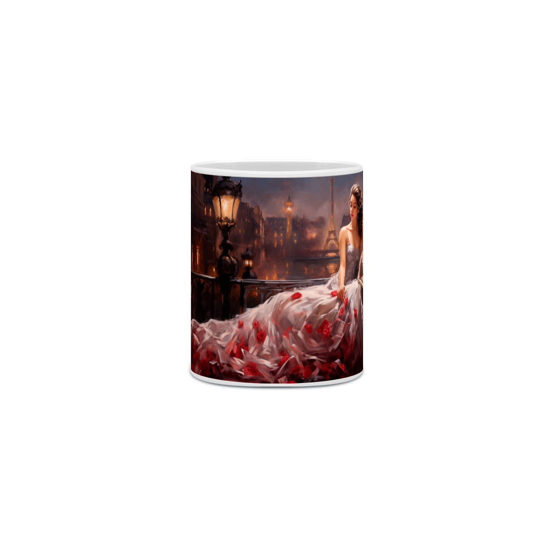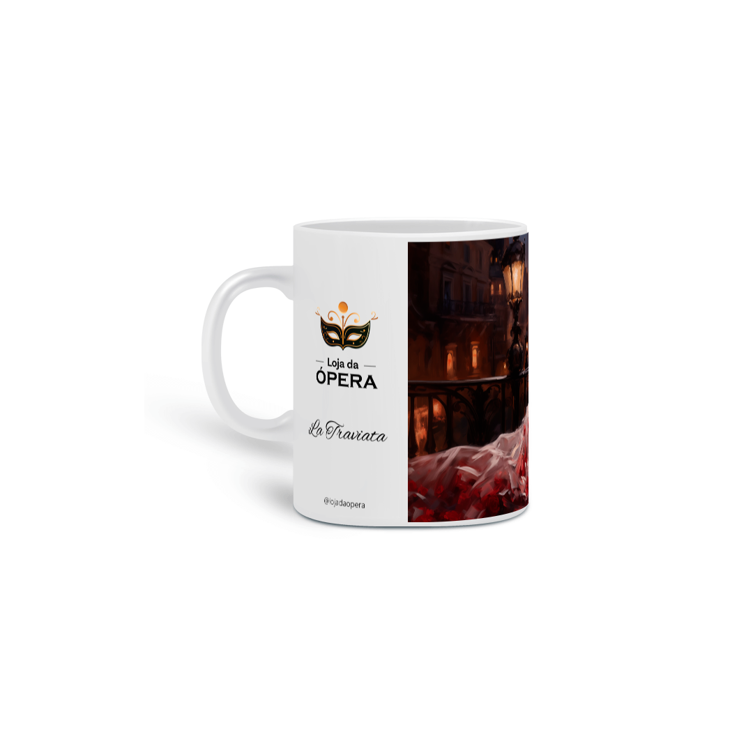 A caneca é adornada com uma ilustração delicada de Violetta em seu terraço, envolta em um vestido de gala deslumbrante, salpicado de rosas vermelhas, símbolo de amor e sacrifício. A silhueta da Torre Eiffel ao fundo evoca a cidade de Paris, o pano de fundo da trágica e bela narrativa operística.