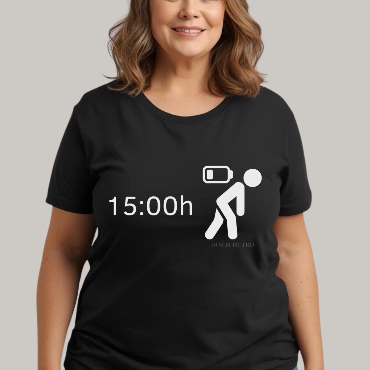 Com humor realista (do jeitinho que a maturidade manda), a estampa celebra aquela sensação universal: o momento exato em que sua bateria social, física e mental resolve pedir férias.