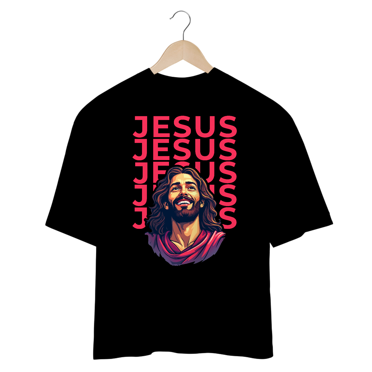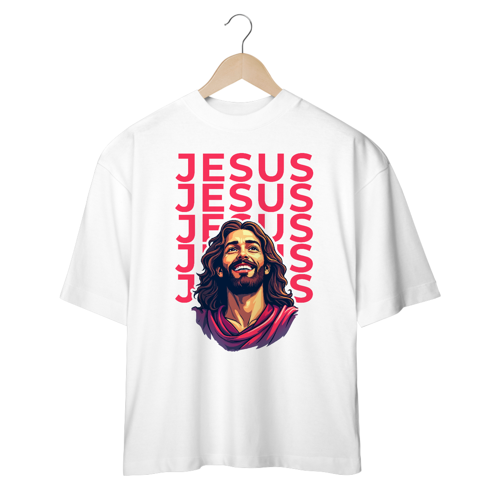 A Camiseta Oversized Unisex "JESUS" combina o melhor do conforto com uma estampa moderna e inspiradora. Com um caimento mais largo, estilo oversized, ela é perfeita para quem deseja um visual despojado sem abrir mão da mensagem de fé. A estampa vibrante de Jesus com repetição do nome cria um design impactante, ideal para momentos casuais e cheios de estilo.