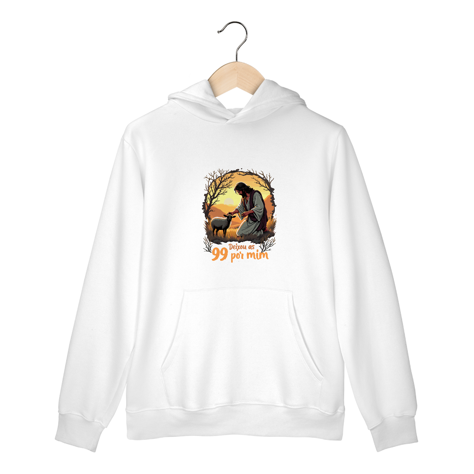 Abrace o conforto e a mensagem transformadora do nosso Moletom Canguru "Deixou as 99 por Mim". Este moletom é mais do que uma simples peça de roupa; é uma declaração de fé e estilo. Feito com material de alta qualidade, ele oferece um toque macio e aconchegante, ideal para os dias mais frios. O design emocionante apresenta a imagem de uma pessoa ajoelhada segurando um cordeiro, contra um pôr do sol deslumbrante, simbolizando a poderosa mensagem de sacrifício e amor.