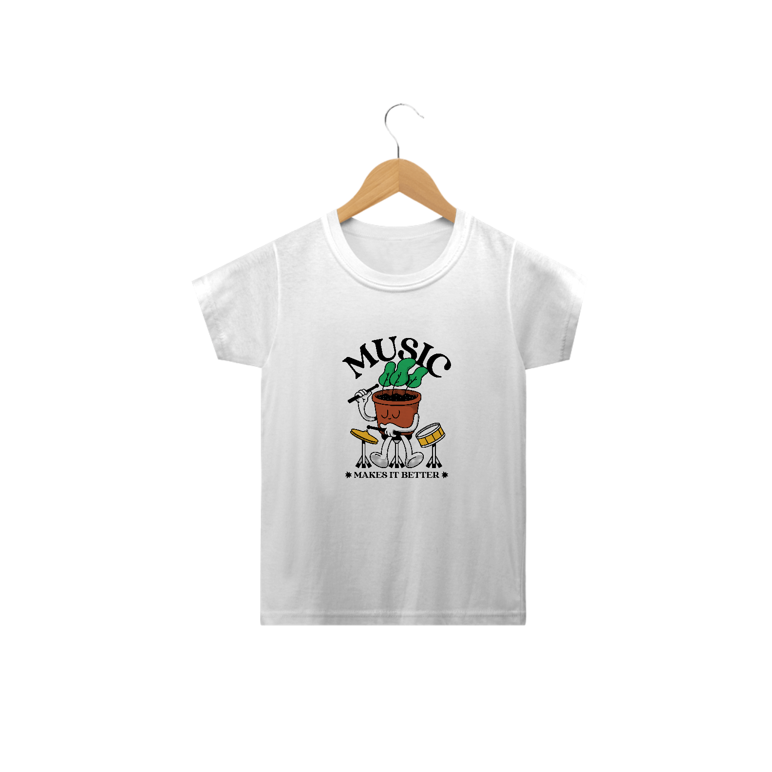 A Camiseta Music Makes It Better é perfeita para meninos e meninas de 2 a 14 anos que amam música e sabem que ela pode transformar o dia. Com uma estampa super fofa de uma planta tocando bateria, ela traz toda a vibe musical de forma divertida e criativa!