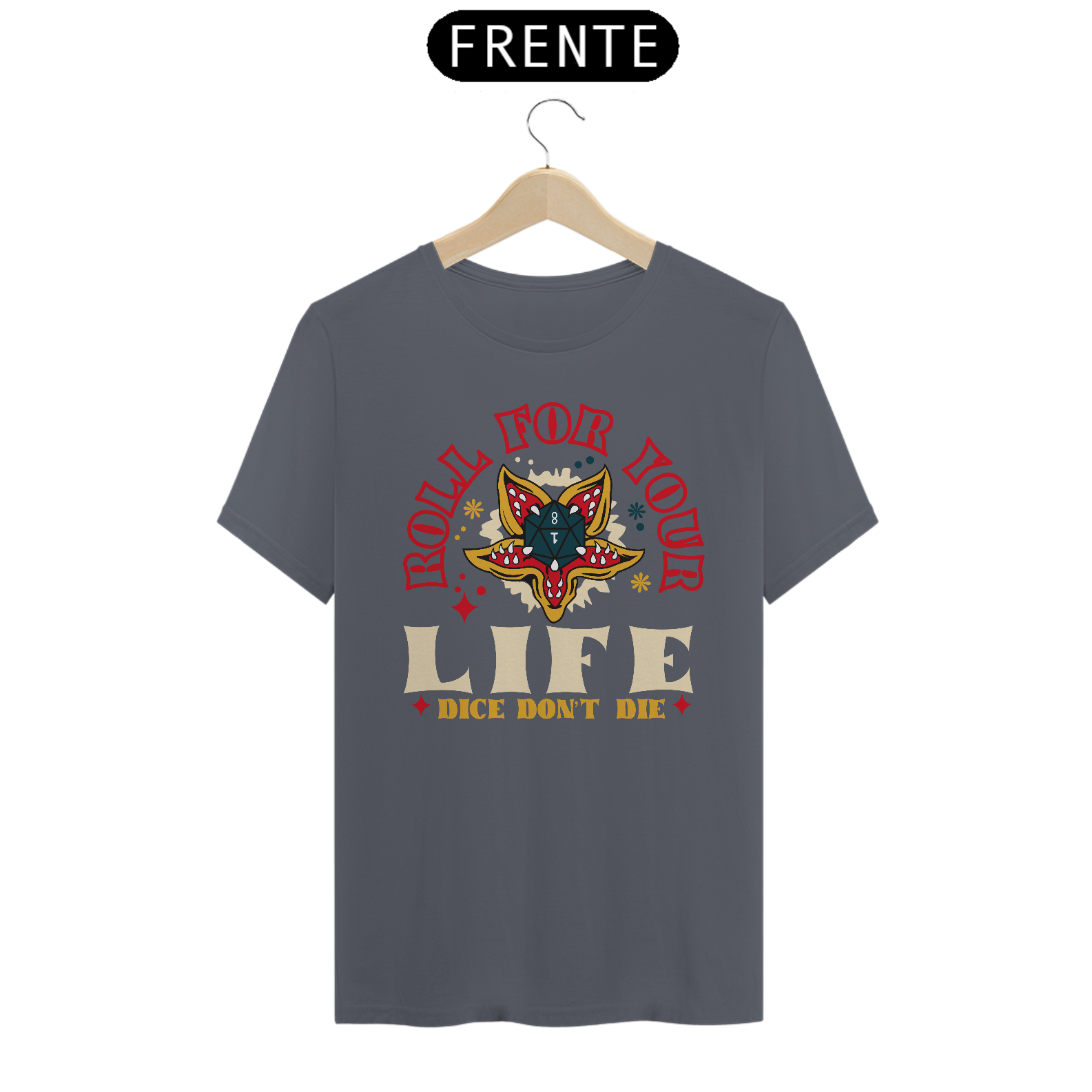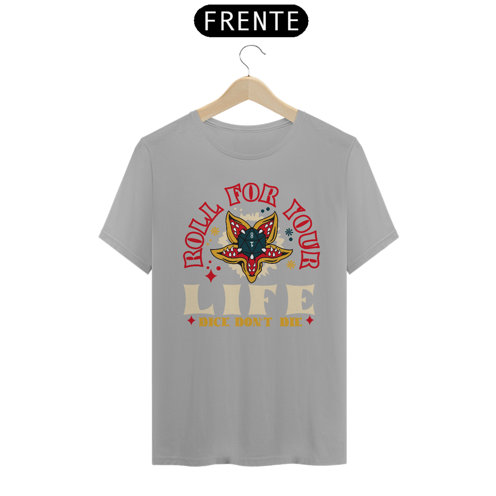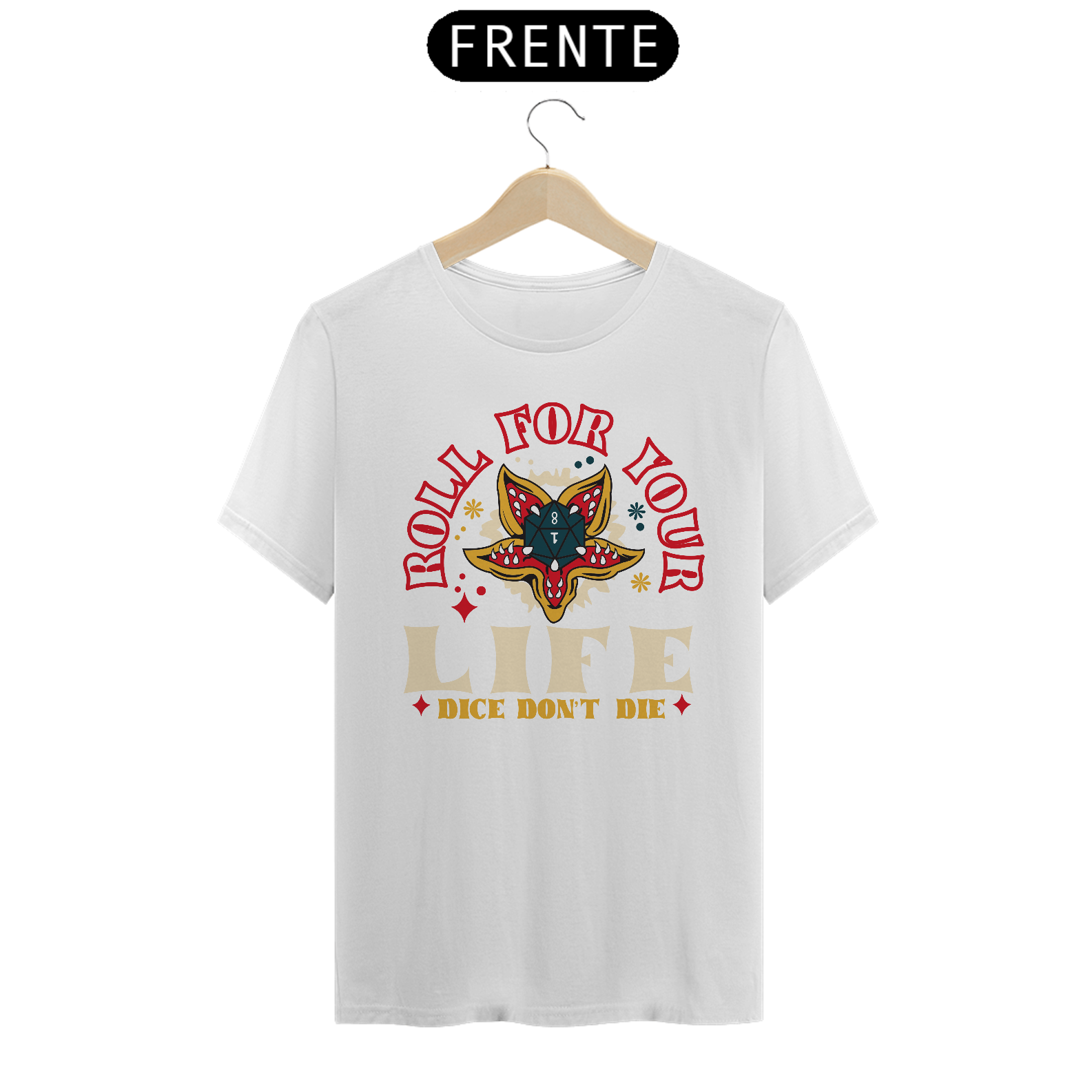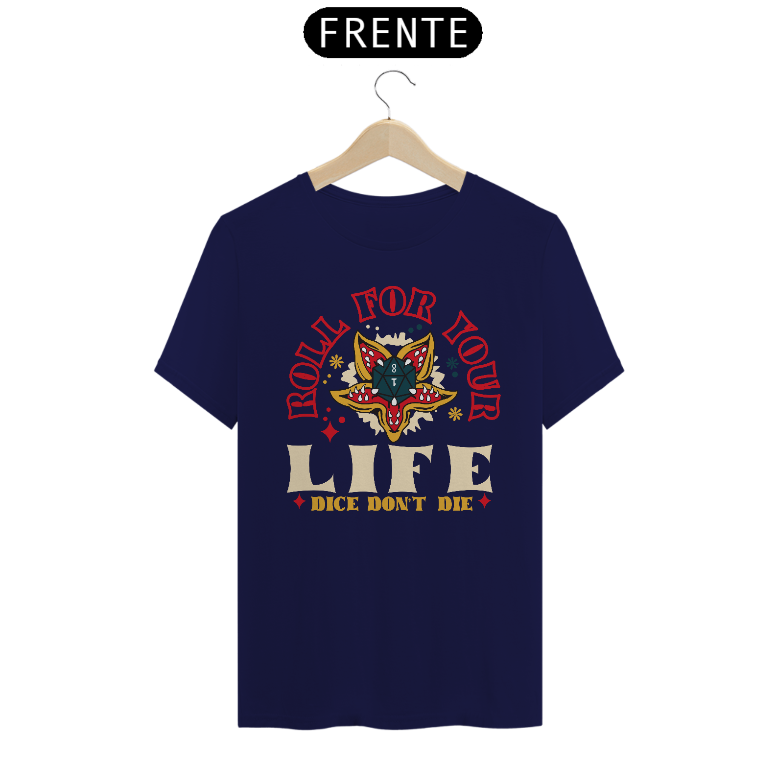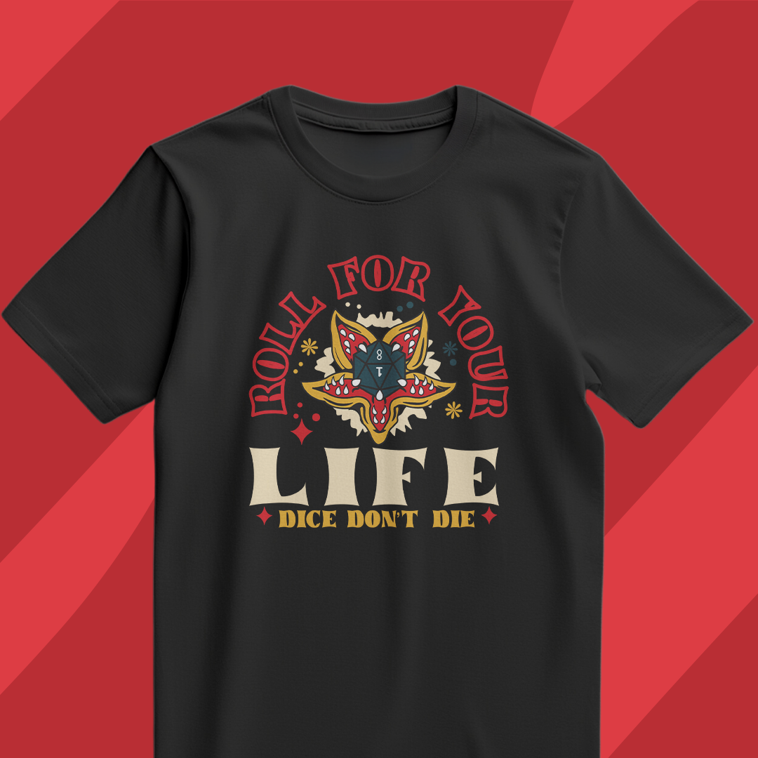 Prepare-se para enfrentar aventuras épicas com a camiseta "Roll for Your Life", inspirada no universo de Dungeons & Dragons! Com uma ilustração estilizada que remete aos clássicos designs de tatuagem vintage, o centro da peça destaca um dado d20 ornamentado por detalhes vibrantes e cores impactantes. A mensagem "Roll for Your Life - Dice Don’t Die" representa a emoção de cada rolagem de dados e a imprevisibilidade das campanhas. Esta é uma camiseta perfeita para mestres, aventureiros e qualquer um que valorize o espírito do RPG! Feita com tecido de alta qualidade e caimento confortável, é uma ótima opção para sessões de jogo, convenções geek e uso casual. Mostre que você vive pela próxima rolagem de dados!