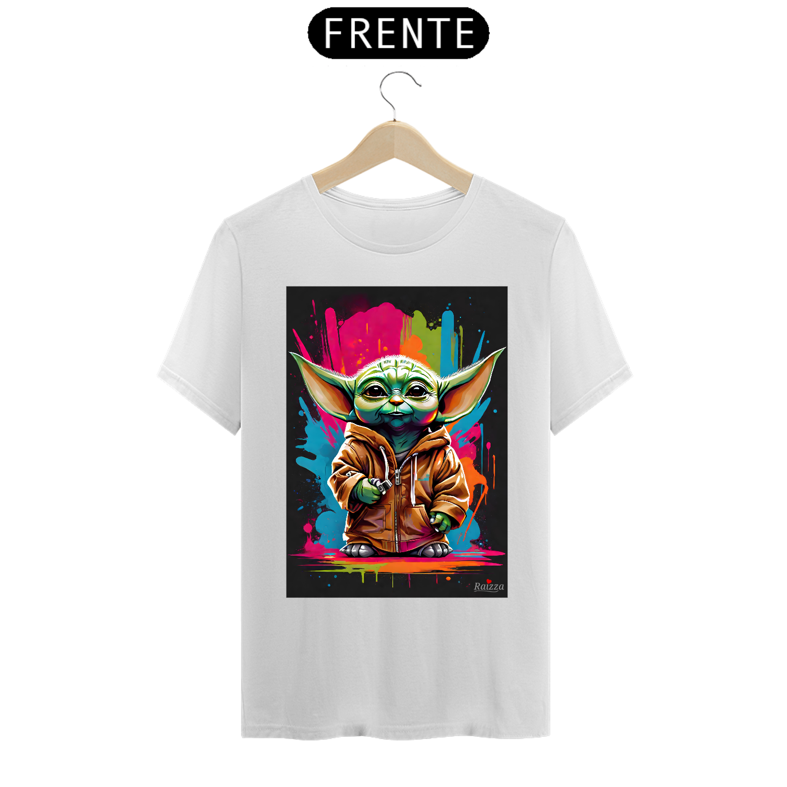 Camiseta Baby Yoda possui uma estampa produzida com impressão digital (DTG) e o processo é realizado com o que há de mais moderno no mercado, em impressora específica para malharia, imprimindo a arte com qualidade de definição excepcional e textura mínima sob a malha.