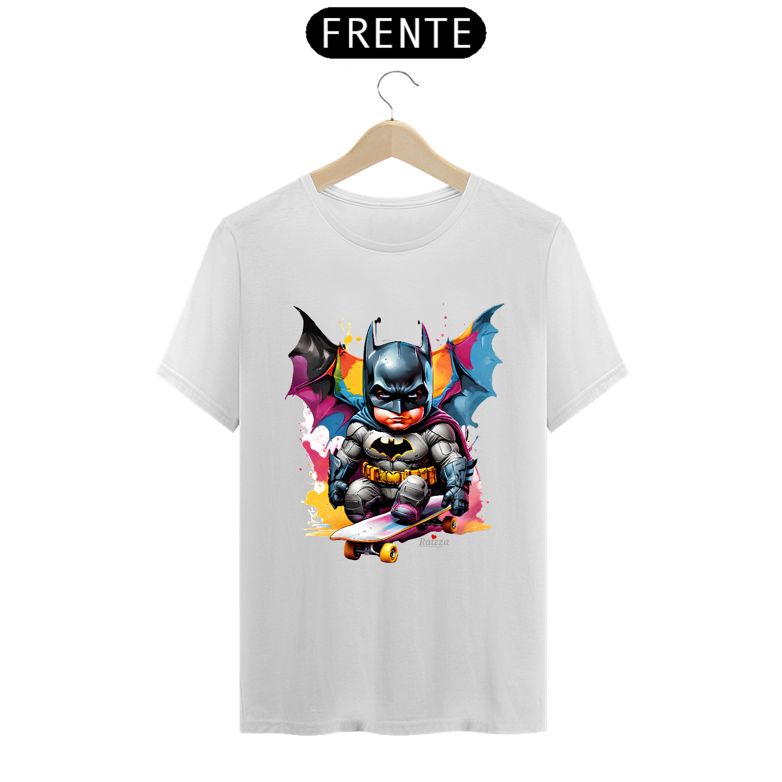 Camiseta Baby Batman Skatista possui uma estampa produzida com impressão digital (DTG) e o processo é realizado com o que há de mais moderno no mercado, em impressora específica para malharia, imprimindo a arte com qualidade de definição excepcional e textura mínima sob a malha.