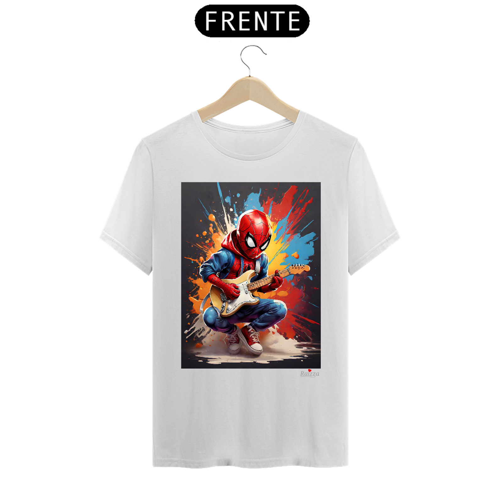 Camiseta Homem Aranha Guitarrista possui uma estampa produzida com impressão digital (DTG) e o processo é realizado com o que há de mais moderno no mercado, em impressora específica para malharia, imprimindo a arte com qualidade de definição excepcional e textura mínima sob a malha.