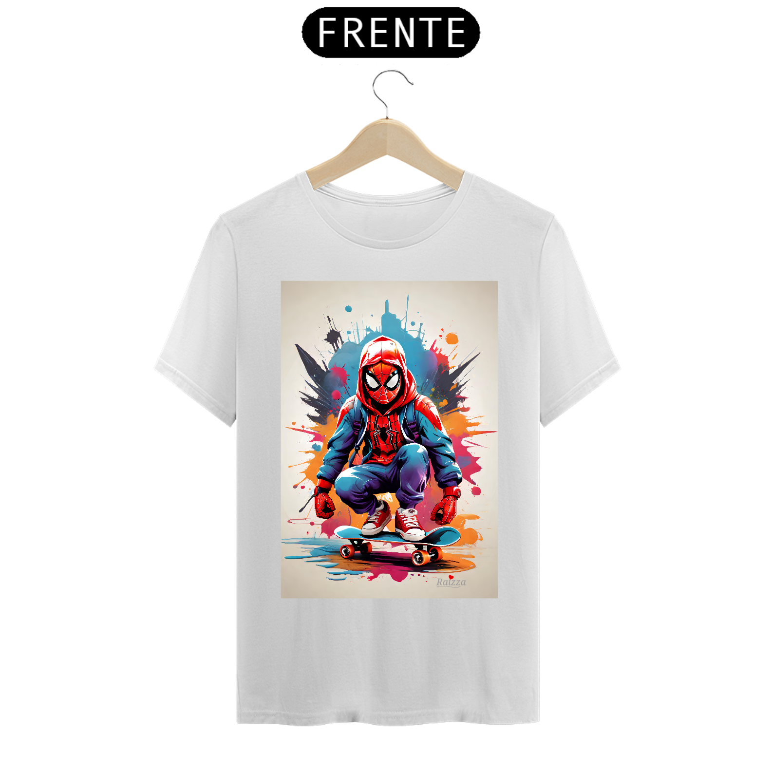 Camiseta Homem Aranha Skatista possui uma estampa produzida com impressão digital (DTG) e o processo é realizado com o que há de mais moderno no mercado, em impressora específica para malharia, imprimindo a arte com qualidade de definição excepcional e textura mínima sob a malha.
