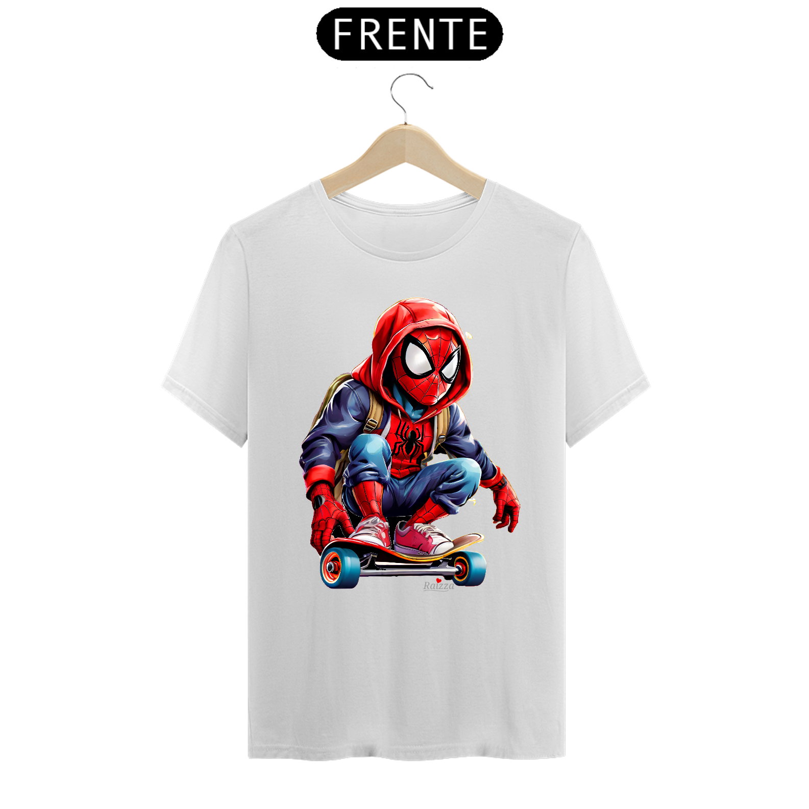 Camiseta Homem Aranha Skatista possui uma estampa produzida com impressão digital (DTG) e o processo é realizado com o que há de mais moderno no mercado, em impressora específica para malharia, imprimindo a arte com qualidade de definição excepcional e textura mínima sob a malha.