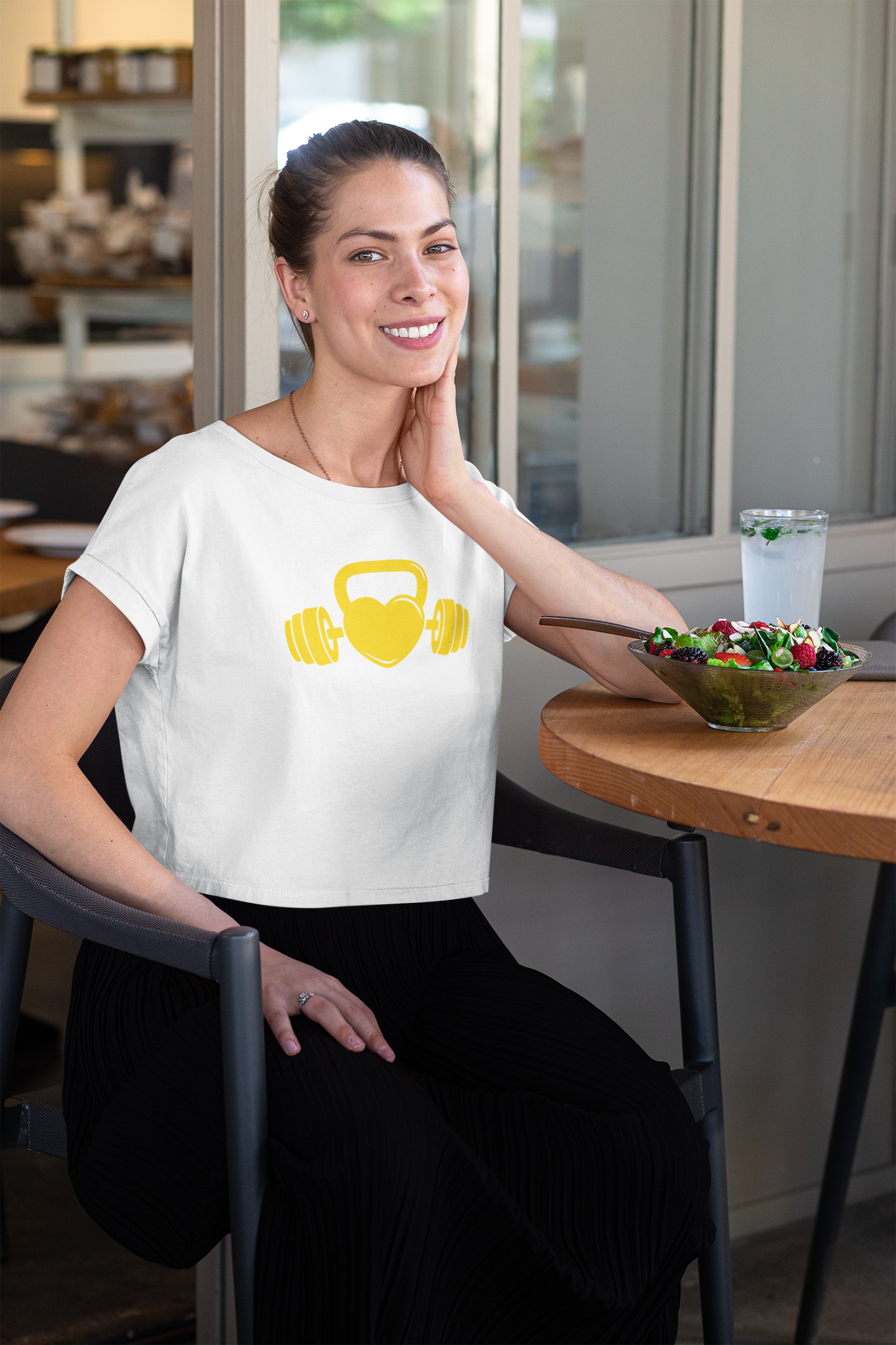Camiseta cropped com coração de kettlebell.