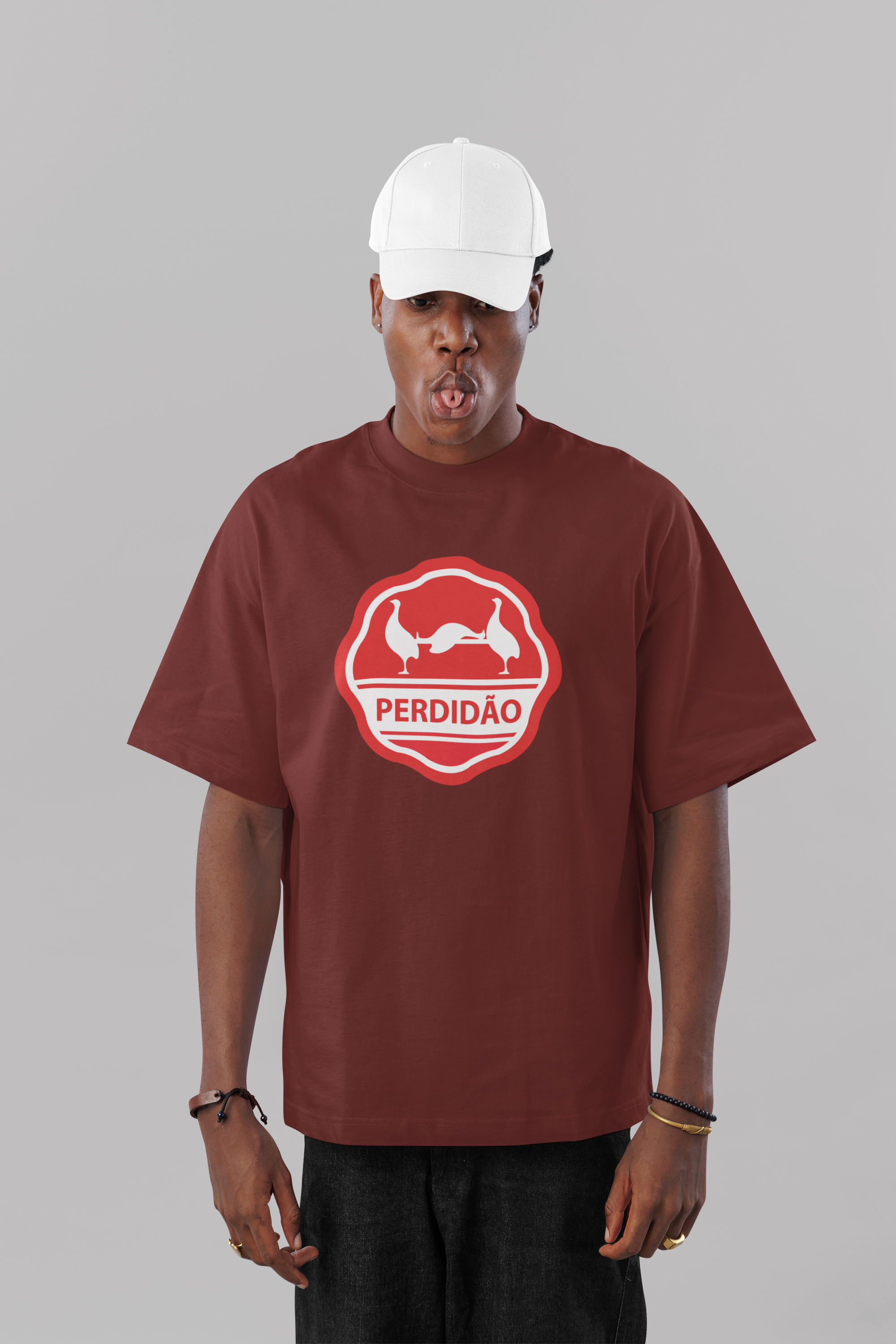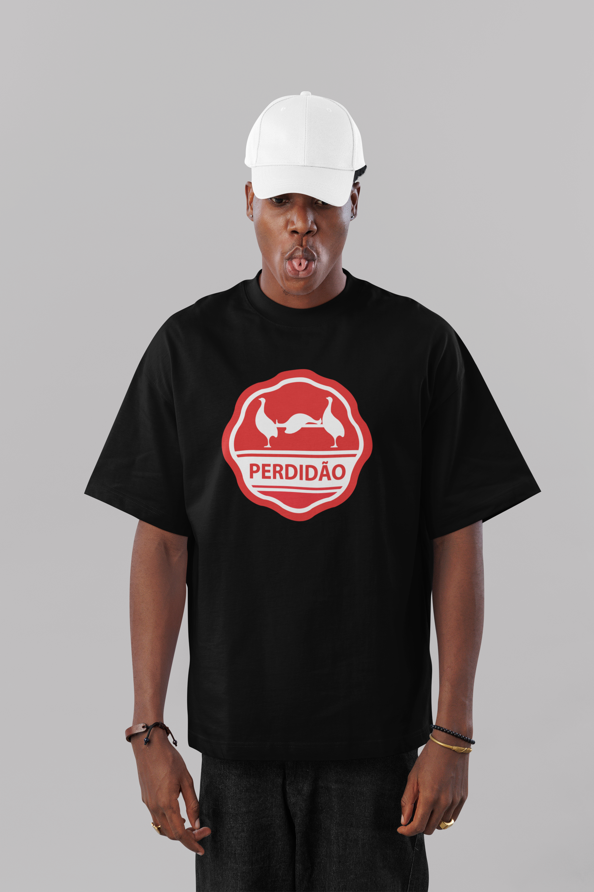 Camiseta oversized unissex com a estampa escrita "perdidão" e duas aves carregando uma terceira em uma maca.