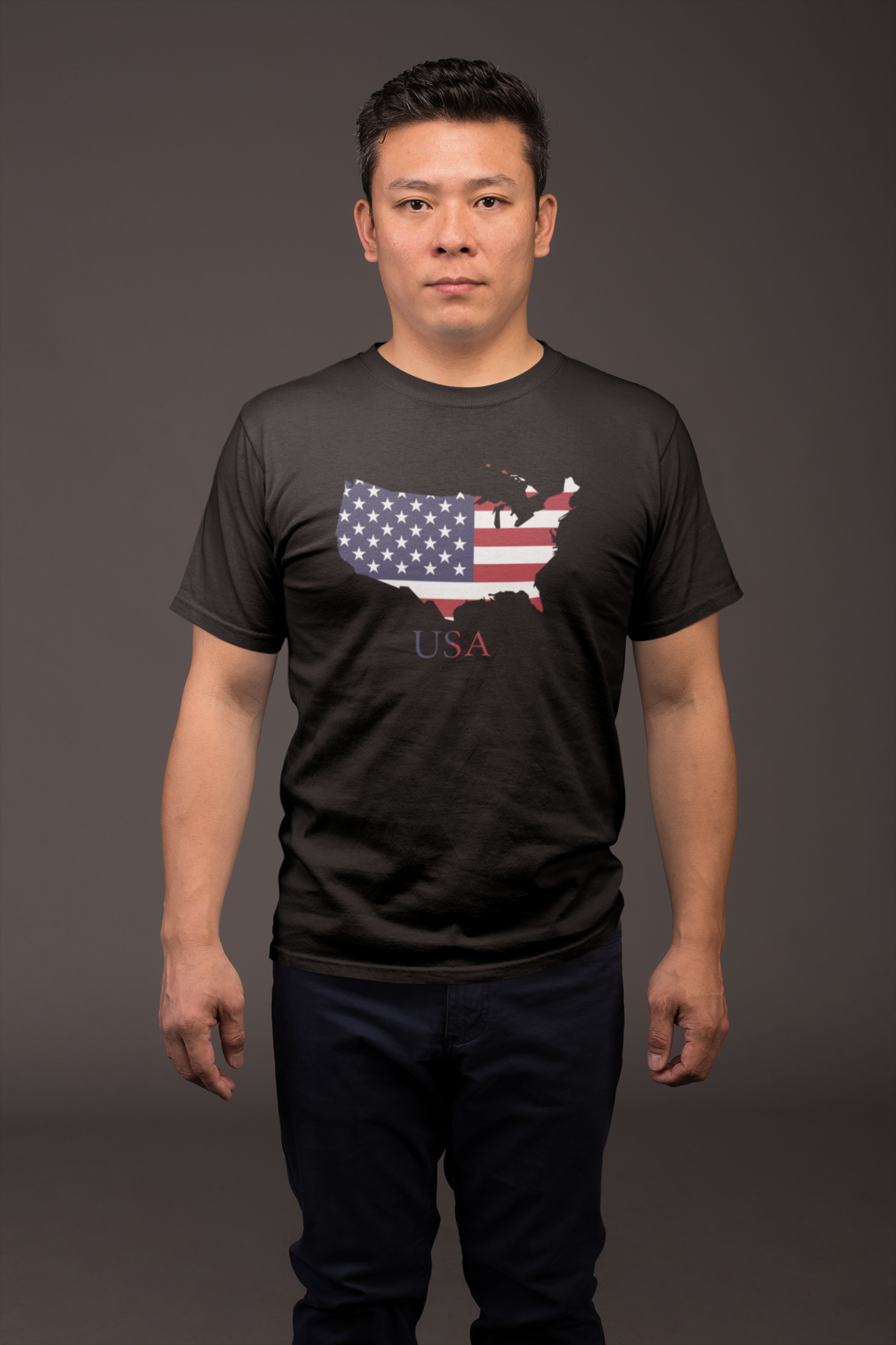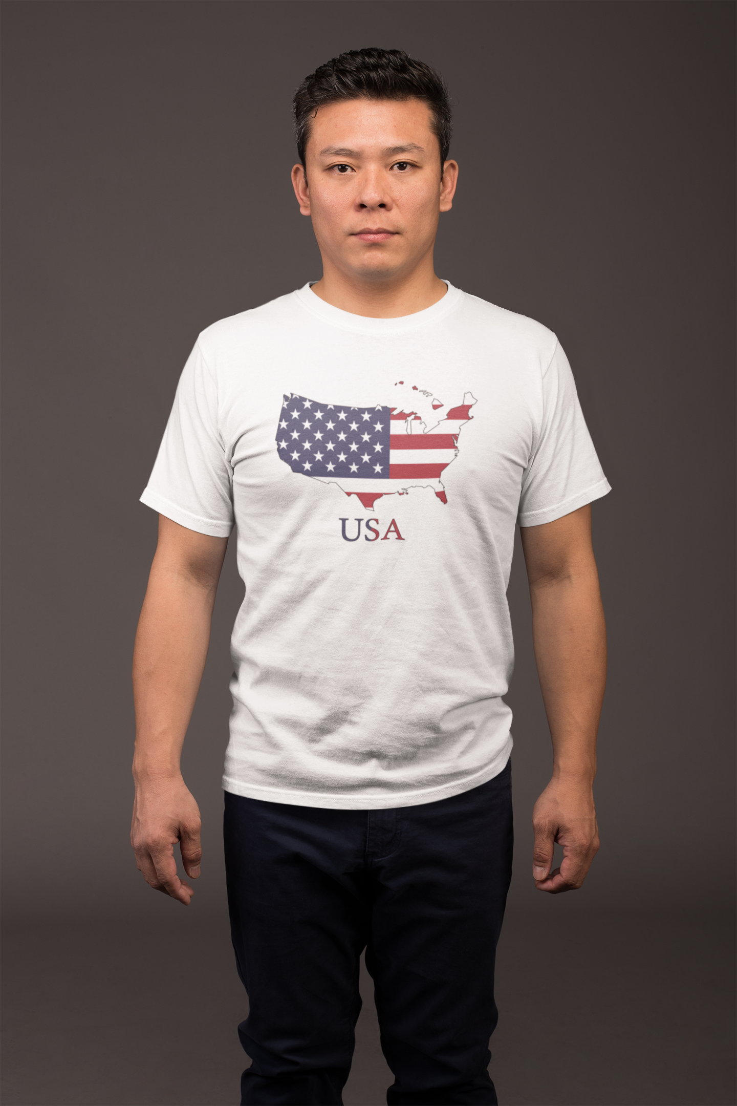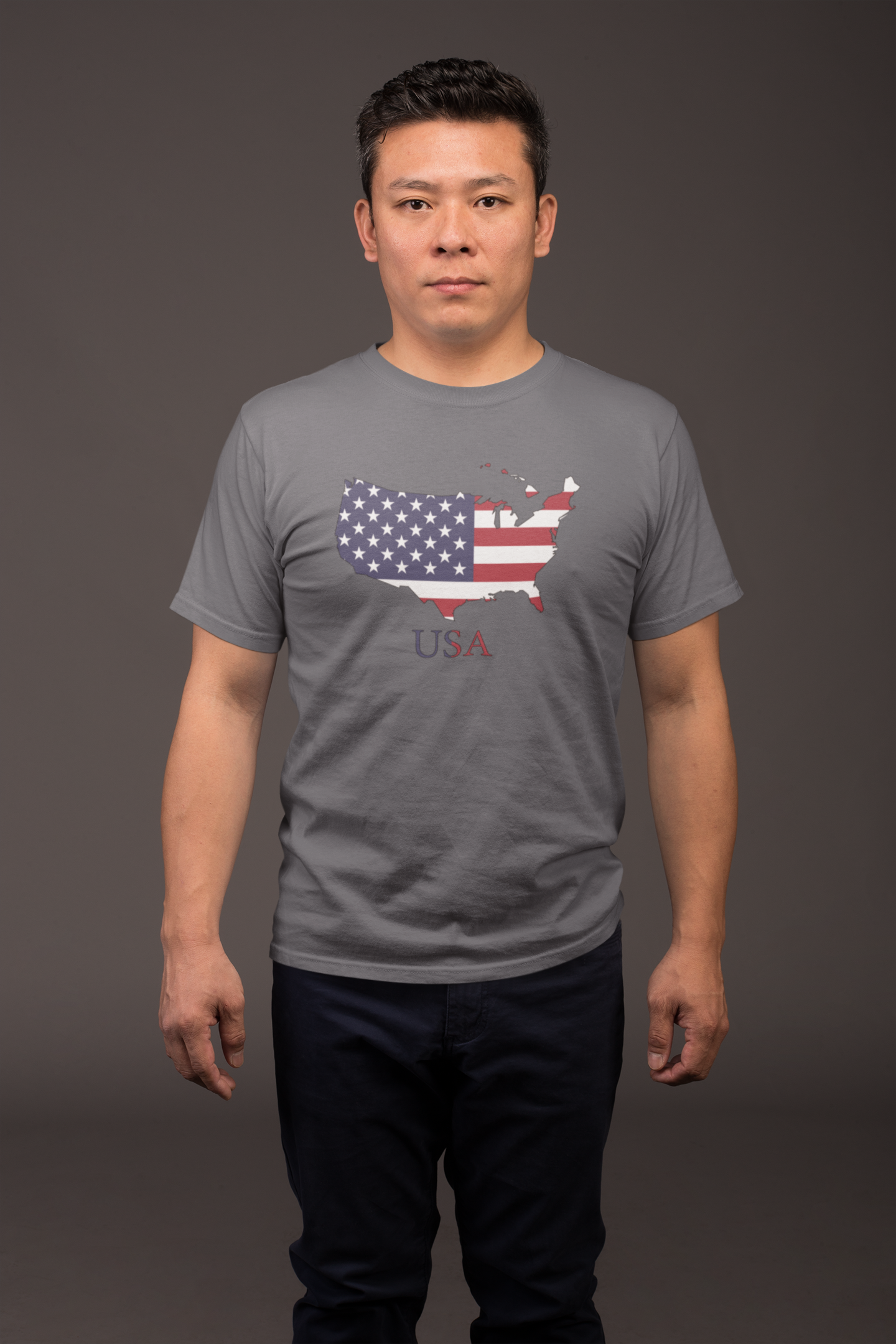 Camiseta básica com bandeira dos Estados Unidos dentro da silhueta do país.