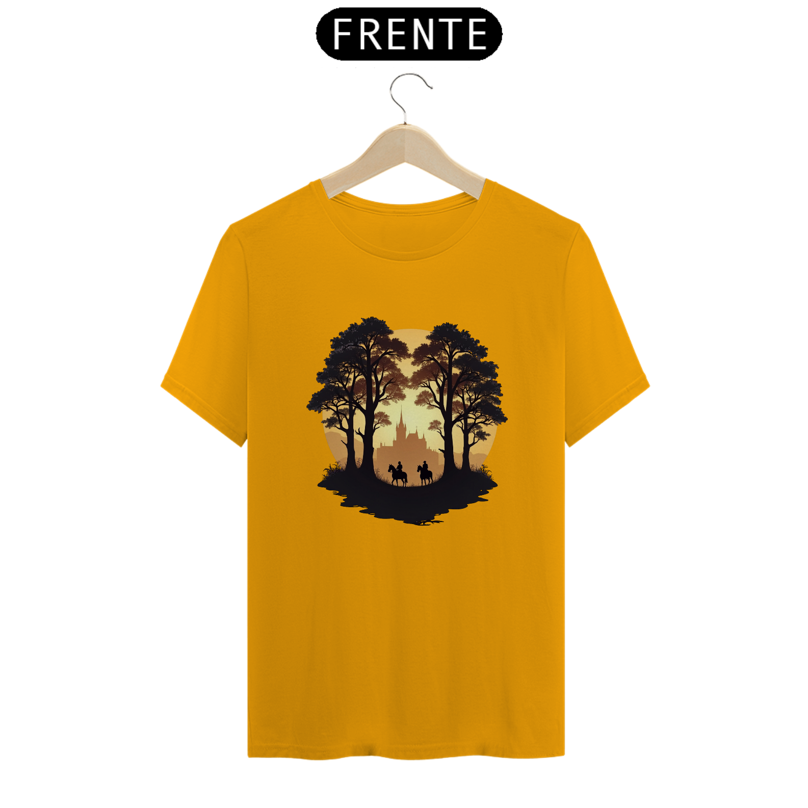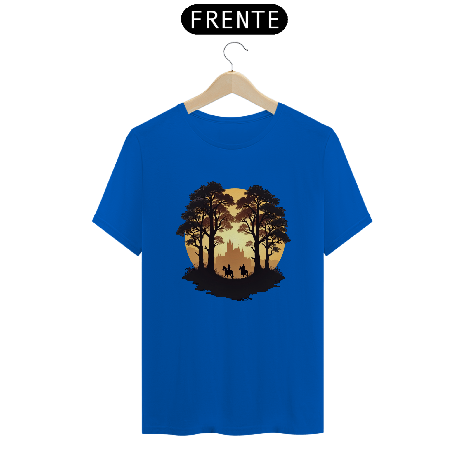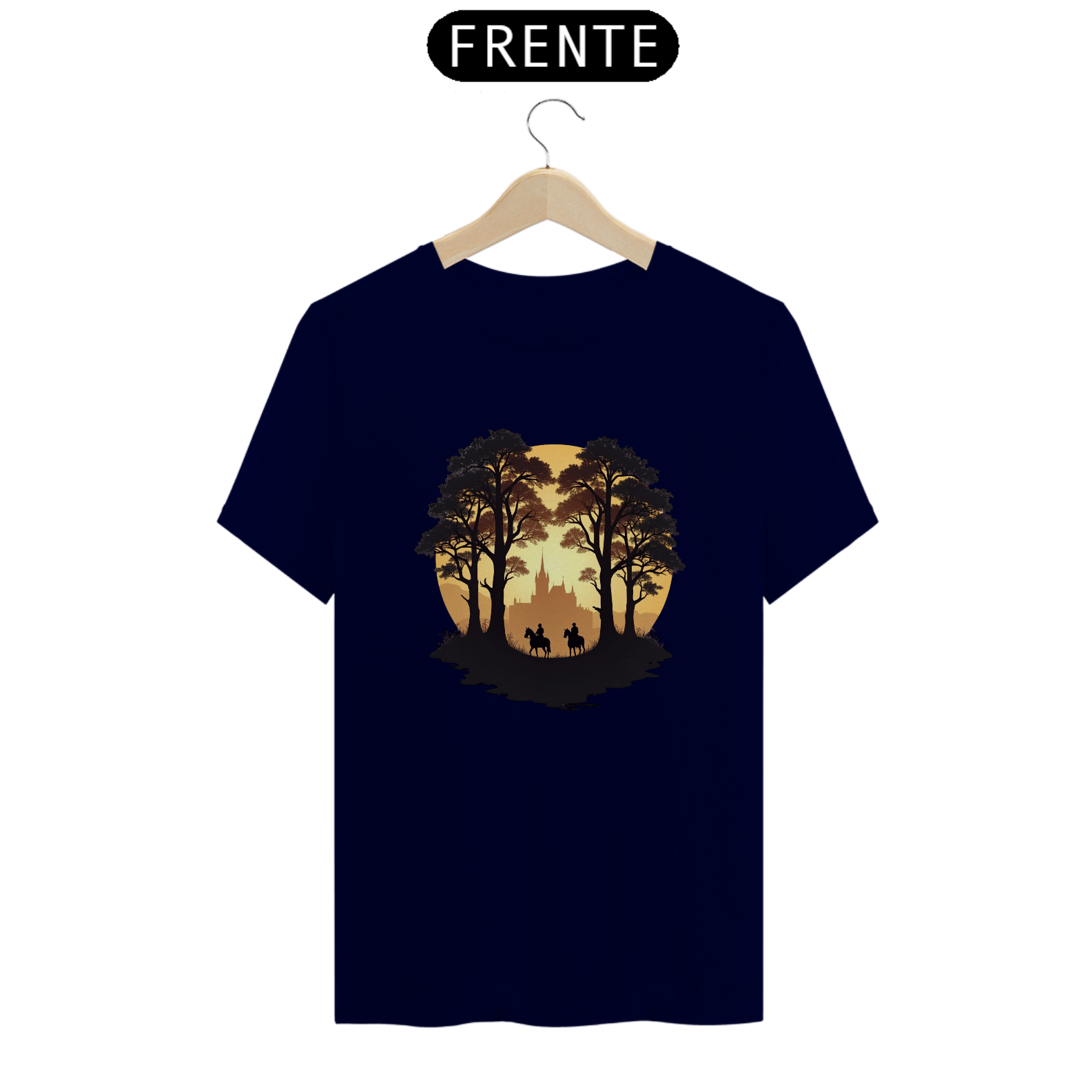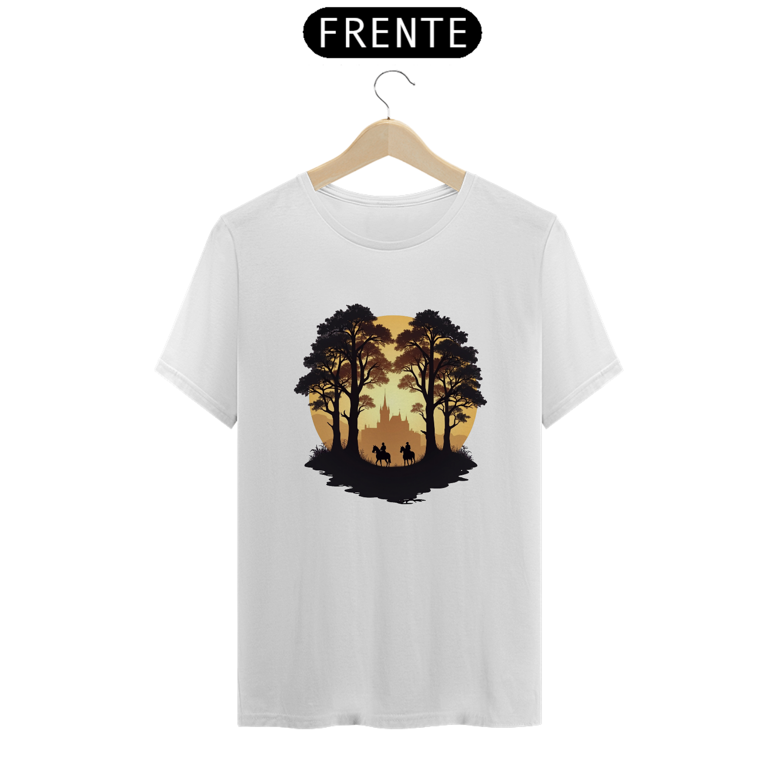 Adentre um mundo de mistério e aventura com a camiseta "Cavaleiros do Crepúsculo". Com um design que retrata dois cavaleiros explorando uma trilha sombria em meio às árvores, com um castelo ao fundo, essa peça evoca o espírito épico dos jogos de estratégia e sobrevivência.