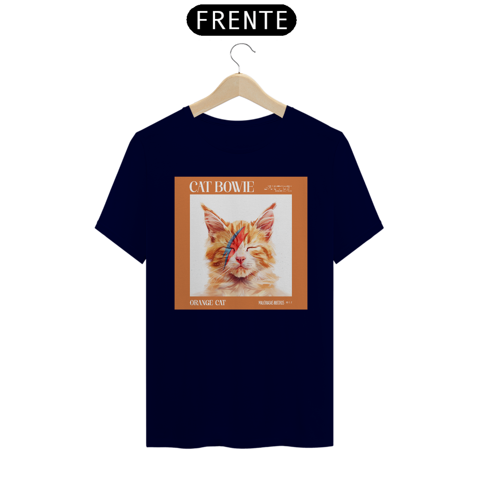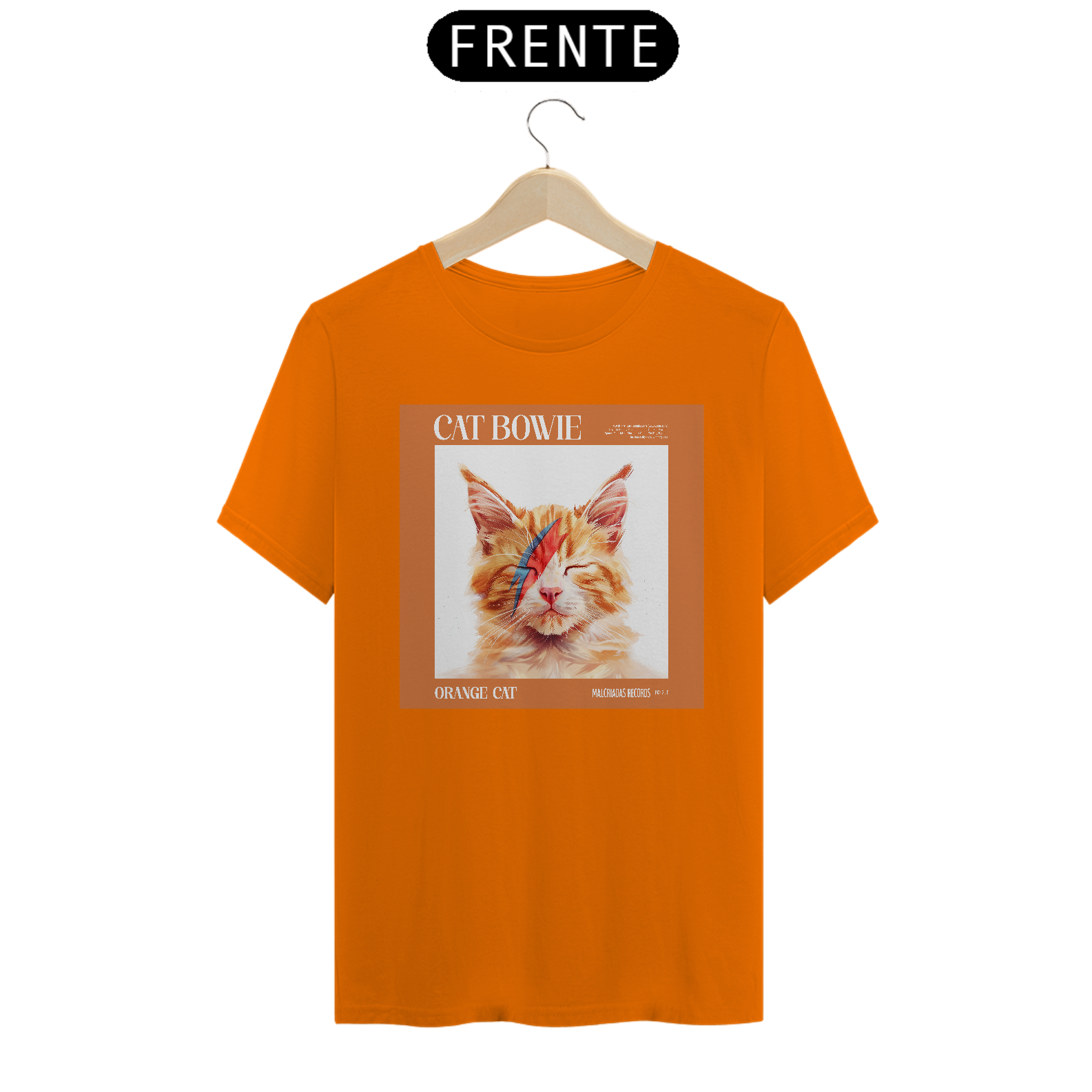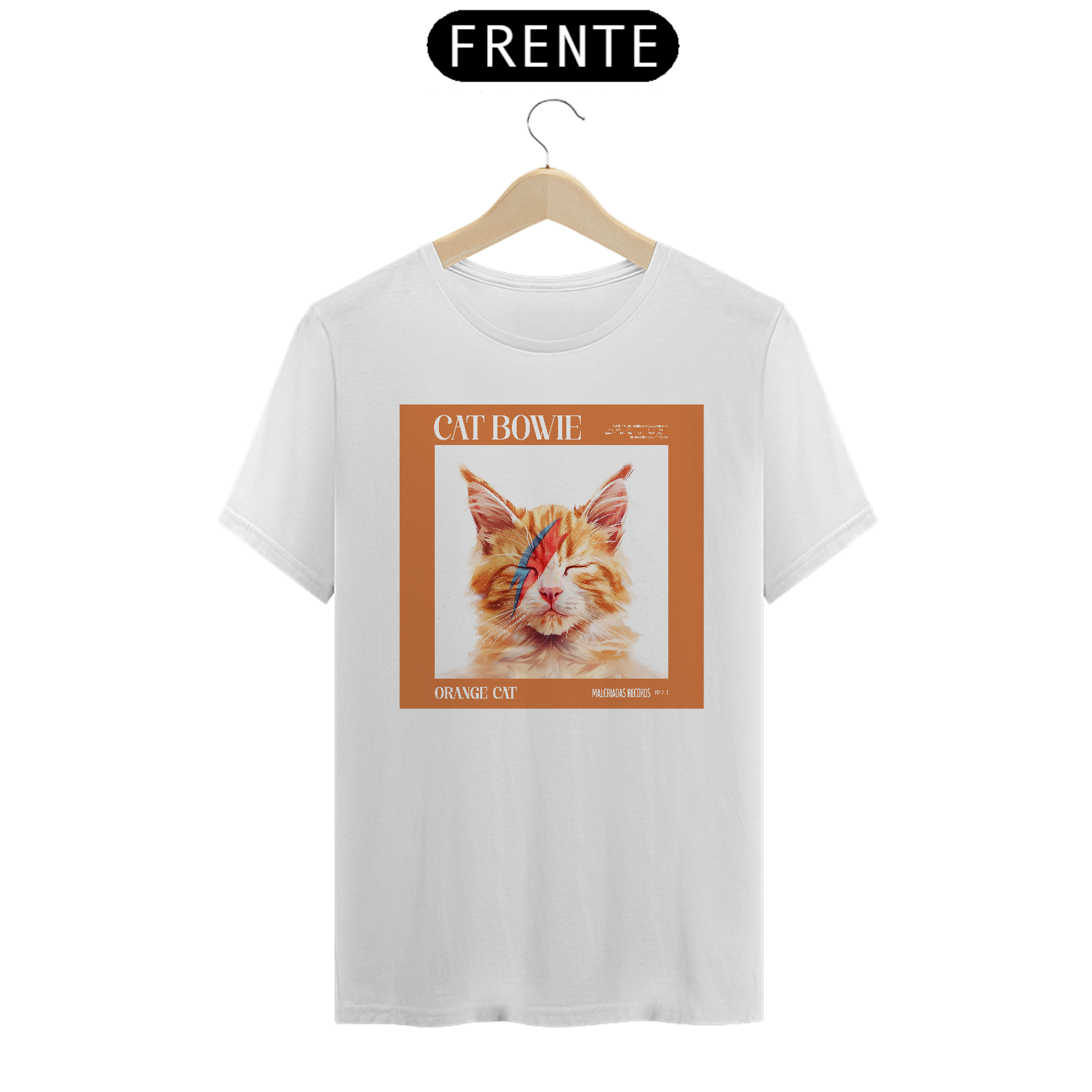 Para os amantes de música e felinos, a camiseta "Cat Bowie" traz um tributo inusitado e divertido ao icônico visual de David Bowie. Estilizado como Aladdin Sane, o gato laranja dessa estampa carrega o clássico raio azul e vermelho sobre o rosto, capturando a essência do rock e a ousadia do camaleão da música. É a mistura perfeita entre a personalidade felina e o estilo inconfundível de Bowie.