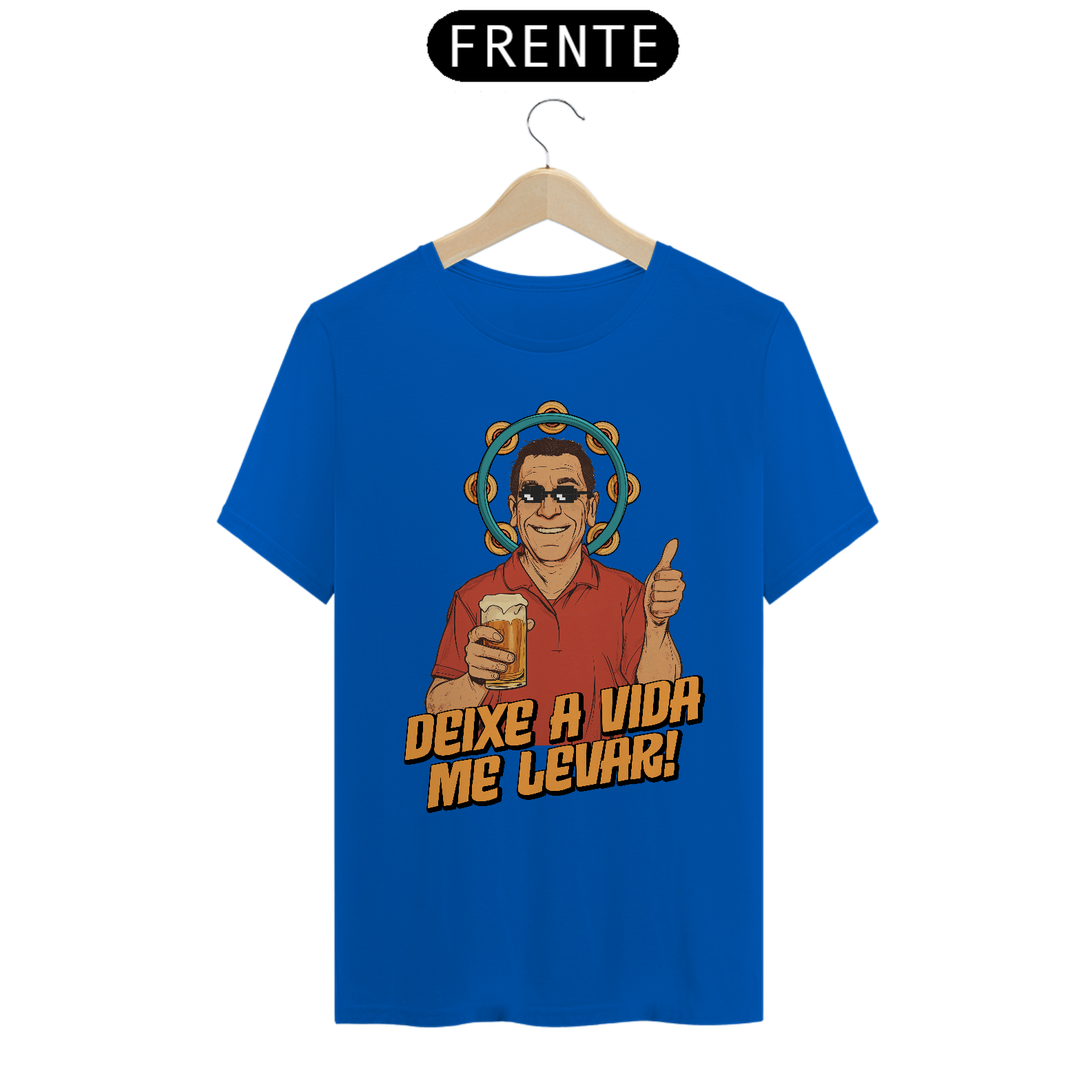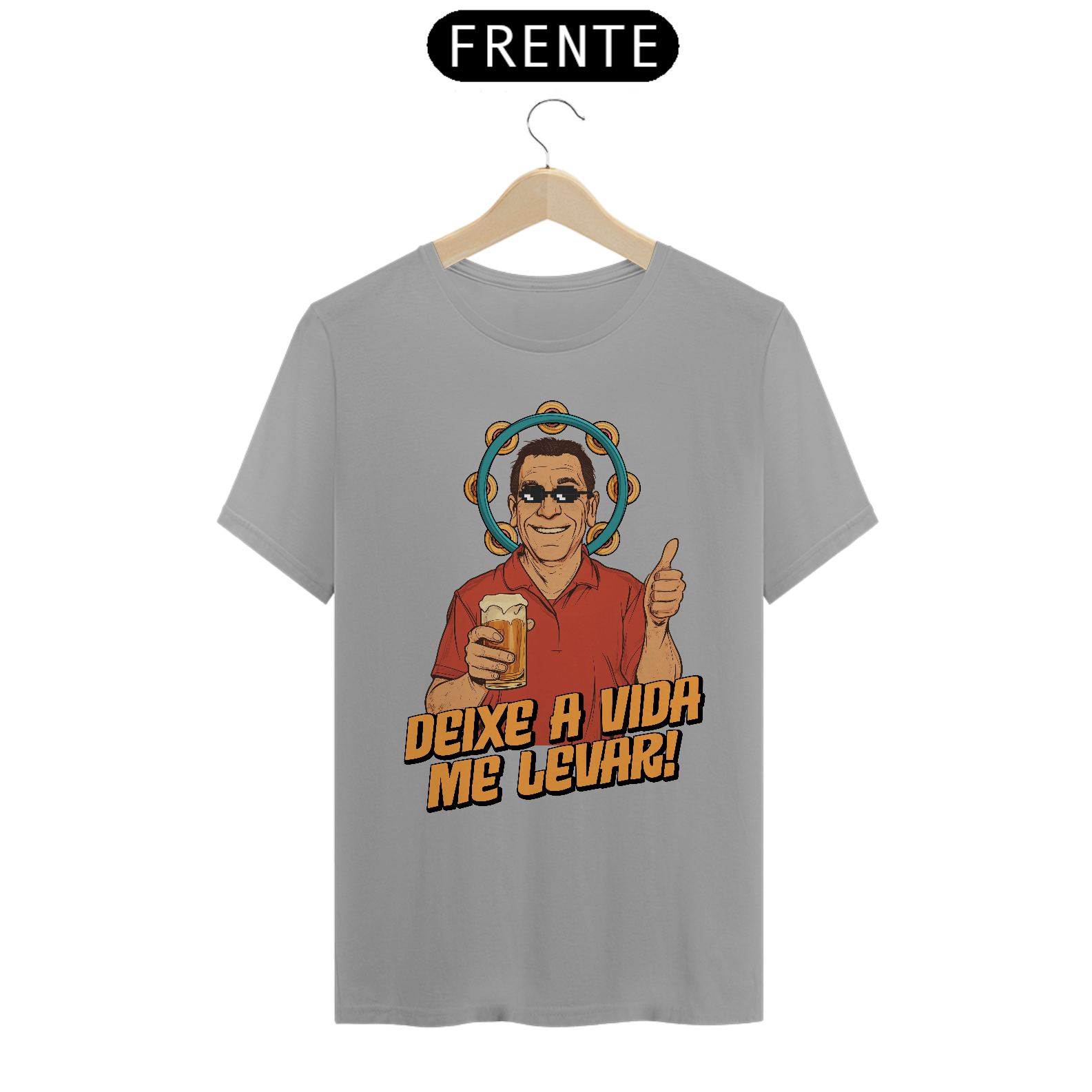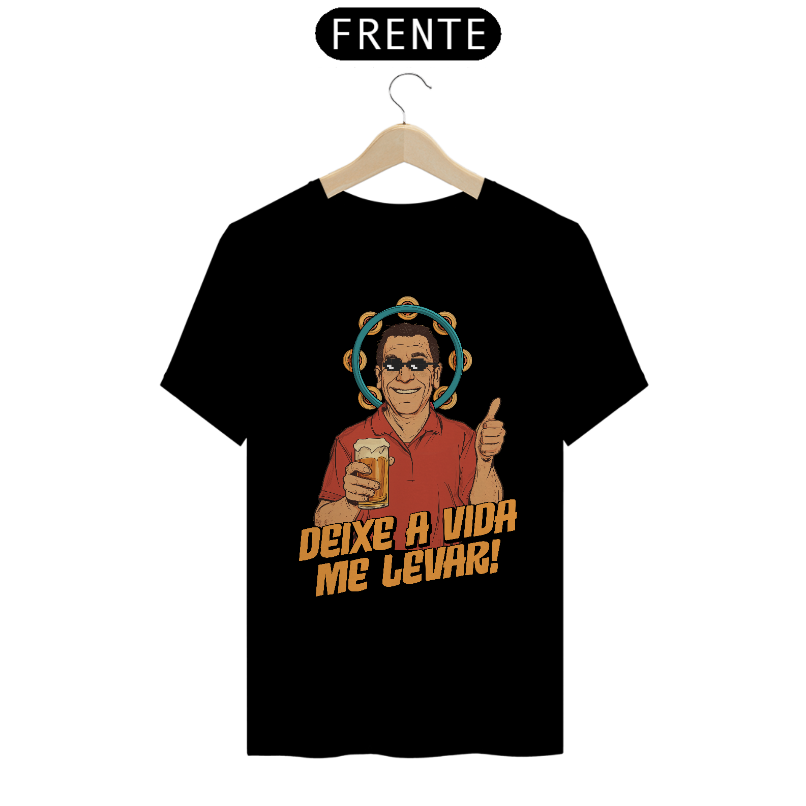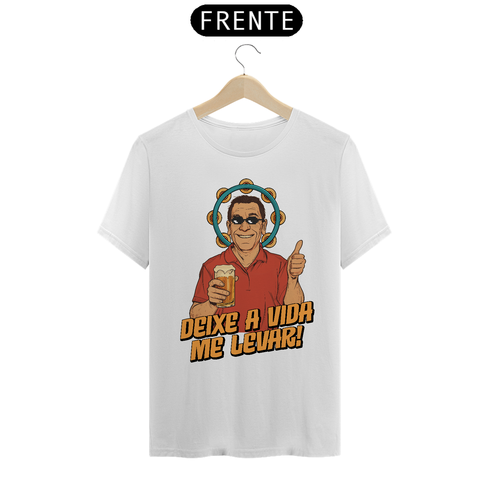 Nesta estampa irreverente e cheia de carisma, celebramos o ícone do samba brasileiro, Zeca Pagodinho, e o espírito leve e descontraído que ele traduz em suas músicas. Com um toque de humor, o design traz o cantor com óculos pixelados e sua clássica cerveja na mão, rodeado pelo pandeiro, símbolo do samba. A frase "Deixe a Vida Me Levar" captura a essência do sucesso que conquistou o Brasil e faz dessa camiseta uma homenagem perfeita para os amantes de samba e da cultura brasileira. Produzida em tecido 100% algodão, fio 30, é tão confortável quanto dançar um bom samba na roda de amigos.