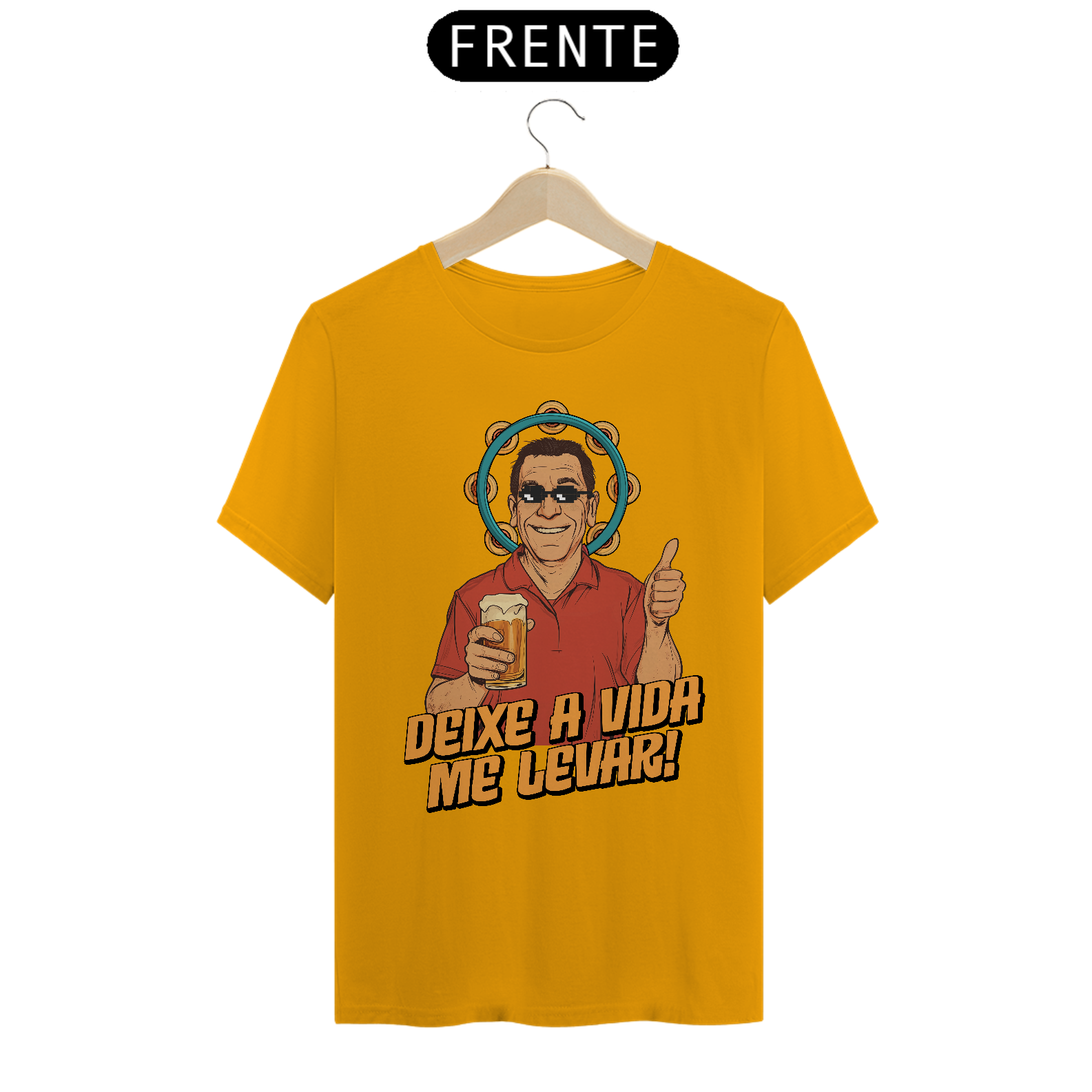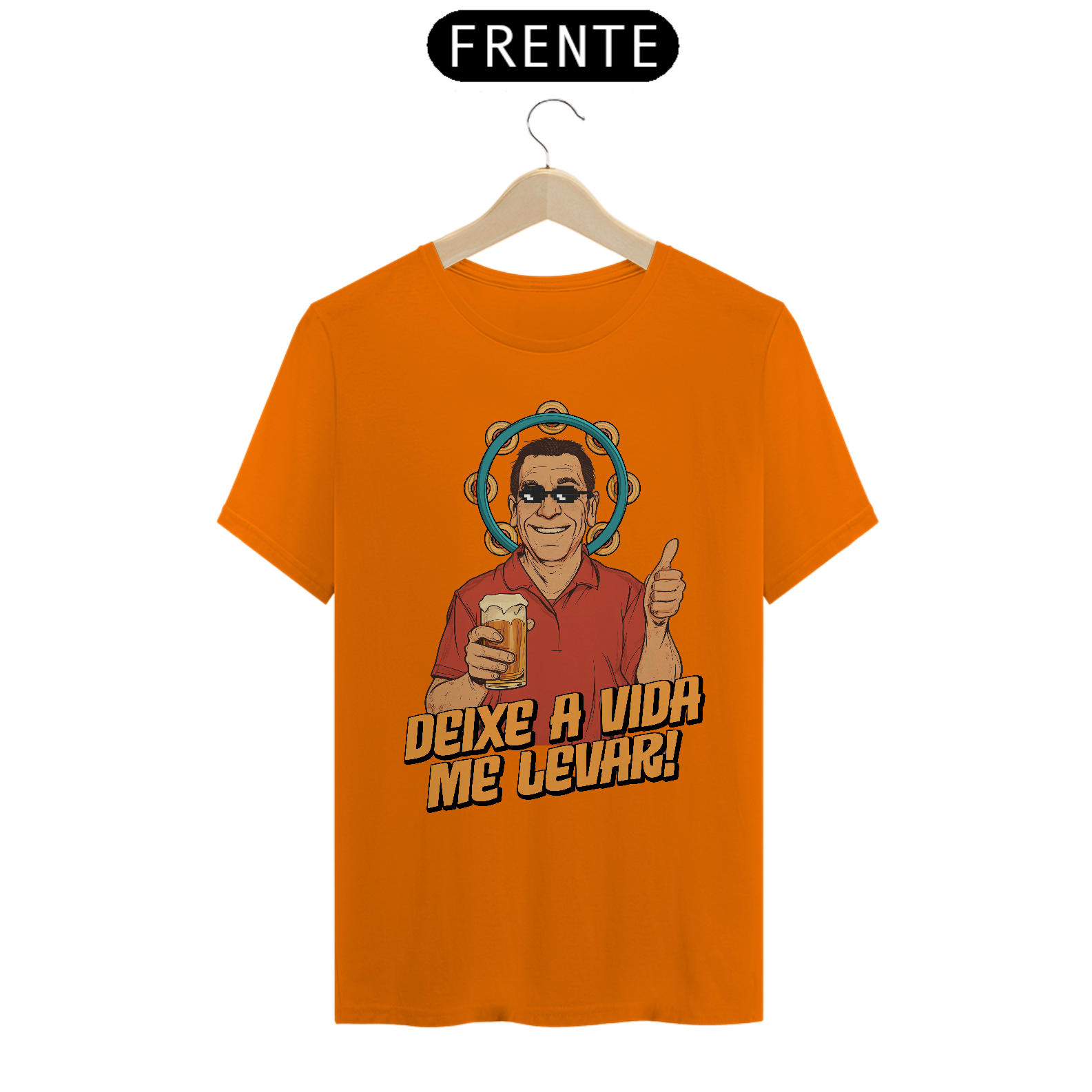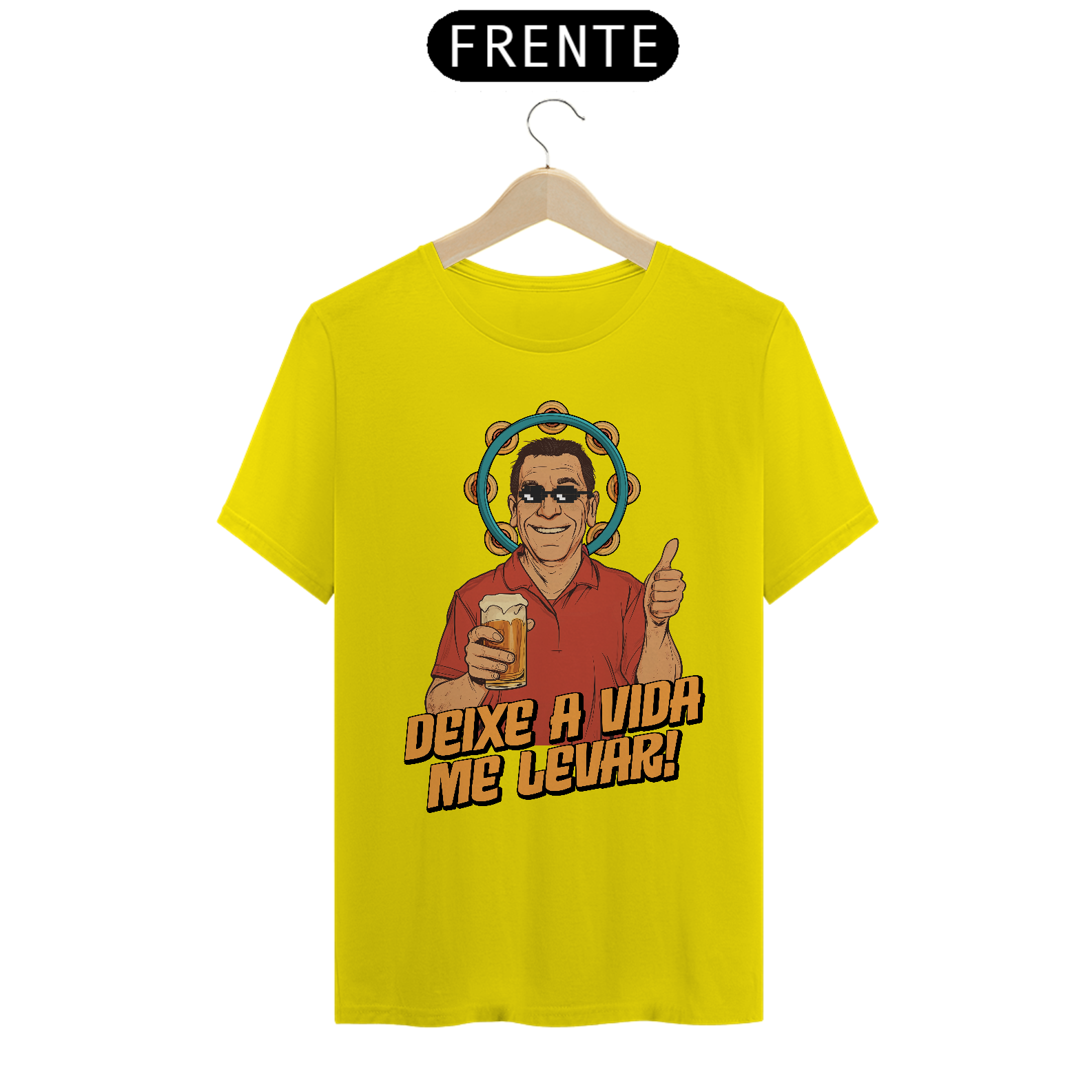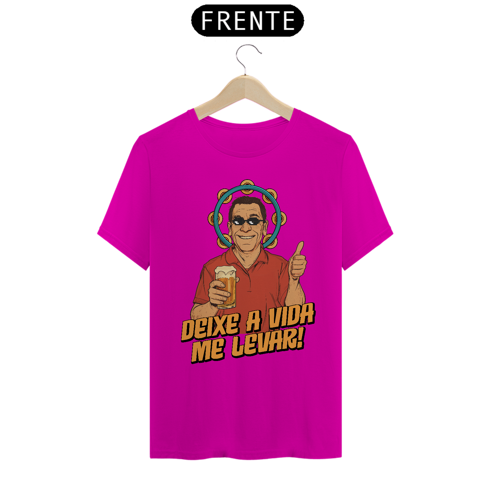 Nesta estampa irreverente e cheia de carisma, celebramos o ícone do samba brasileiro, Zeca Pagodinho, e o espírito leve e descontraído que ele traduz em suas músicas. Com um toque de humor, o design traz o cantor com óculos pixelados e sua clássica cerveja na mão, rodeado pelo pandeiro, símbolo do samba. A frase "Deixe a Vida Me Levar" captura a essência do sucesso que conquistou o Brasil e faz dessa camiseta uma homenagem perfeita para os amantes de samba e da cultura brasileira. Produzida em tecido 100% algodão, fio 30, é tão confortável quanto dançar um bom samba na roda de amigos.