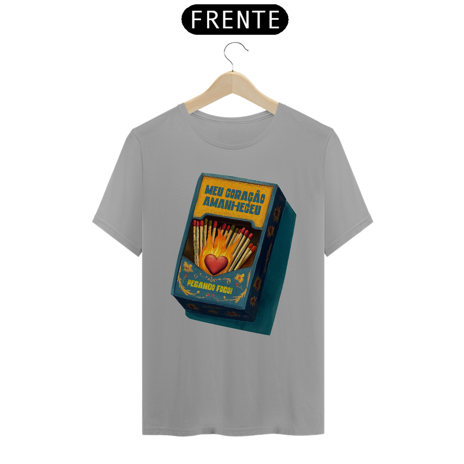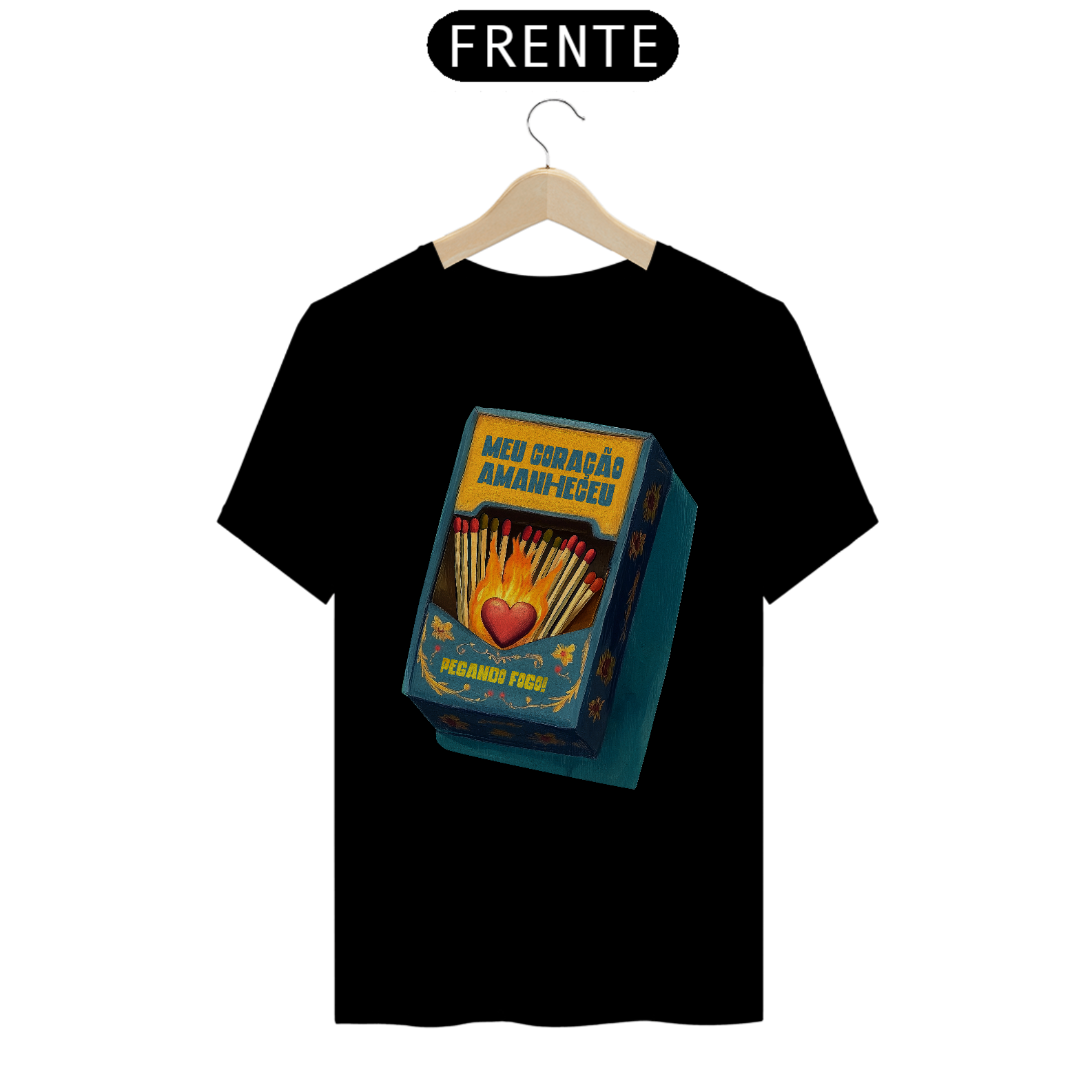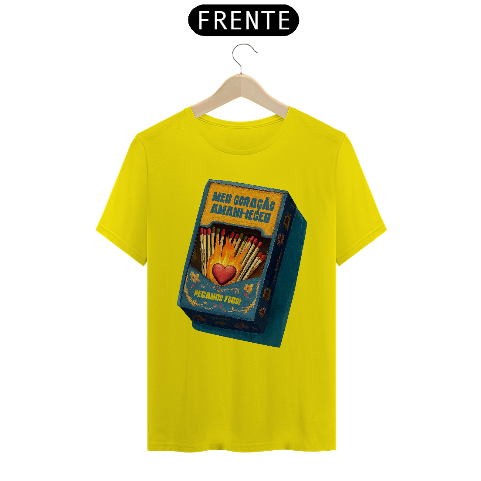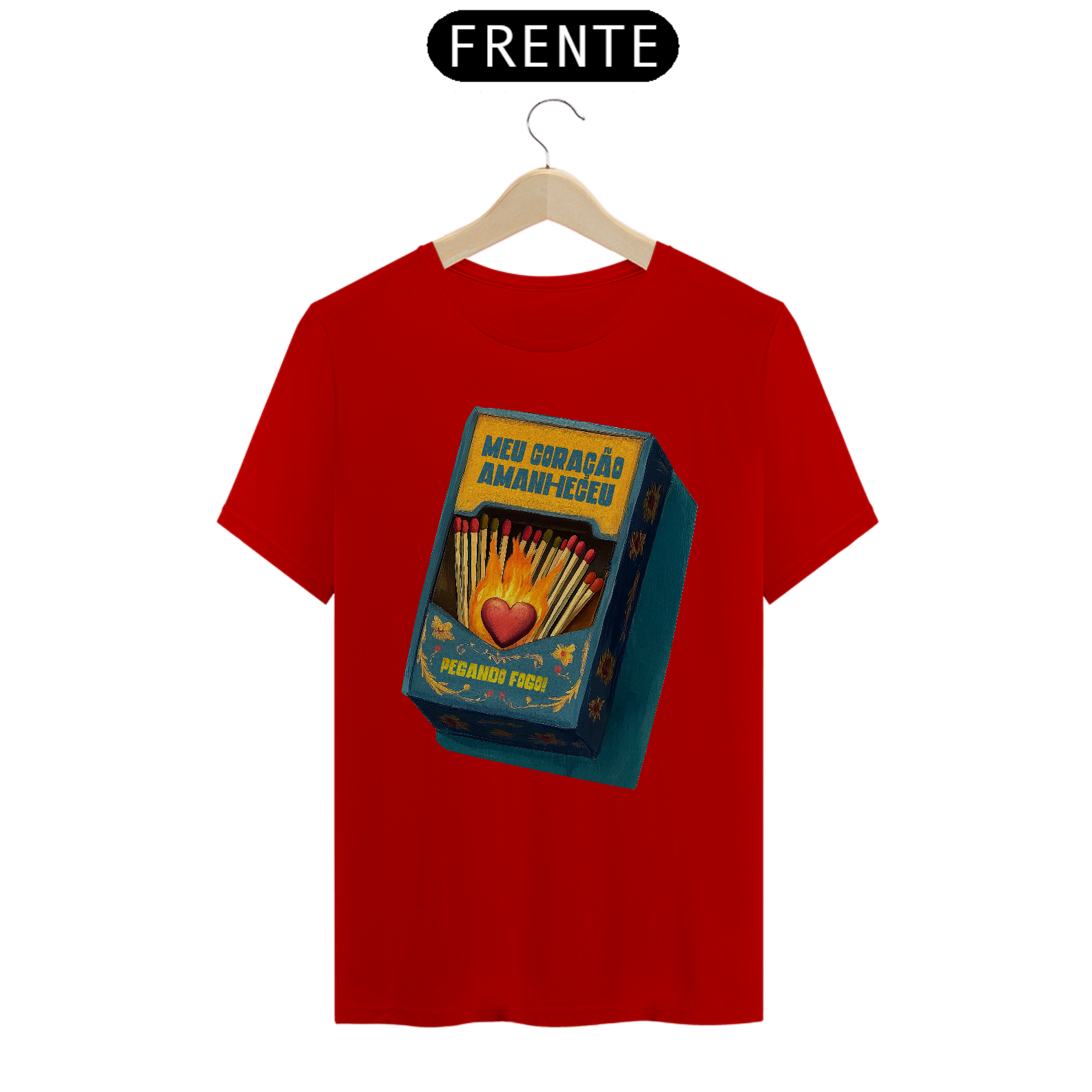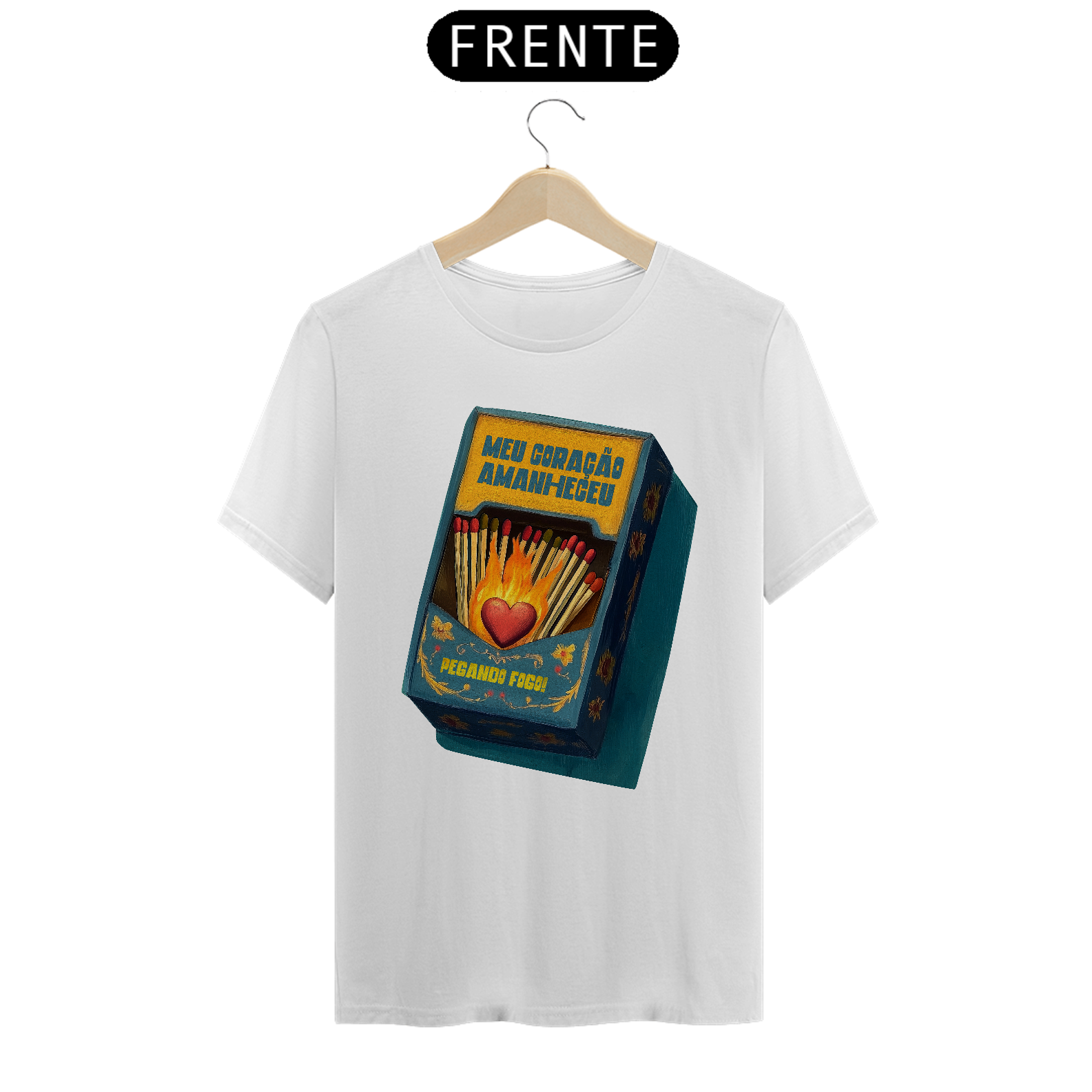 Inspirada na clássica canção da MPB imortalizada por Gal Costa, essa estampa traduz em imagem toda a paixão e intensidade da música Meu Coração Amanheceu Pegando Fogo. Com um design que remete às antigas caixas de fósforo e à arte folclórica, traz um coração em chamas cercado por palitos, pronto para incendiar qualquer sentimento.