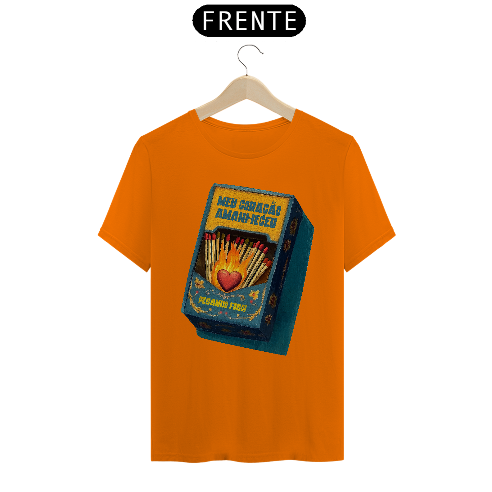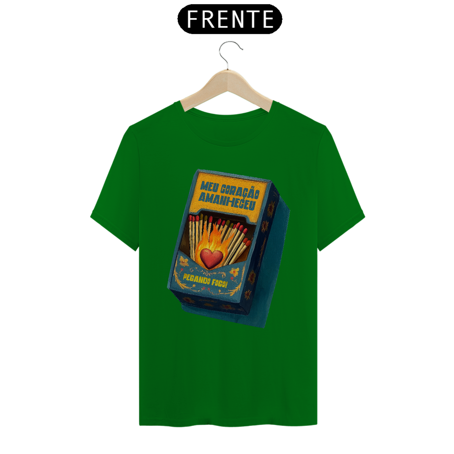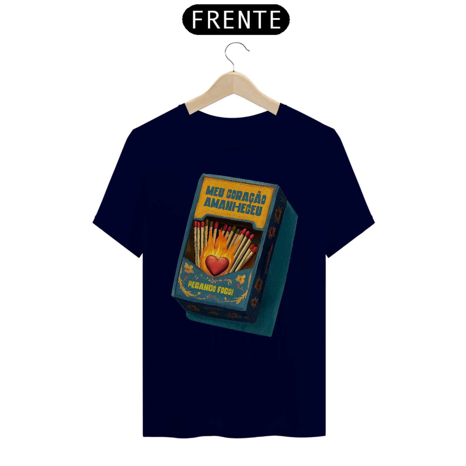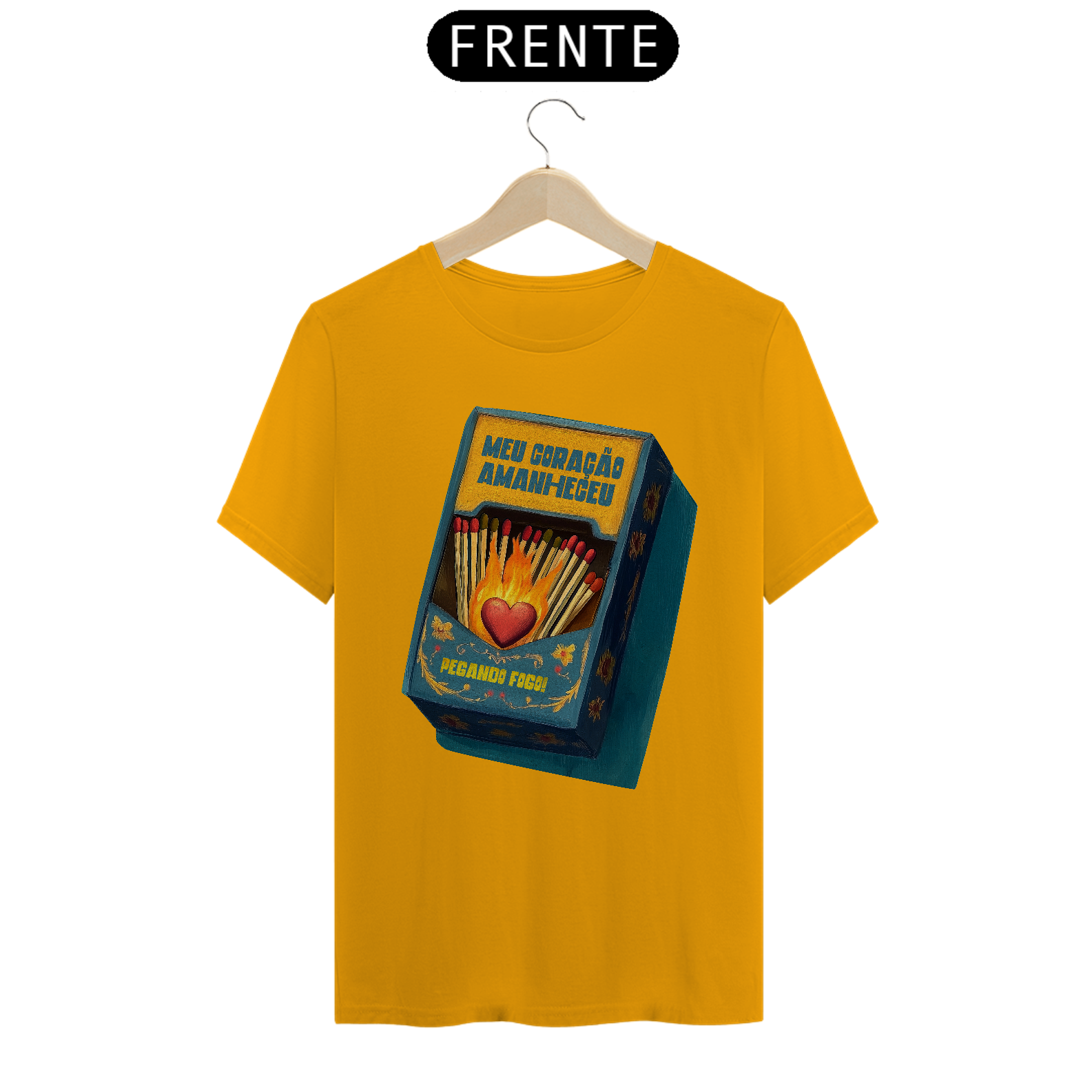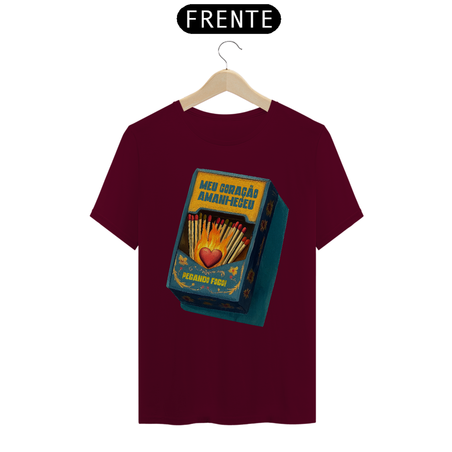Inspirada na clássica canção da MPB imortalizada por Gal Costa, essa estampa traduz em imagem toda a paixão e intensidade da música Meu Coração Amanheceu Pegando Fogo. Com um design que remete às antigas caixas de fósforo e à arte folclórica, traz um coração em chamas cercado por palitos, pronto para incendiar qualquer sentimento.