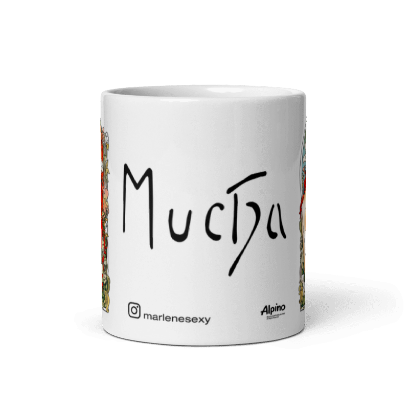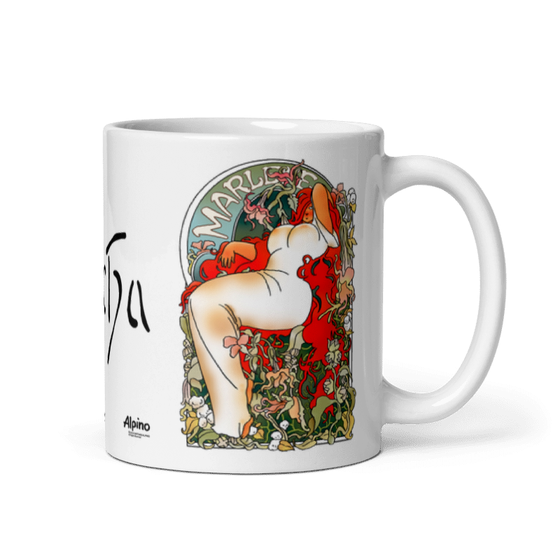 Imagine se a Marlene tivesse sido retratada pelo artista Alphonse Mucha (1860-1939). Nosso estúdio tornou isso possível criando esta caneca com a técnica do famoso ilustrador tcheco do movimento Art Nouveau.