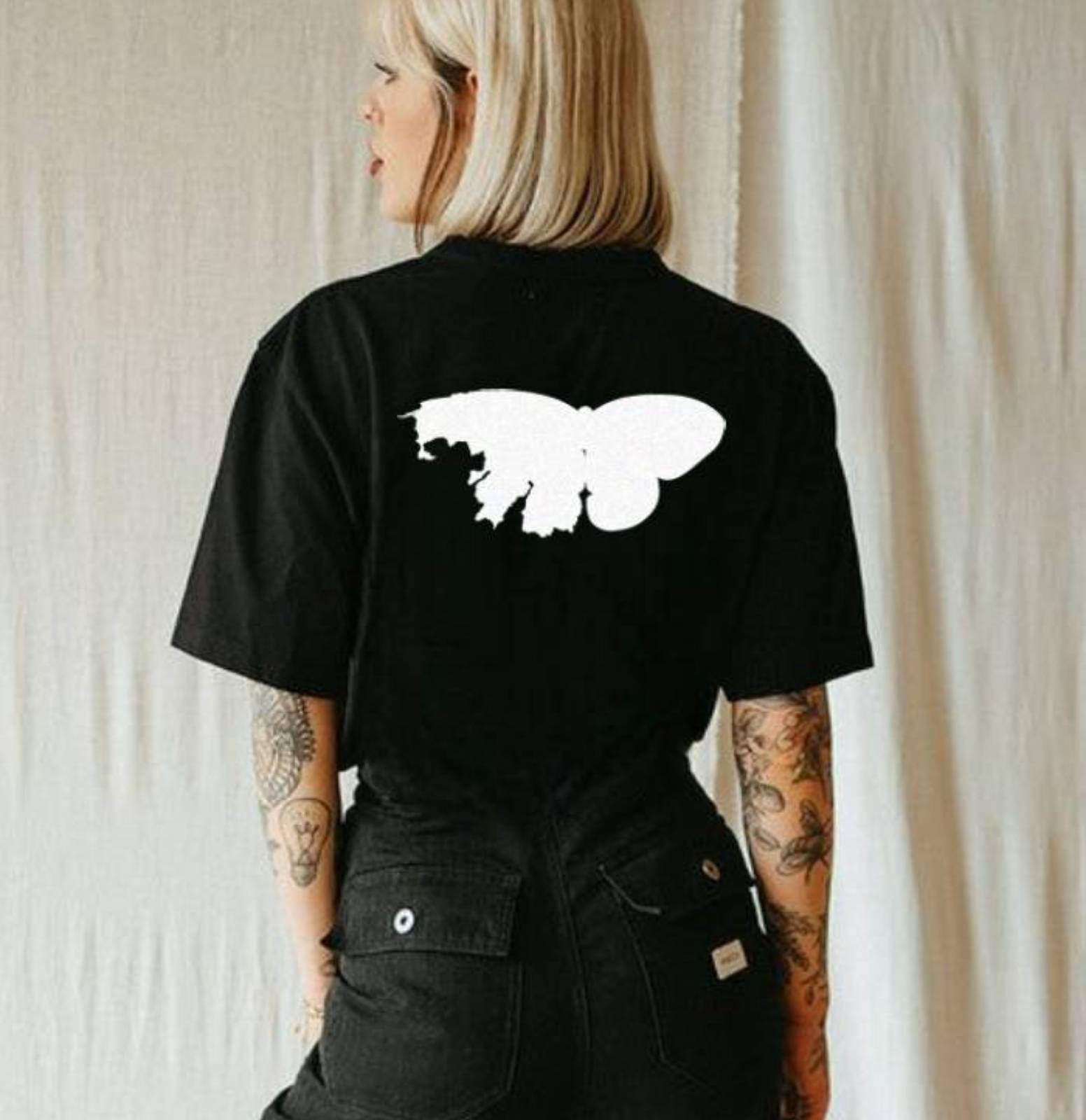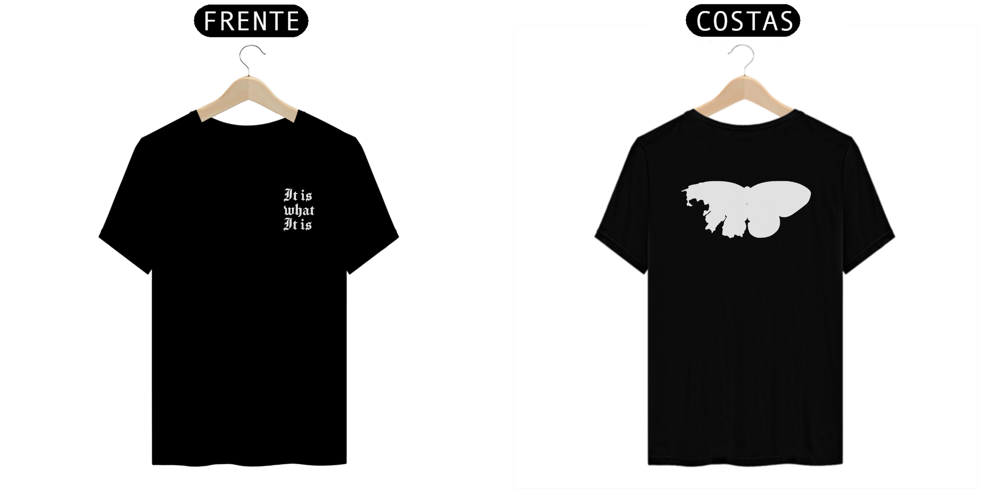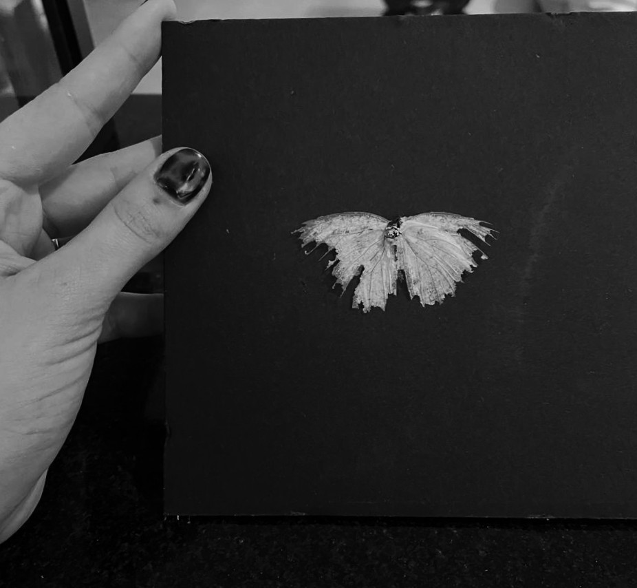 "It Is What It Is" – Algumas coisas simplesmente são o que são e está tudo bem. Esse modelo carrega mais do que uma estampa; traz um pedaço da minha história. A borboleta das costas é de um quadro que guardei por anos (foto final), representando ciclos, perdas e renascimentos. De um lado, inteira; do outro, se desfazendo. Porque às vezes, nem tudo precisa ser consertado, apenas compreendido.