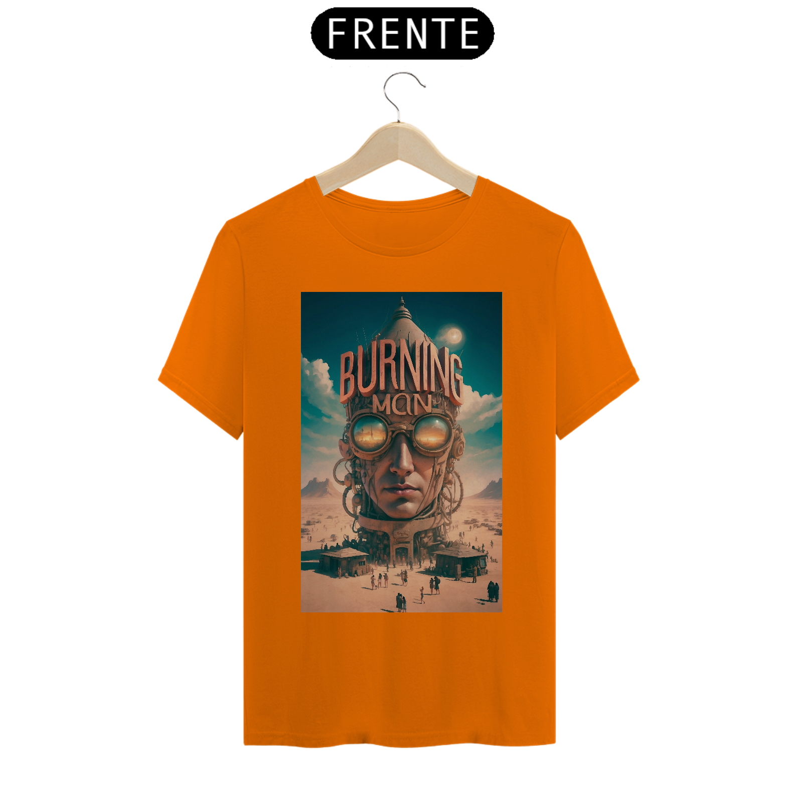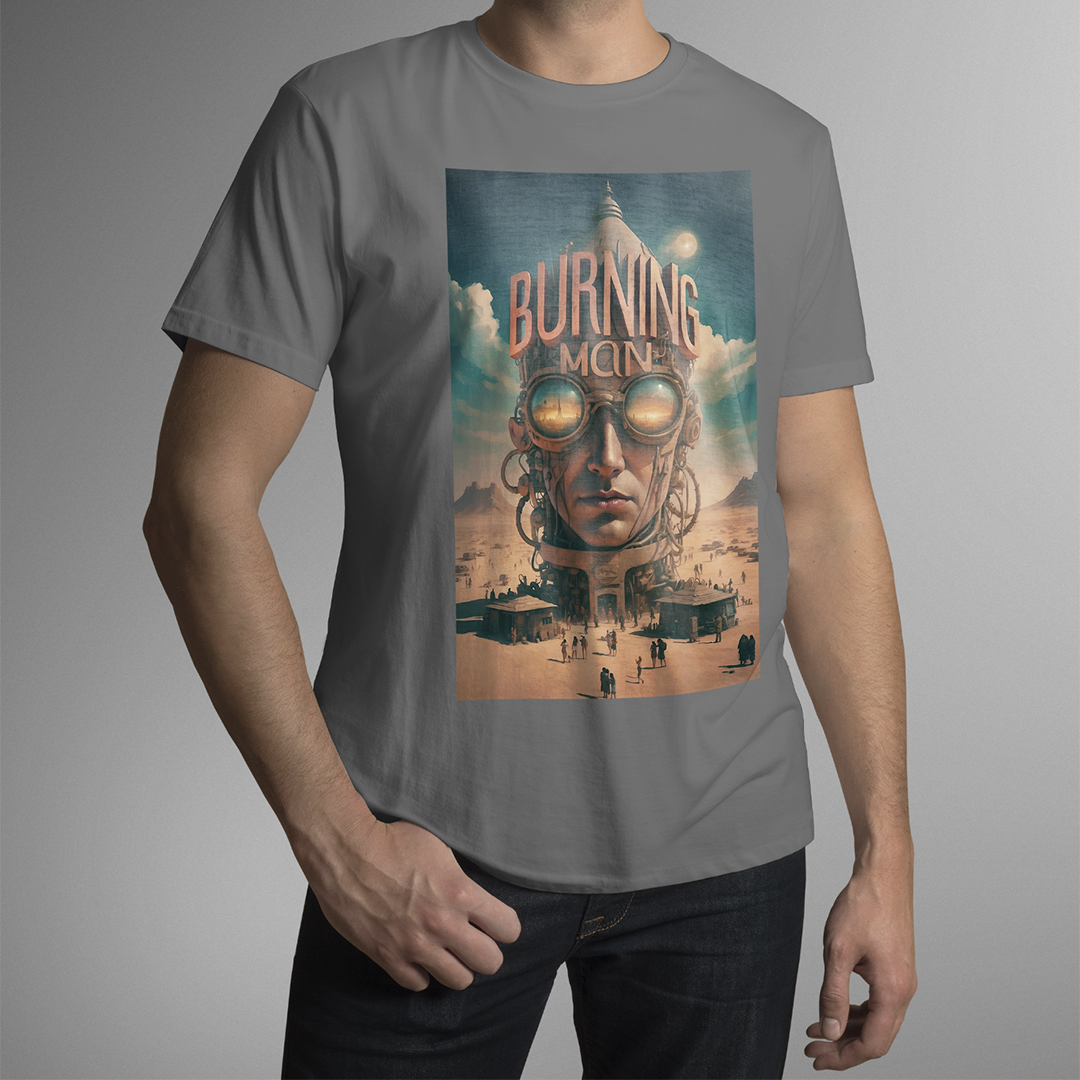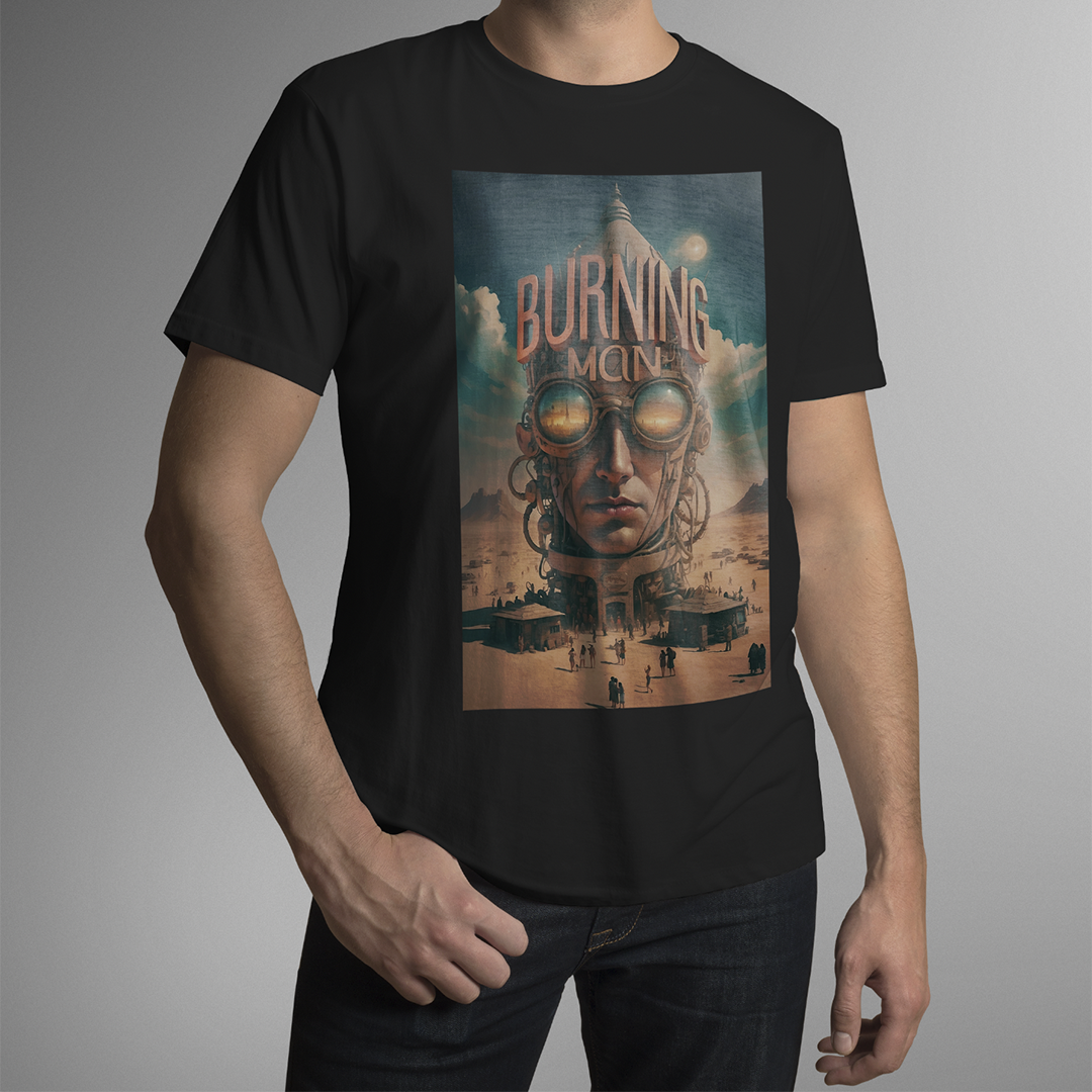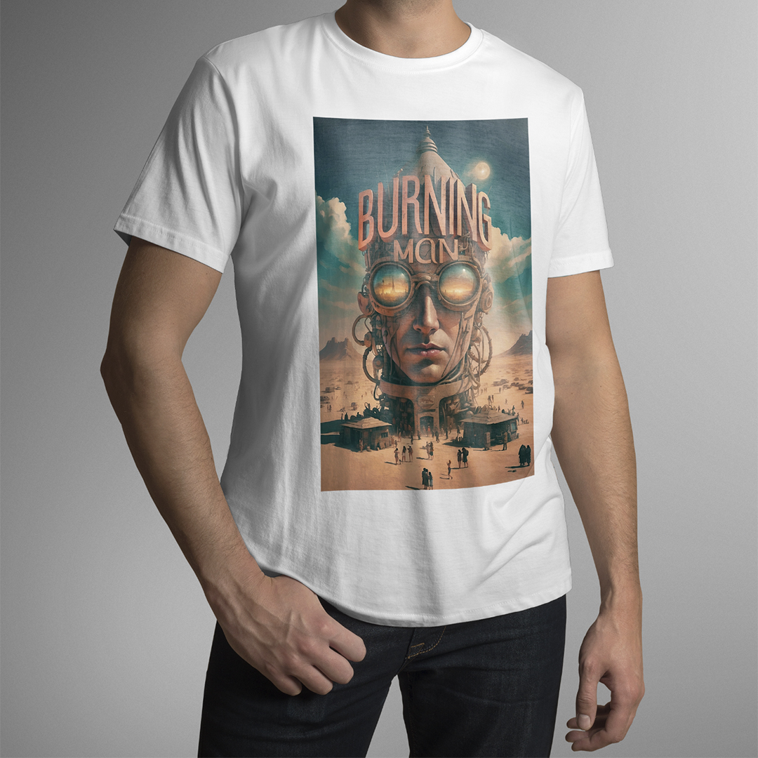 T-SHIRT BURNING MAN: esta estampa representa o festival Burning Man de contracultura realizado anualmente no deserto de Black Rock, Nevada, EUA. Durante uma semana, milhares de participantes vivem em uma comunidade temporária, explorando expressões artísticas, autoexpressão, colaboração e sustentabilidade. O evento é conhecido por suas esculturas gigantes, instalações de arte interativas, música eletrônica, rituais de queima de esculturas e o princípio de "deixar sem deixar vestígios", enfatizando o respeito ao meio ambiente.