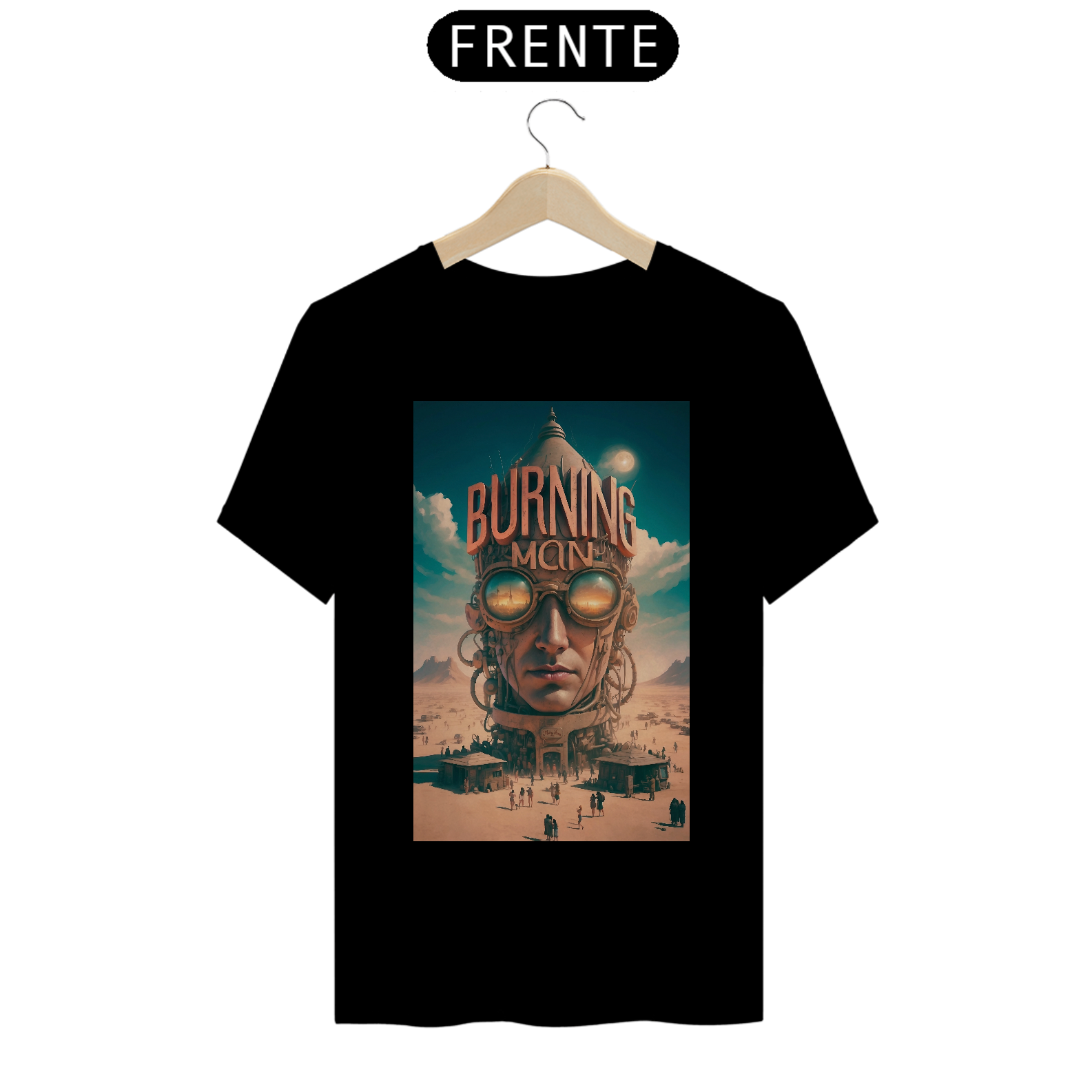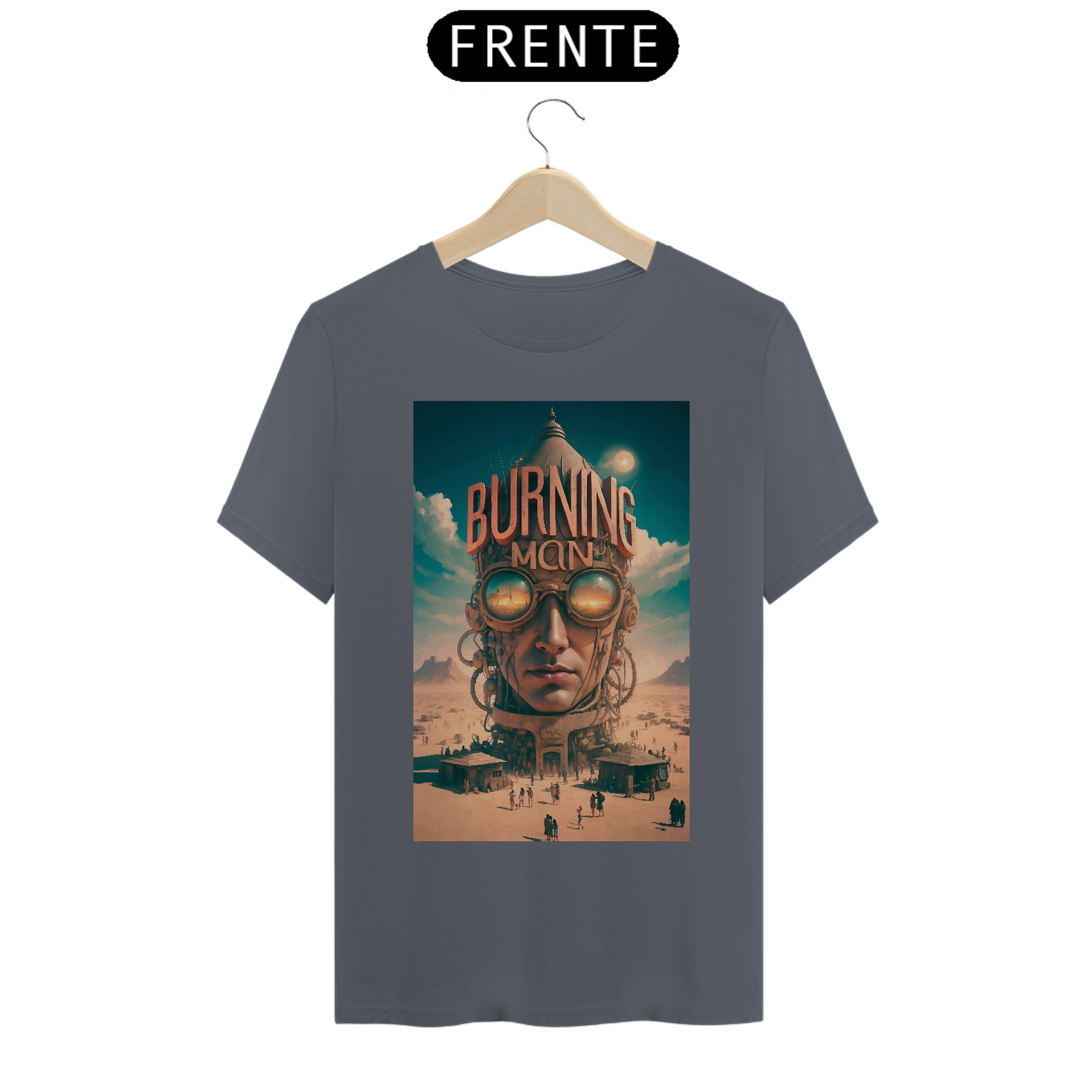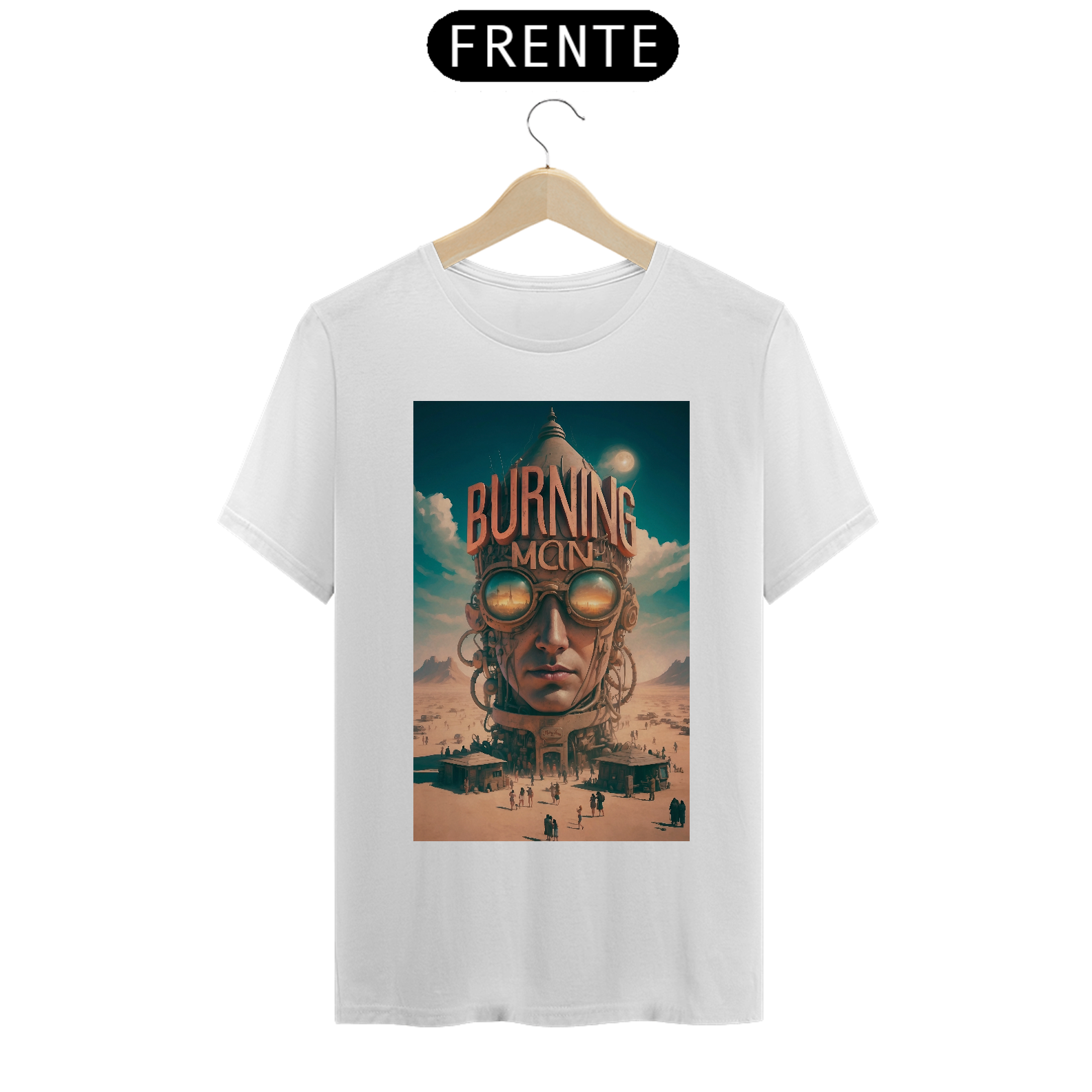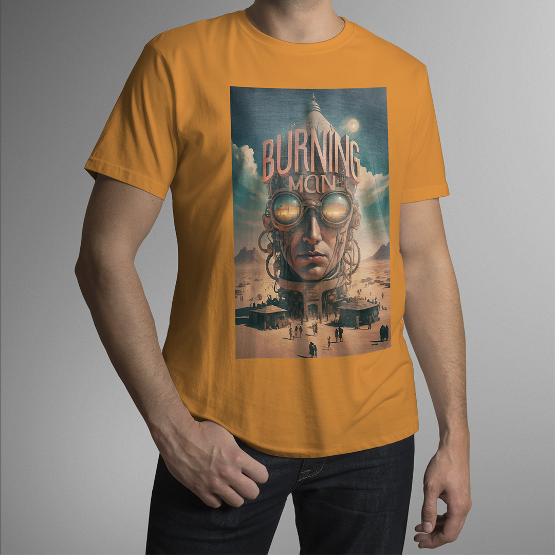 T-SHIRT BURNING MAN: esta estampa representa o festival Burning Man de contracultura realizado anualmente no deserto de Black Rock, Nevada, EUA. Durante uma semana, milhares de participantes vivem em uma comunidade temporária, explorando expressões artísticas, autoexpressão, colaboração e sustentabilidade. O evento é conhecido por suas esculturas gigantes, instalações de arte interativas, música eletrônica, rituais de queima de esculturas e o princípio de "deixar sem deixar vestígios", enfatizando o respeito ao meio ambiente.