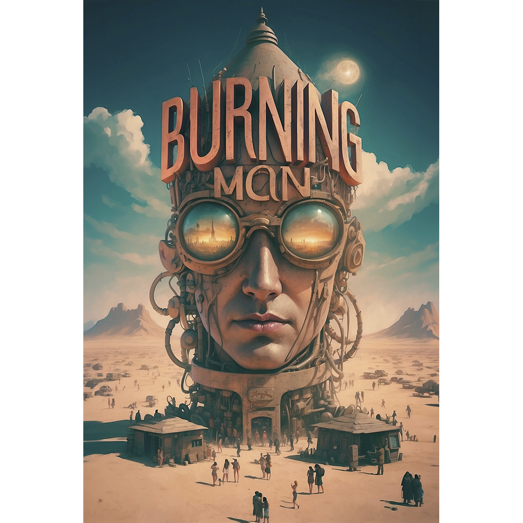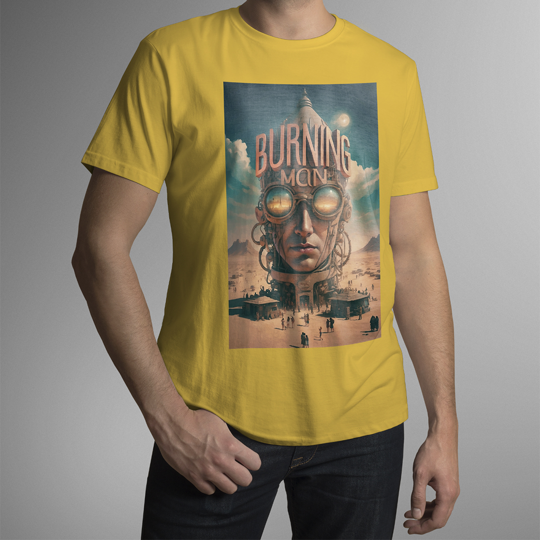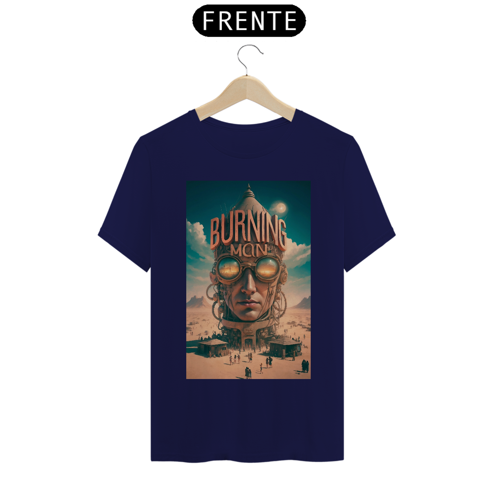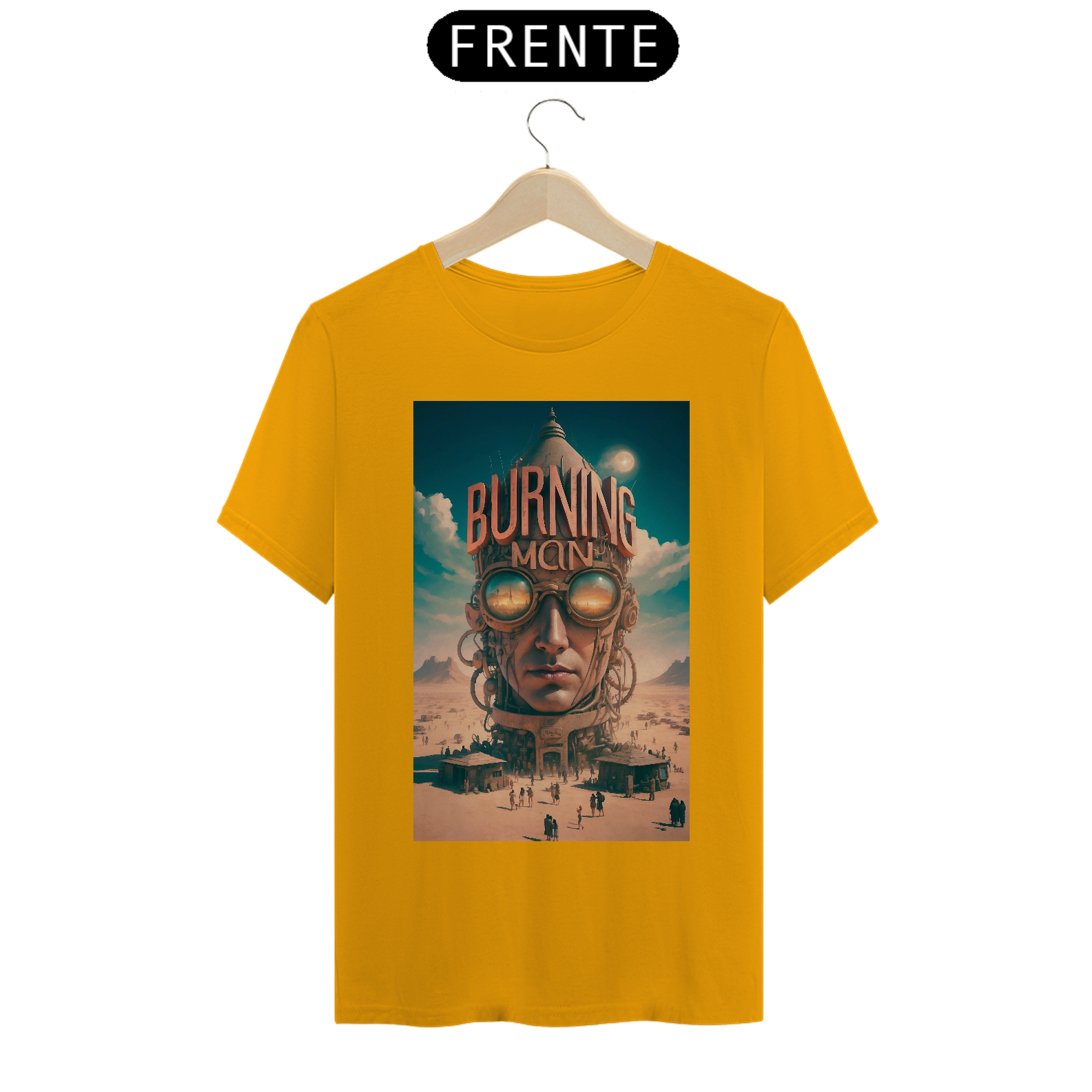 T-SHIRT BURNING MAN: esta estampa representa o festival Burning Man de contracultura realizado anualmente no deserto de Black Rock, Nevada, EUA. Durante uma semana, milhares de participantes vivem em uma comunidade temporária, explorando expressões artísticas, autoexpressão, colaboração e sustentabilidade. O evento é conhecido por suas esculturas gigantes, instalações de arte interativas, música eletrônica, rituais de queima de esculturas e o princípio de "deixar sem deixar vestígios", enfatizando o respeito ao meio ambiente.