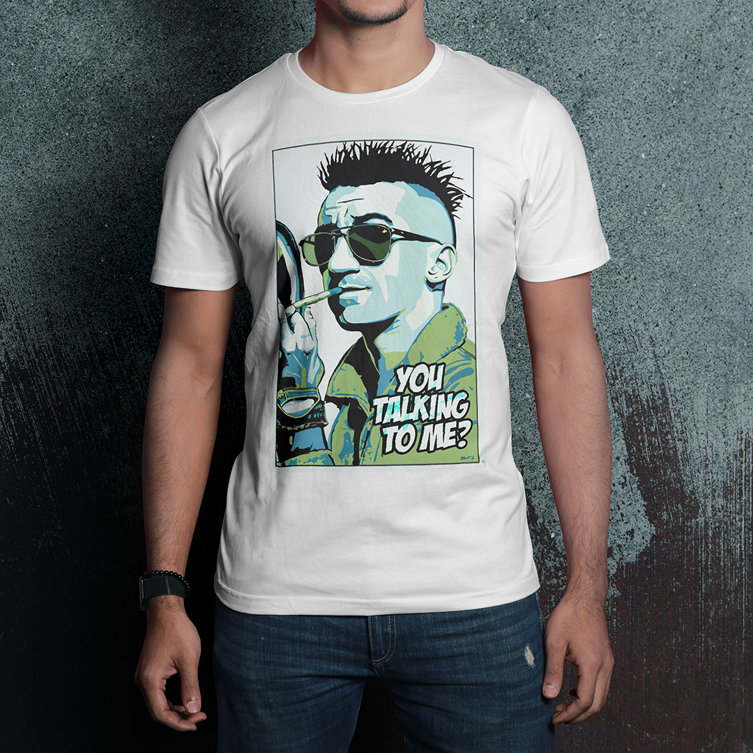 As estampas das camisetas verde, laranja, azul e preto, a aplicação da estampa é monocromática para gerar um efeito de transparência. A estampa da camiseta branca é colorida.