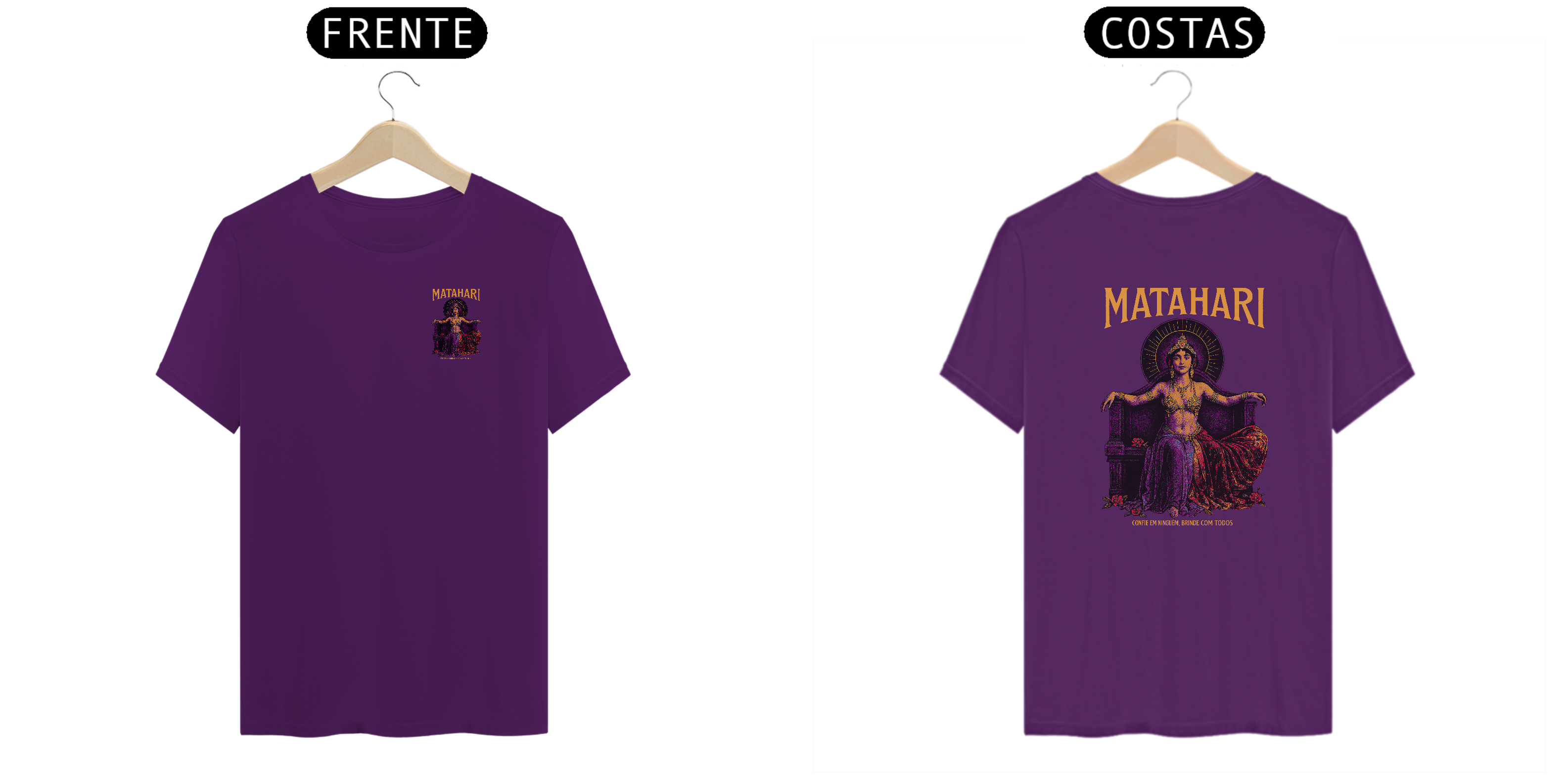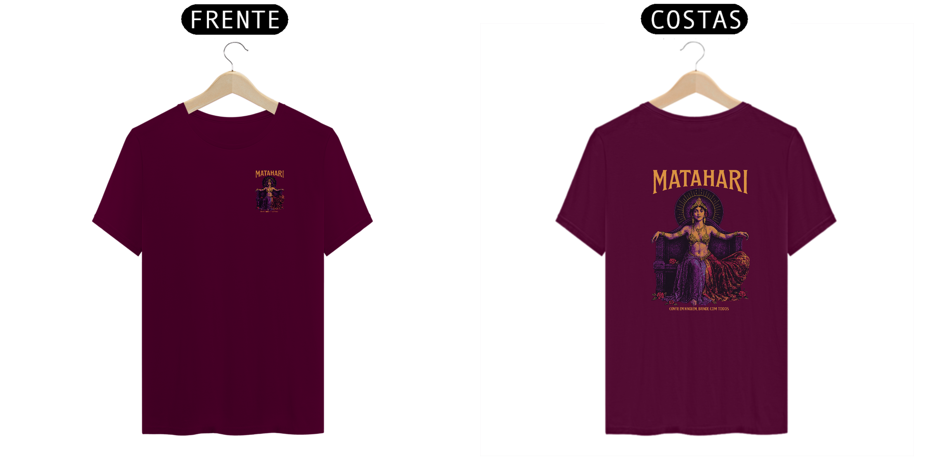 Misteriosa, icônica e provocante, esta estampa traz a figura de Matahari como um icone do underground — poderosa e serena em seu trono, cercada por rosas e um brilho dourado que hipnotiza. A frase “Confie em ninguém, brinde com todos” traduz o espírito irreverente e libertário do lendário bar alternativo que inspirou a peça. Com tons intensos de púrpura, dourado e vinho, essa camiseta é mais que uma roupa: é um relicário noturno de quem vive a margem, celebrando o caos com elegancia...