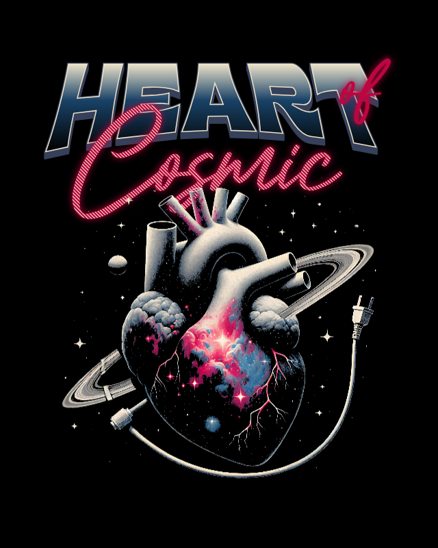 Além disso, a ilustração incorpora cabos e conectores, reforçando uma estética cyberpunk e tecnológica, sugerindo uma conexão entre o humano e o digital. A tipografia do texto "HEART of Cosmic" combina um estilo metálico futurista com um toque neon, evocando referências dos anos 80 e ficção científica.