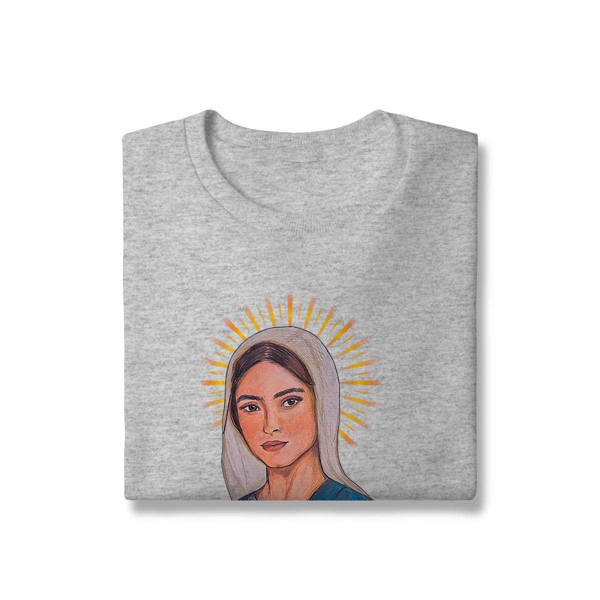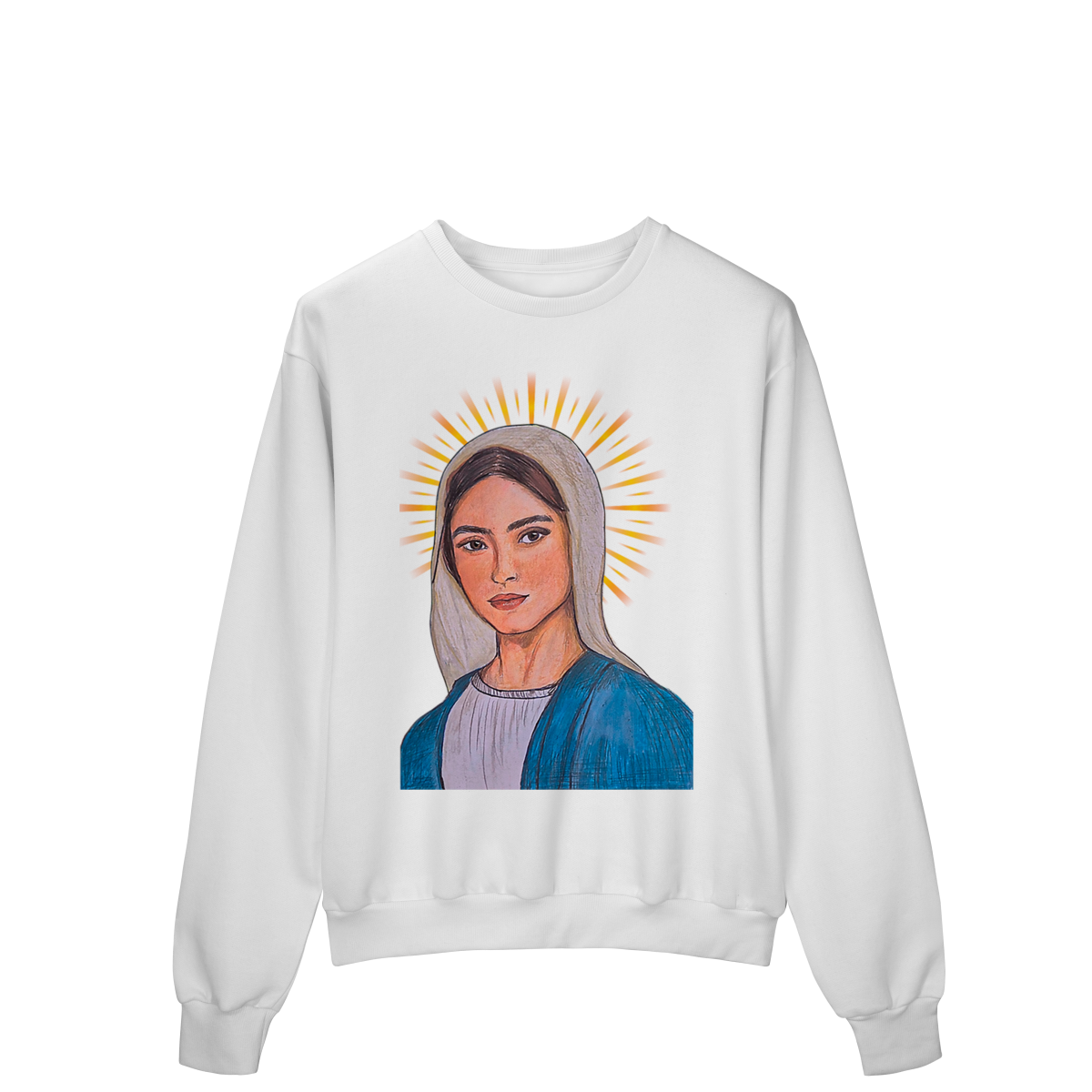 O Moletom Prime – Eis Aqui a Tua Mãe traz uma estampa cheia de significado, com traços realistas, cores suaves e uma presença acolhedora. A arte frontal destaca serenidade e devoção, enquanto nas costas aparece a citação bíblica:
