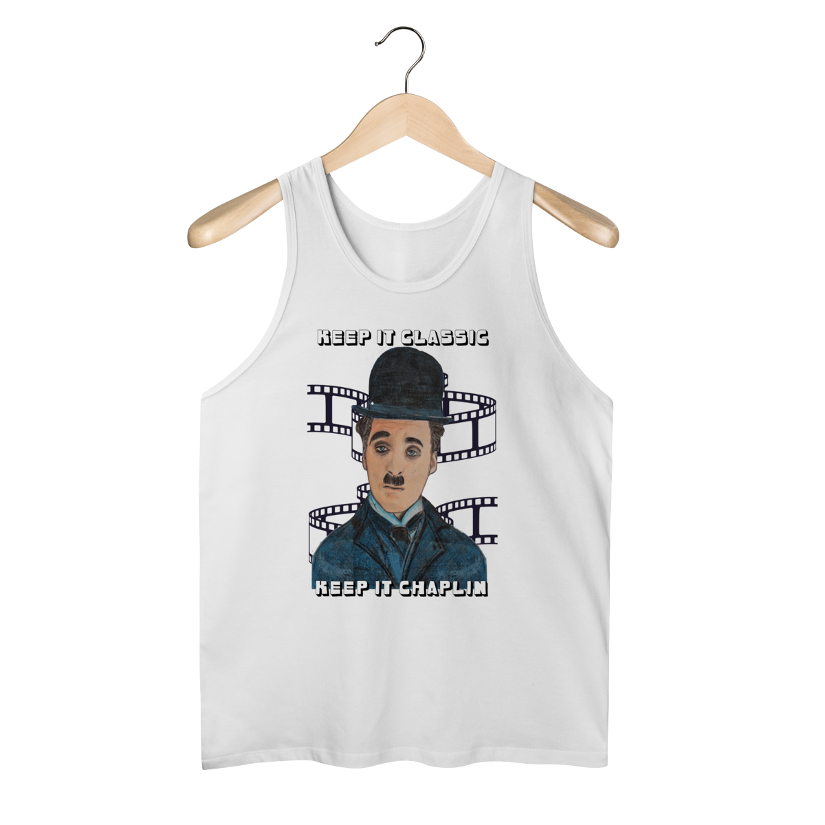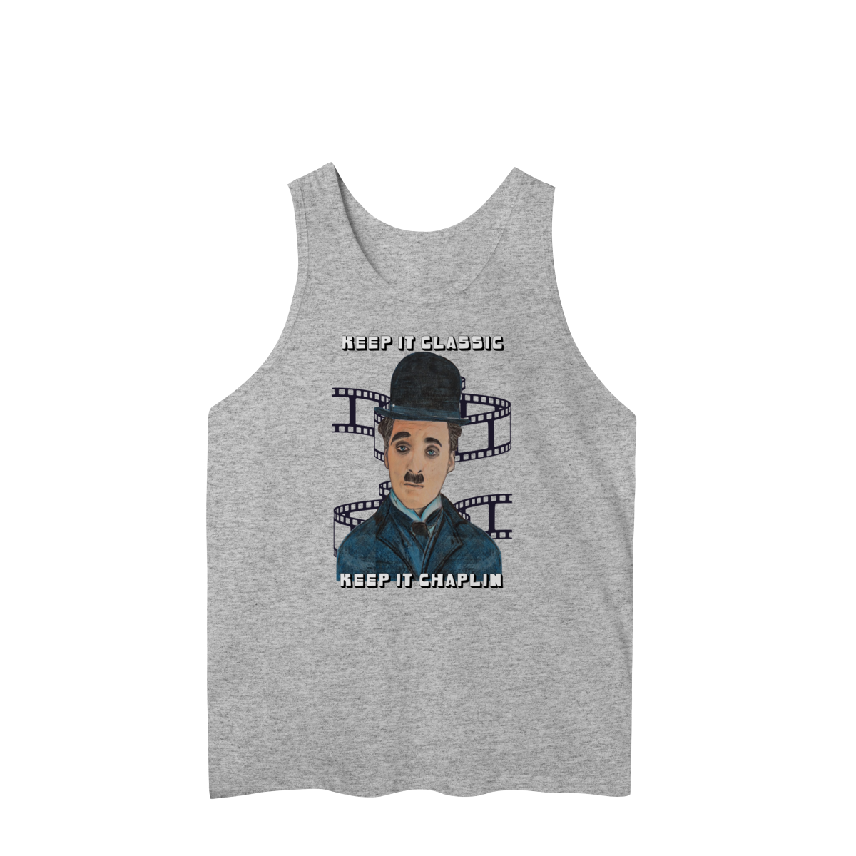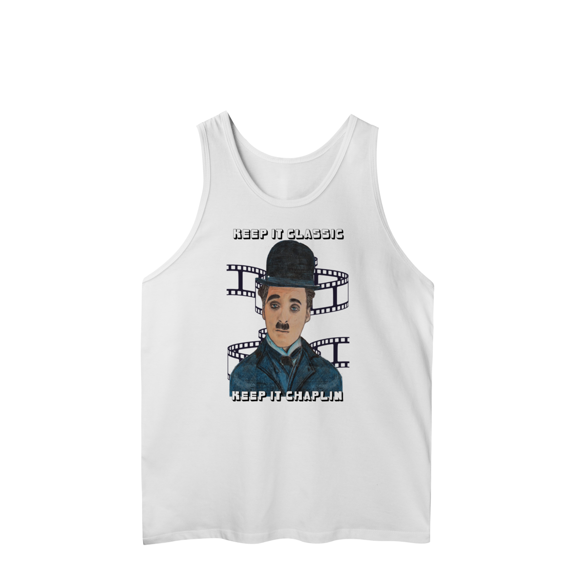 A Regata Masculina Quality – Keep It Classic, Keep It Chaplin traz estilo e personalidade com uma estampa inspirada no charme clássico de Chaplin. O design destaca o personagem em traços artísticos, acompanhado da frase marcante que celebra o cinema atemporal.