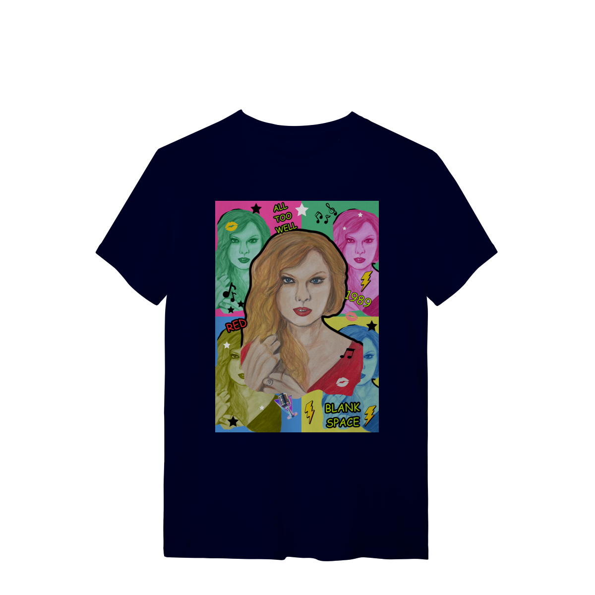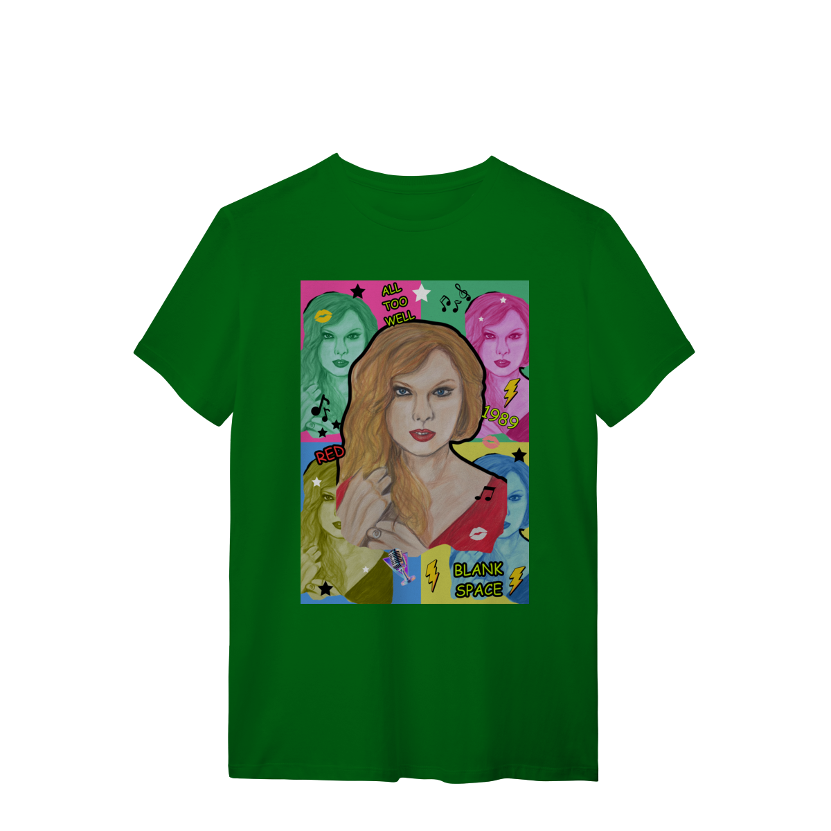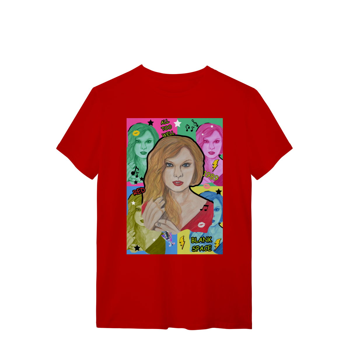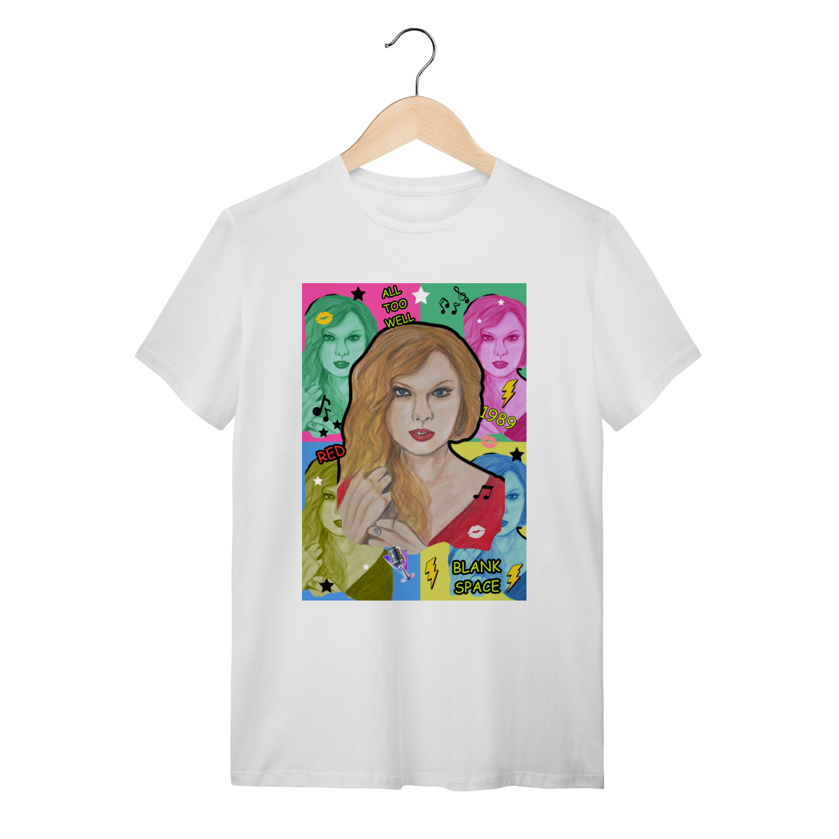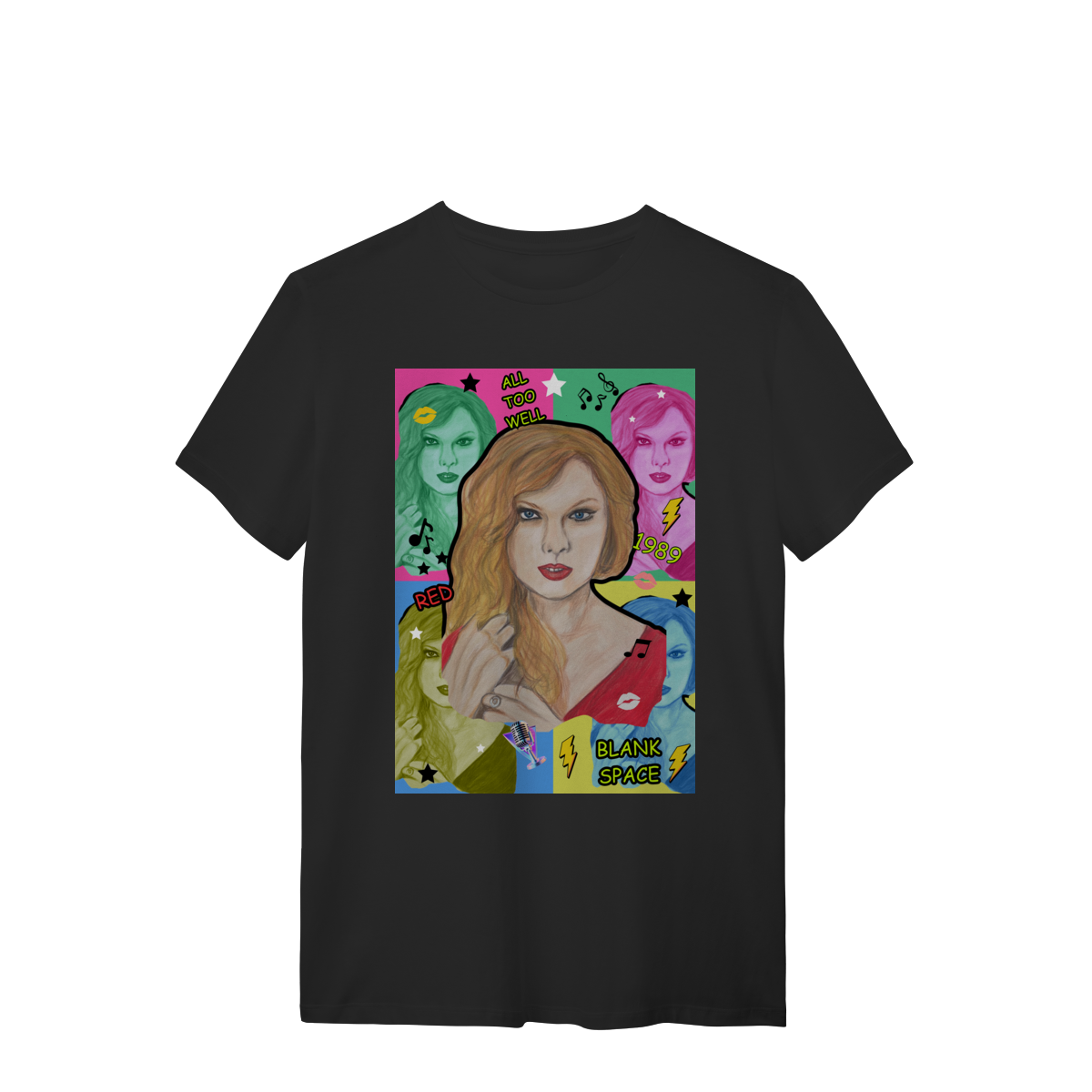 A T-Shirt Quality Swift Pop Collage traz uma arte exclusiva em estilo pop art, celebrando diferentes eras e sucessos de Taylor Swift. O retrato principal, feito à mão, é combinado com versões coloridas da cantora, ícones musicais e referências a faixas como All Too Well, Red, 1989 e Blank Space.