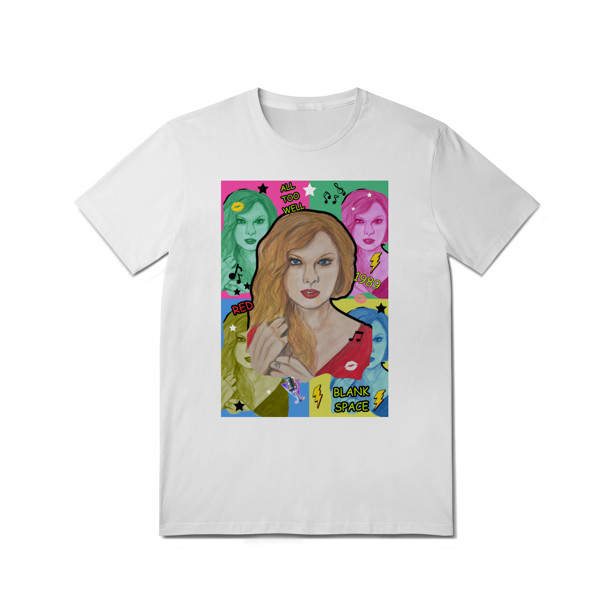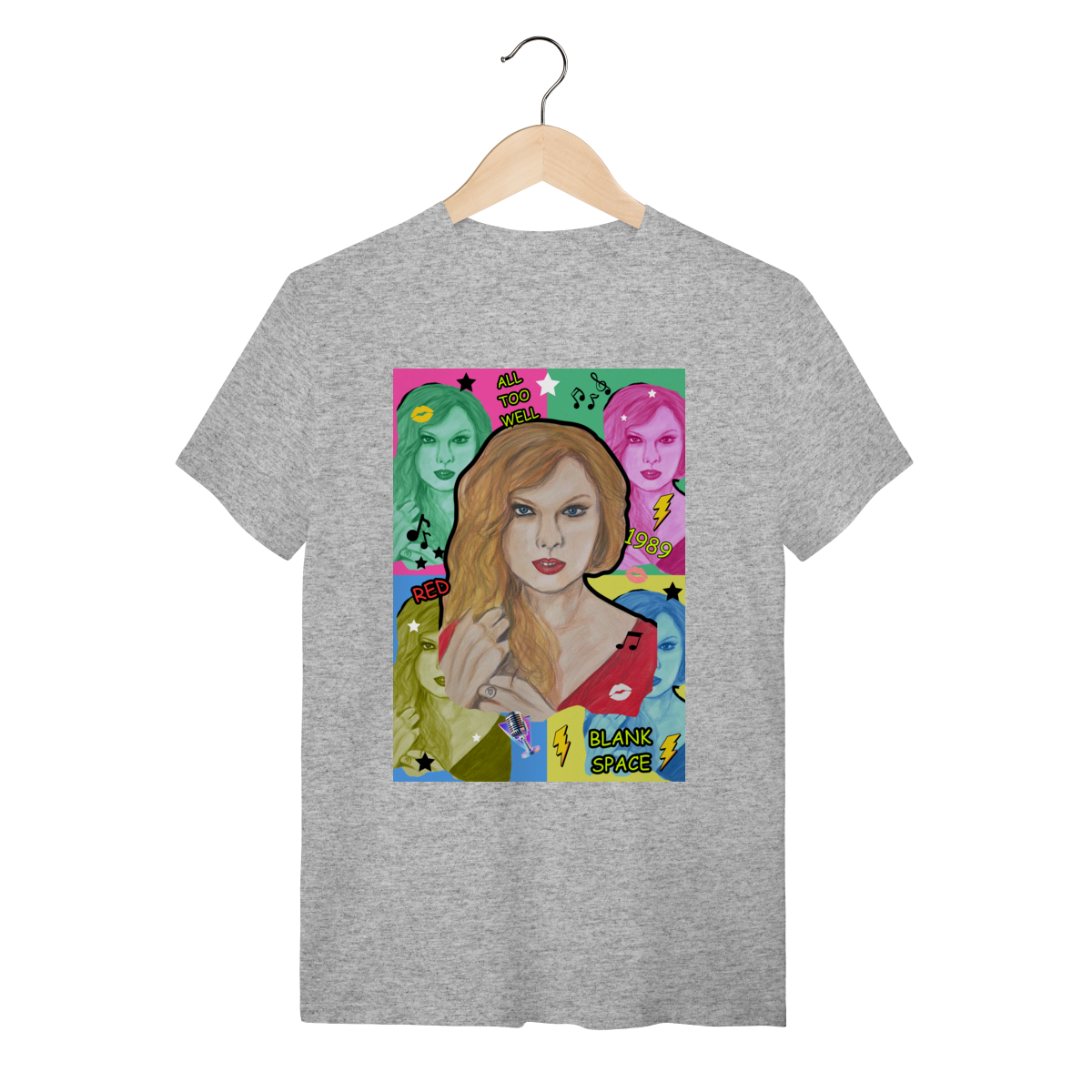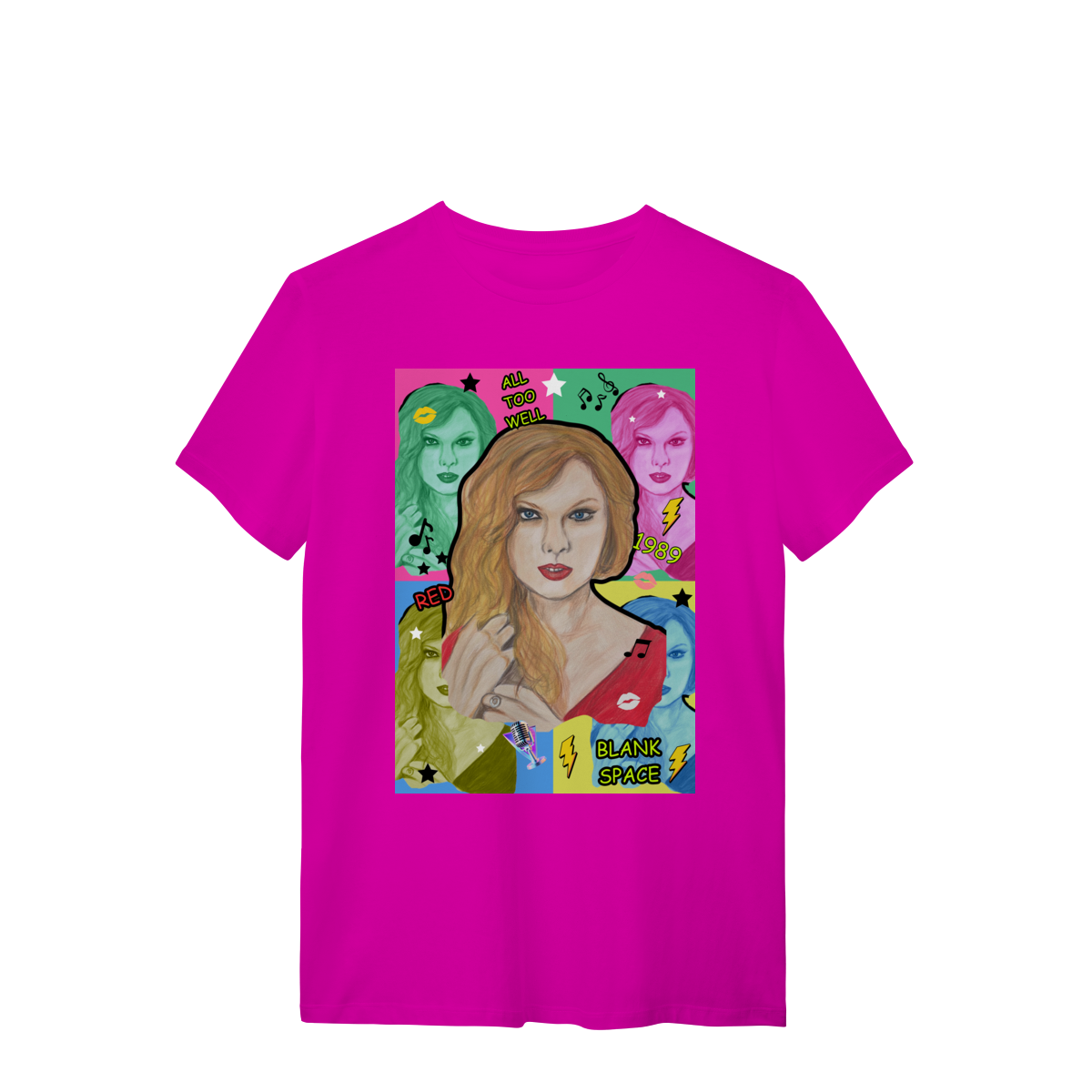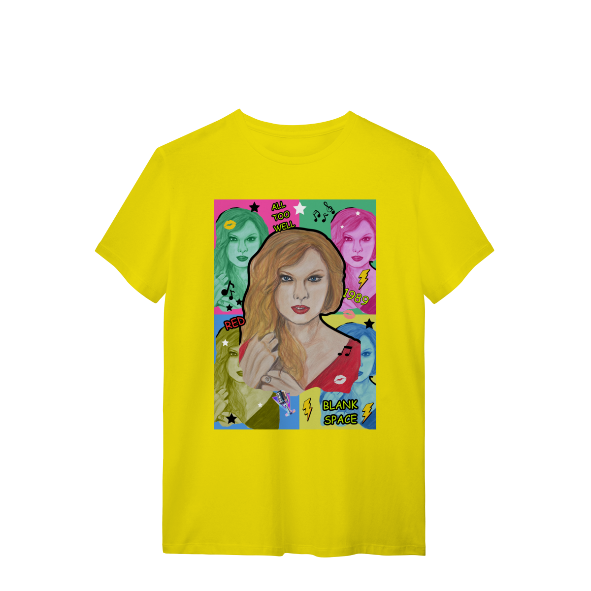 A T-Shirt Quality Swift Pop Collage traz uma arte exclusiva em estilo pop art, celebrando diferentes eras e sucessos de Taylor Swift. O retrato principal, feito à mão, é combinado com versões coloridas da cantora, ícones musicais e referências a faixas como All Too Well, Red, 1989 e Blank Space.