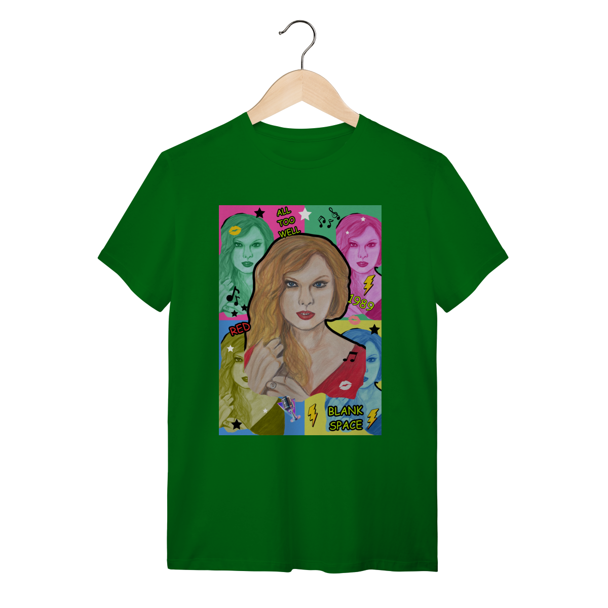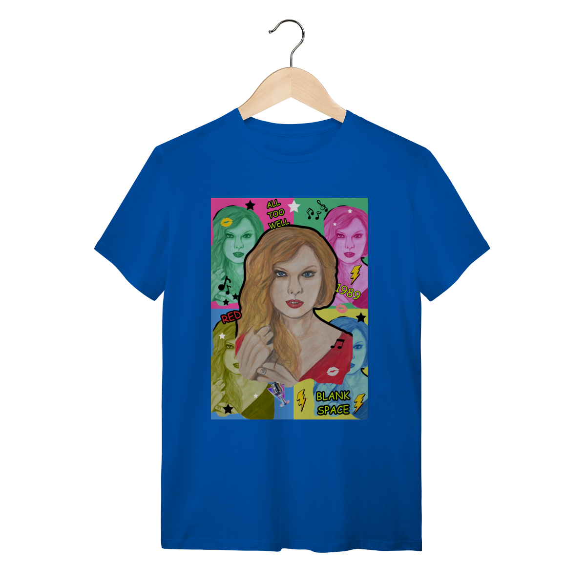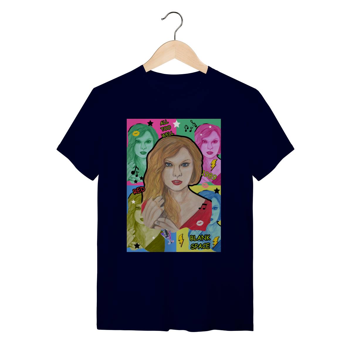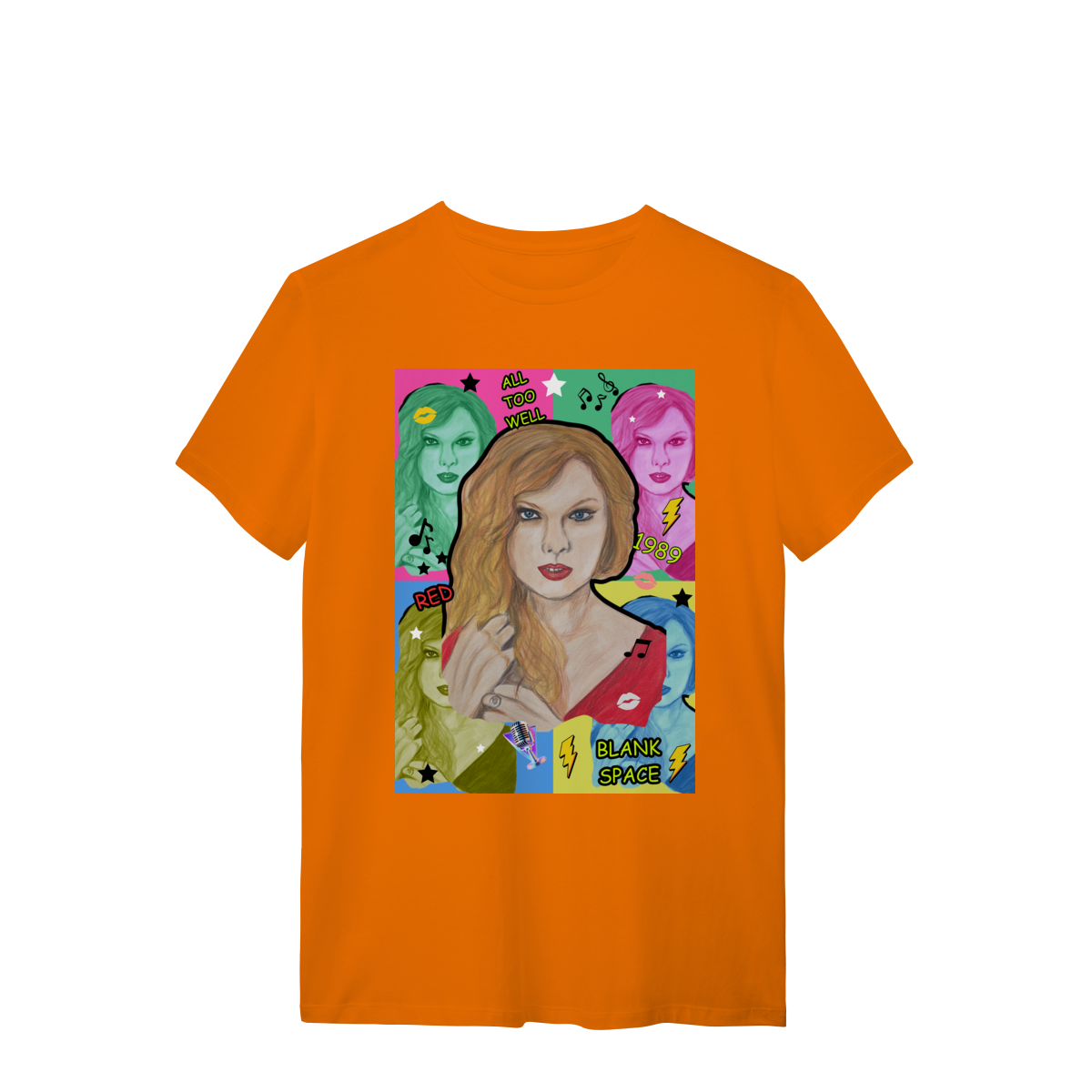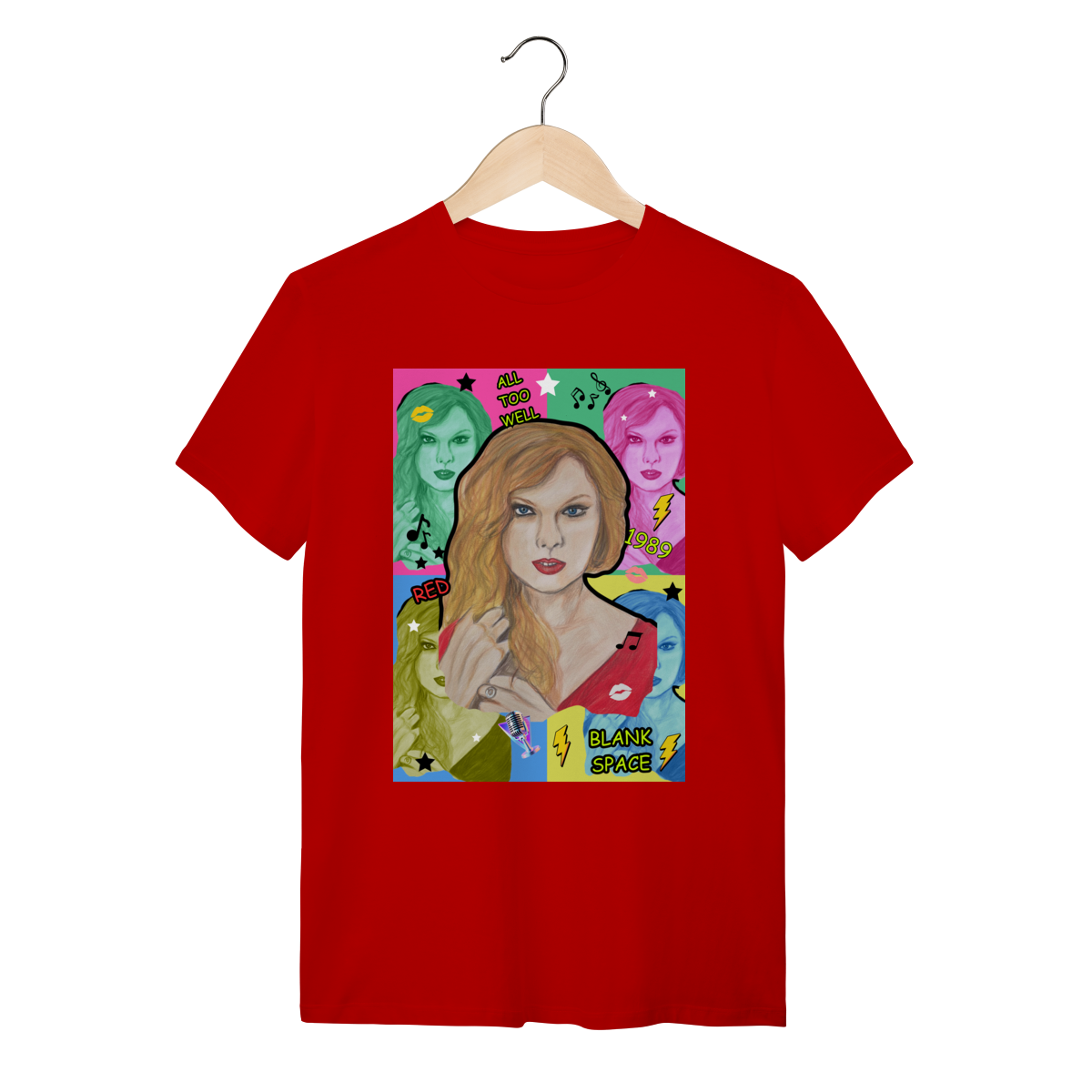 A T-Shirt Quality Swift Pop Collage traz uma arte exclusiva em estilo pop art, celebrando diferentes eras e sucessos de Taylor Swift. O retrato principal, feito à mão, é combinado com versões coloridas da cantora, ícones musicais e referências a faixas como All Too Well, Red, 1989 e Blank Space.