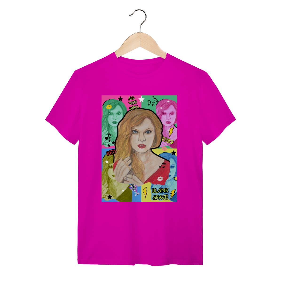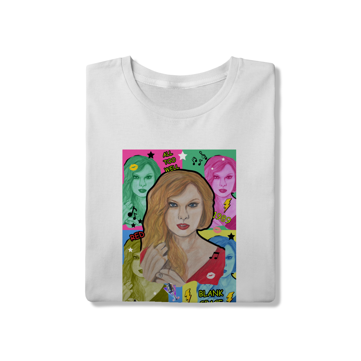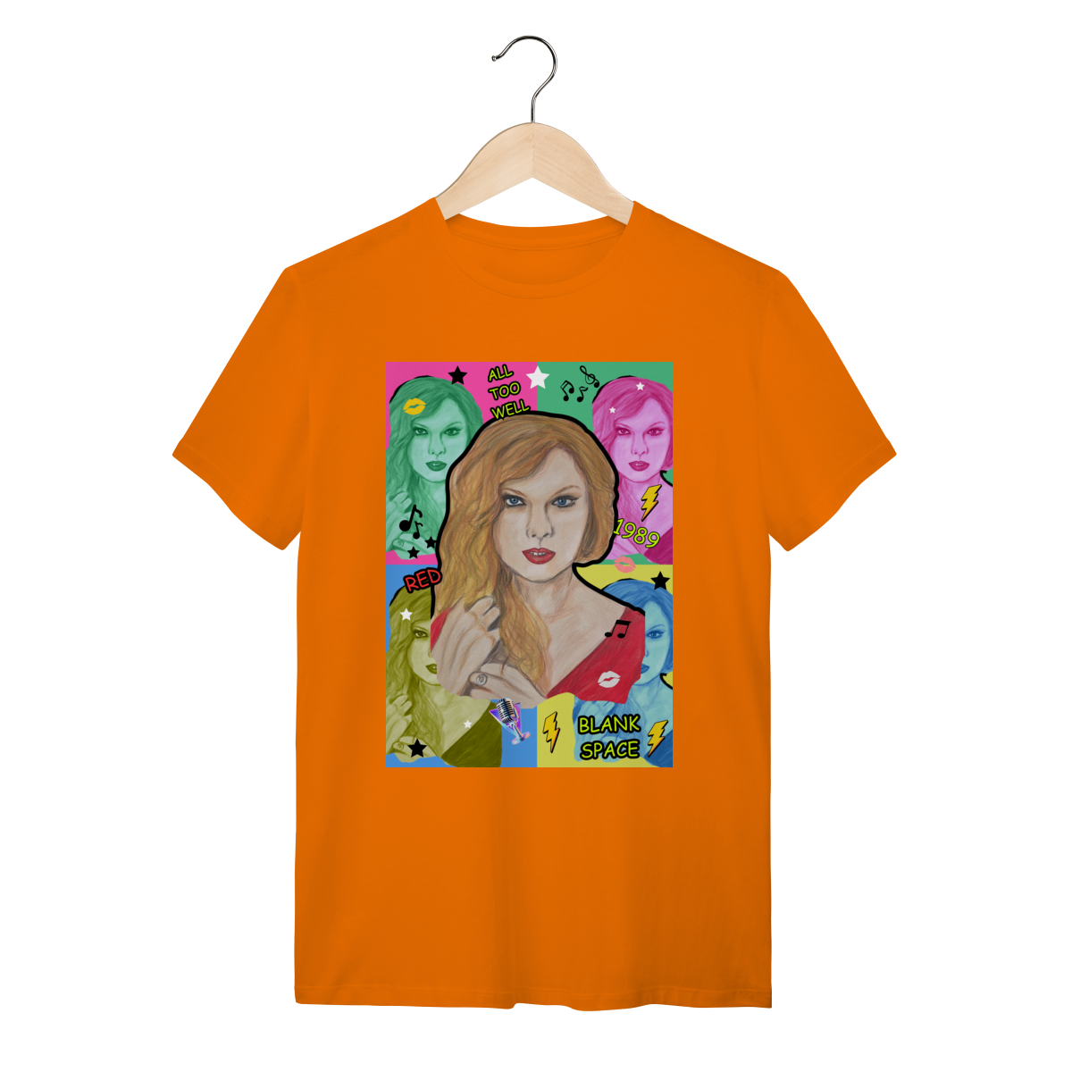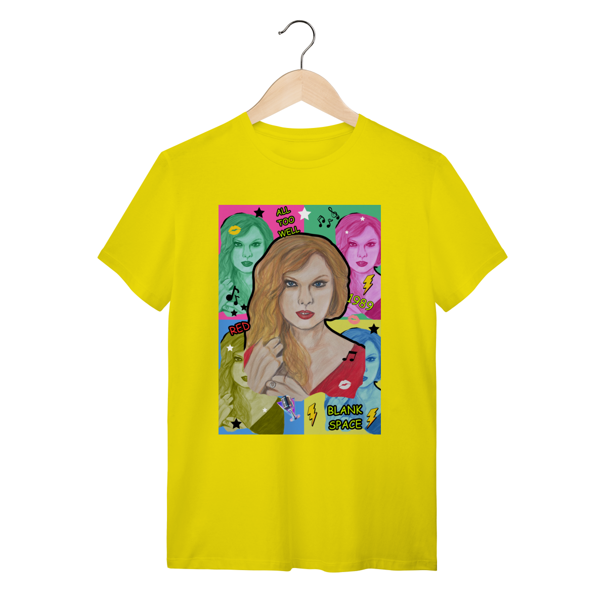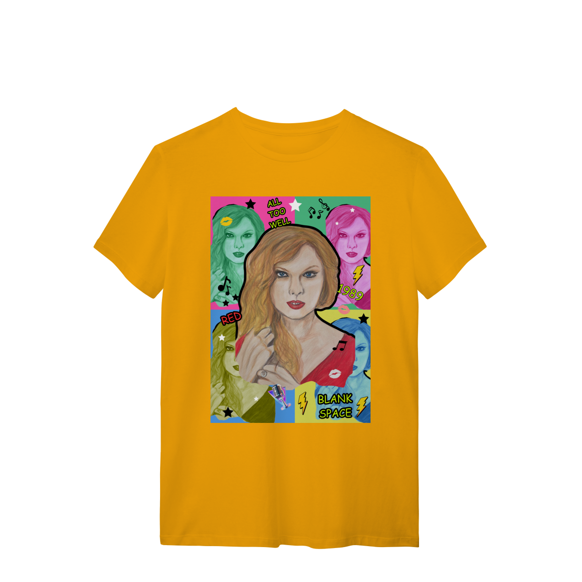A T-Shirt Quality Swift Pop Collage traz uma arte exclusiva em estilo pop art, celebrando diferentes eras e sucessos de Taylor Swift. O retrato principal, feito à mão, é combinado com versões coloridas da cantora, ícones musicais e referências a faixas como All Too Well, Red, 1989 e Blank Space.