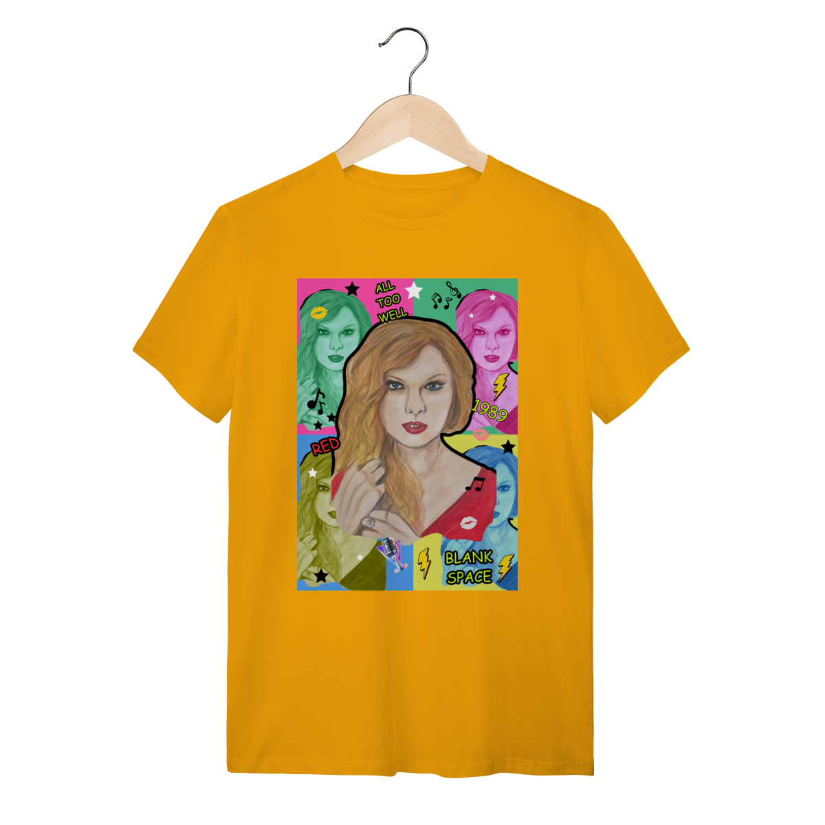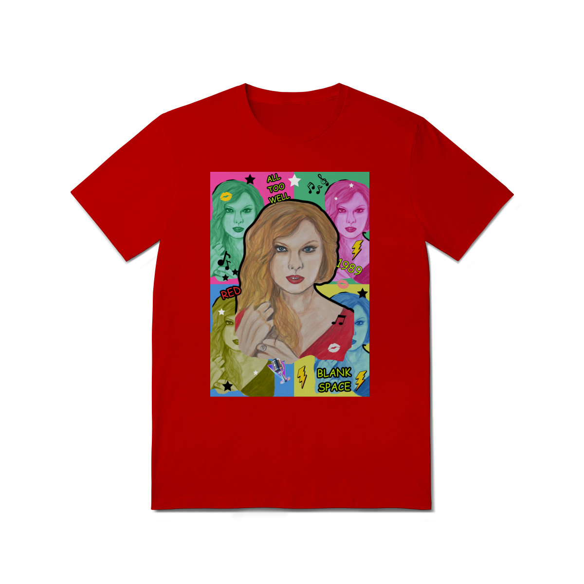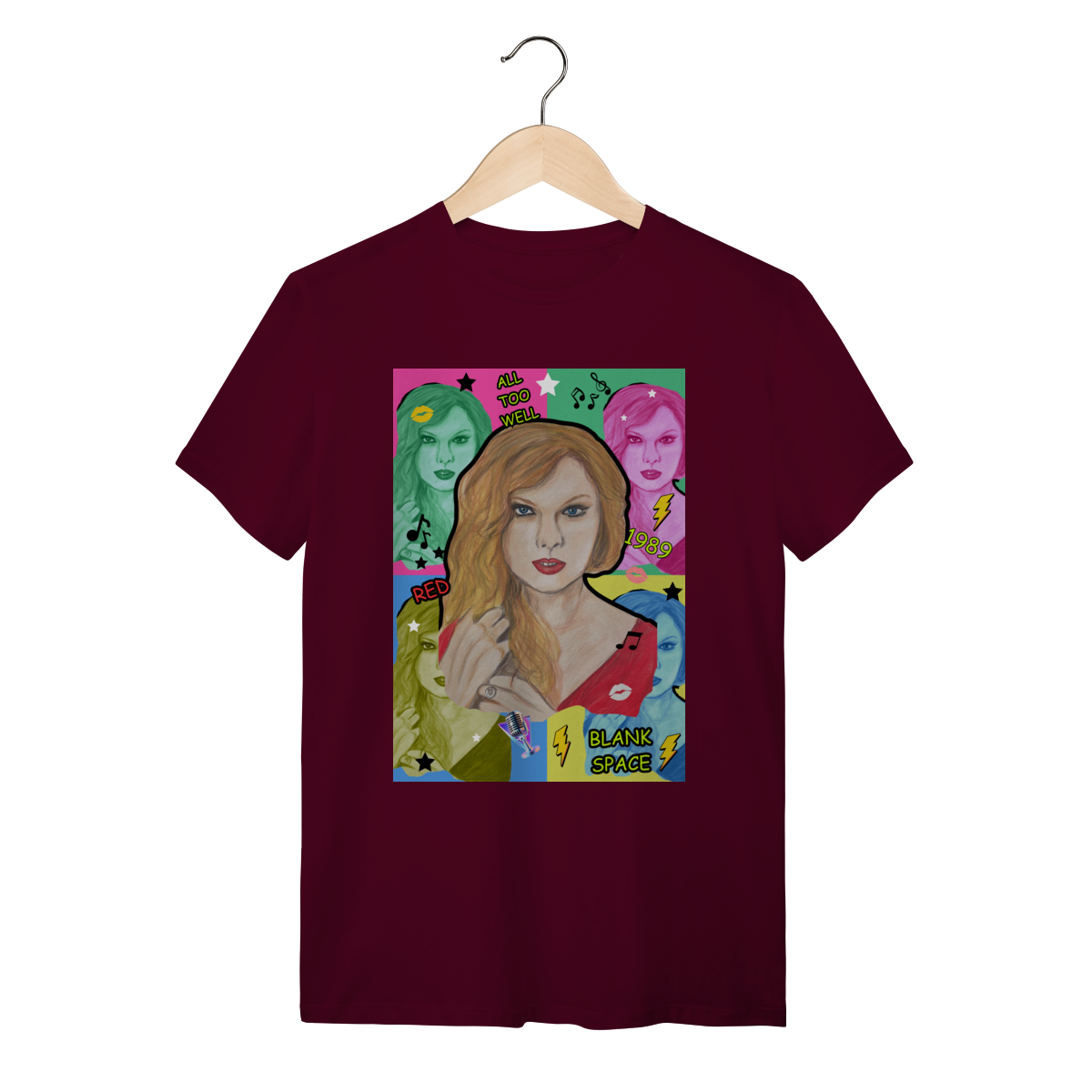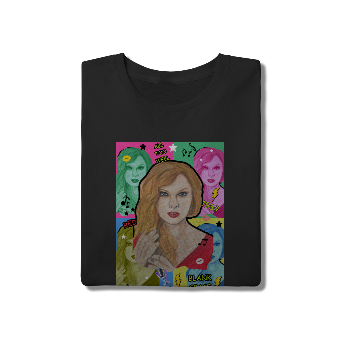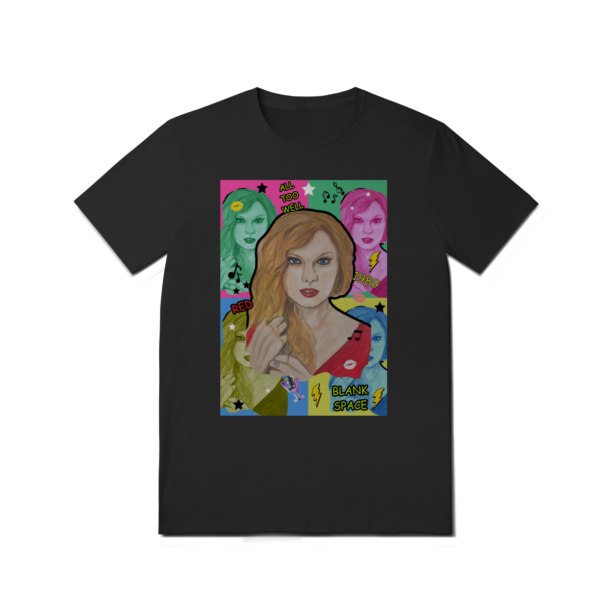 A T-Shirt Quality Swift Pop Collage traz uma arte exclusiva em estilo pop art, celebrando diferentes eras e sucessos de Taylor Swift. O retrato principal, feito à mão, é combinado com versões coloridas da cantora, ícones musicais e referências a faixas como All Too Well, Red, 1989 e Blank Space.